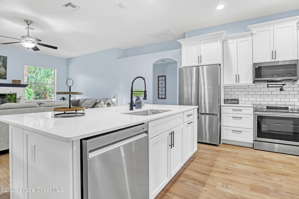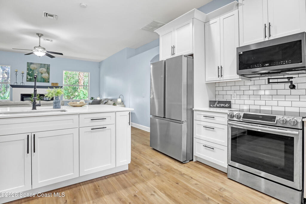 Welcome to an exceptional opportunity in the gated enclave of Sanctuary II Meticulously updated single-family home that blends comfort, style and peace of mind. 2025 roof: brand new, bringing long-term peace of mind. New A/C system: installed recently, ensuring comfortable climate control. Kitchen = show-stopper: all plywood cabinets, quartz countertops, breakfast bar with bay window. Dual living spaces: includes a formal dining area plus a second living/family room off the kitchen with a charming gas fireplace. Great flexibility for office/play/entertaining. Reclaimed water system: supports landscaping, helping maintain a green yard year-round. The generous master suite provides a retreat: porch access, deep soaking tub, and premium closet space. Positioned within a quiet, gated community offering privacy and low traffic--great for families or professionals seeking retreat-style living.