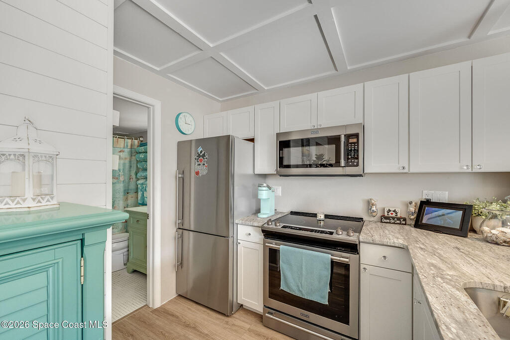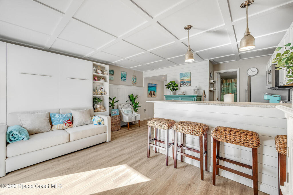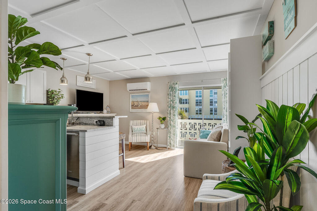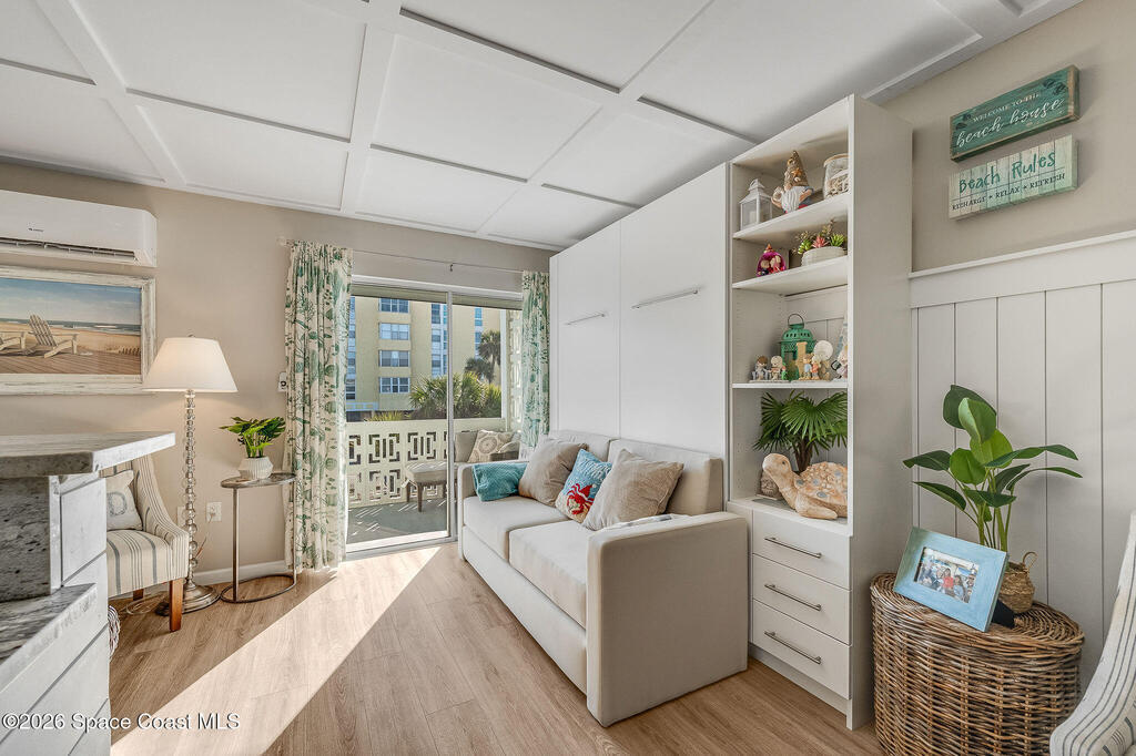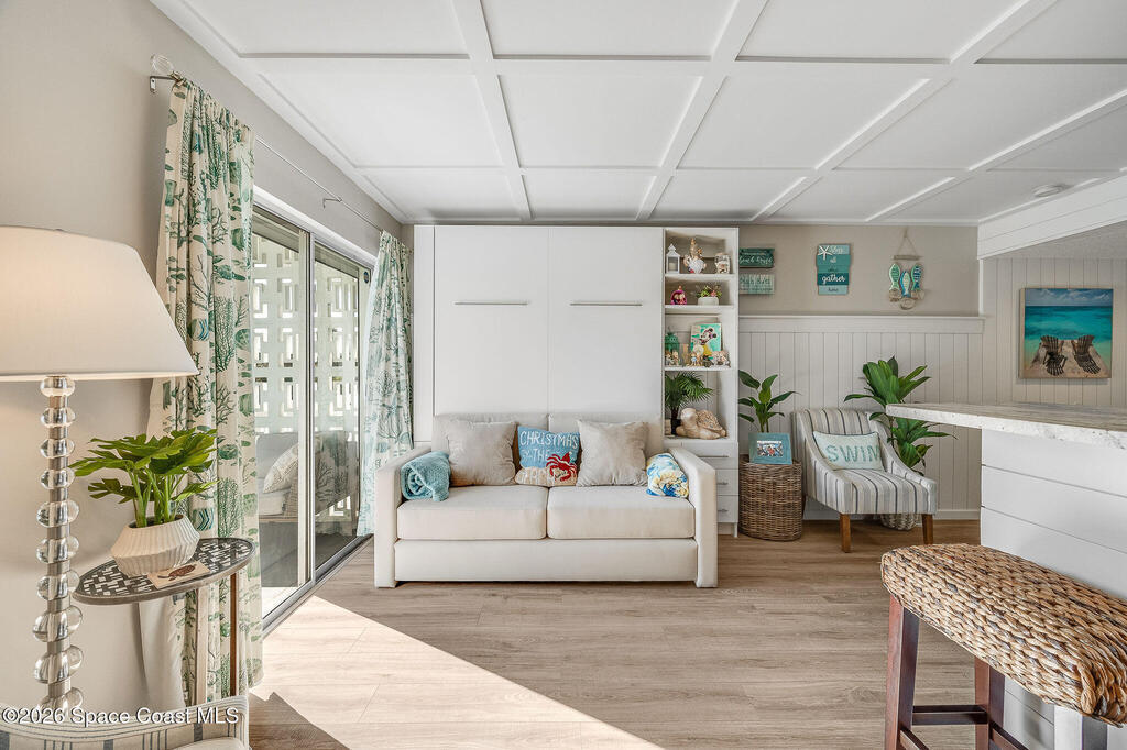 Wake up to ocean views, the sound of waves, and a studio that lives far larger than its footprint. This professionally designed and recently remodeled ocean-view residence showcases high-end finishes and exceptional space planning throughout. A custom built-in Murphy bed allows the studio to effortlessly transform from a stylish living space to a comfortable sleeping retreat, maximizing every square inch with intention. From ship lap accents and a striking ceiling design to custom doors, granite counter tops, beautifully finished kitchen and bath cabinetry, updated flooring, and new remote storm shutter, no detail was overlooked. Offered fully furnished with exquisite pieces, the design feels elevated, functional, and refined. Step onto your balcony to take in views of the Atlantic, watch shore birds pass by, and soak in the coastal breeze. Close to shopping and restaurants, Orlando Airport, and Port Canaveral, this is the perfect unit to explore all that Cocoa Beach has to offer