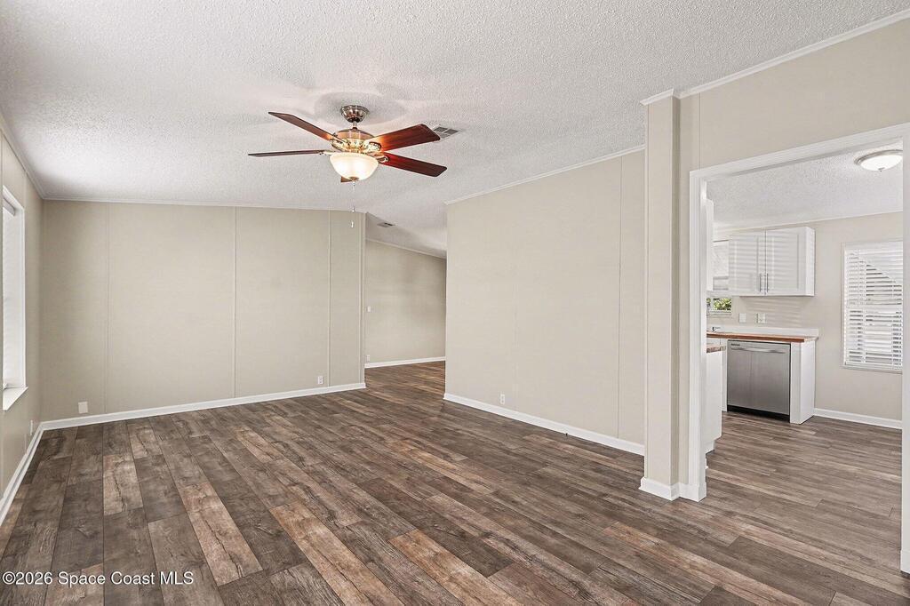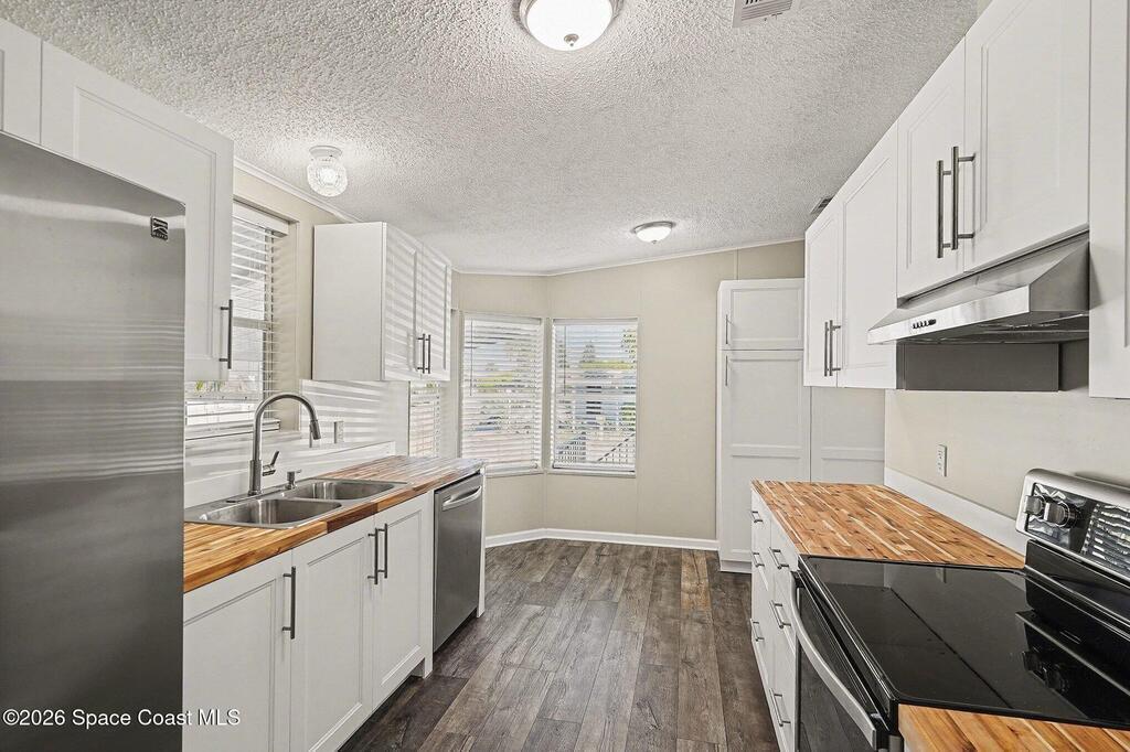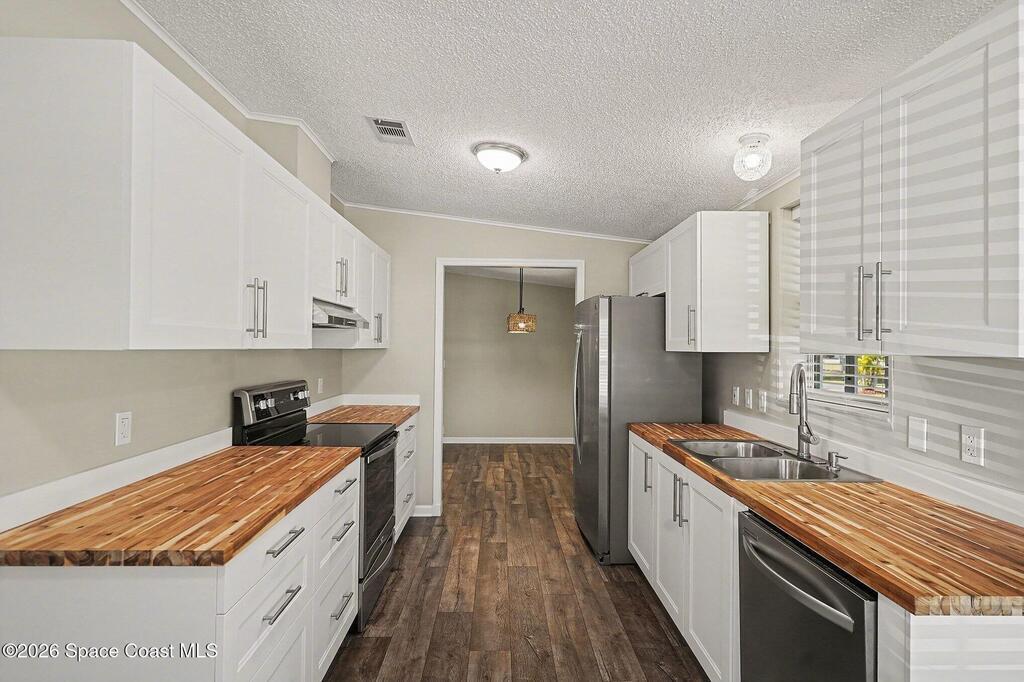 Enjoy low-maintenance Florida living in gated, 55+ Holiday Park--where you own the land. This beautifully updated 2-bedroom, 2-bath home features a complete 2025 renovation with extended bedroom closets, all new flooring, fresh interior finishes, and a brand-new kitchen with soft-close cabinetry, butcher block countertops, and a higher end appliance package. Major system upgrades include all new plumbing, new screening, full hurricane protection, a 2018 water heater, and a 2021 HVAC system. The layout offers a welcoming sunroom, spacious living area, indoor laundry, and a comfortable primary suite with en-suite bath. Situated on a desirable corner lot, the homesite feels exceptionally large and open. Community fees include lawn care, internet/cable, gated security, and access to pools, activities, and amenities, all conveniently located near shopping, dining, and medical facilities.
