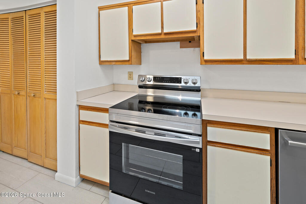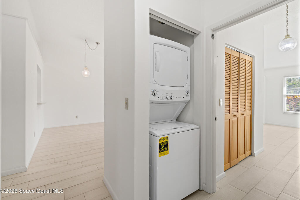 Dishwasher, Electric Range, Refrigerator, Washer/Dryer Stacked