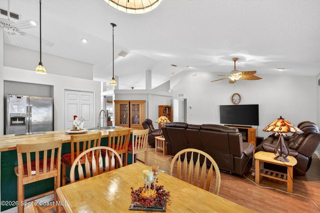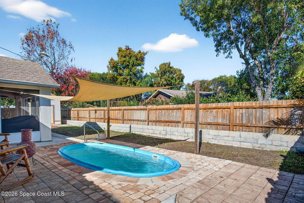 PRICE IMPROVEMENT! A well-maintained Rockledge home, perfectly located close to everything! This solid CBS block home offers 3 full bedrooms PLUS a DEN/OFFICE with a built-in Murphy bed ideal for guests or a home workspace. The kitchen features a large island with seating, butcher block countertops, solid wood cabinetry, and stainless steel appliances, perfect for quick breakfasts before the beach. The split floor plan provides privacy, with a spacious primary suite offering a walk-in closet and ensuite bath with fully tiled walk-in shower, dual sinks, and built-in vanity. A full guest bath includes a shower/tub combo. Step outside to the screened patio and backyard oasis with a low maintenance private pool, fully fenced yard, dog run, and large storage shed. ROOF IS 2020; HVAC 2022. Located in quaint St. Michel Village, an established neighborhood of under 100 homes. Minutes to I-95, US-1, Publix, ALDI, Starbucks, beaches, and Patrick Space Force Base. Schedule your showings!
