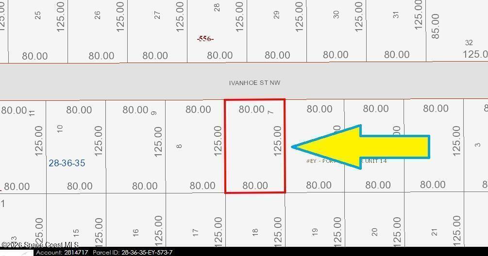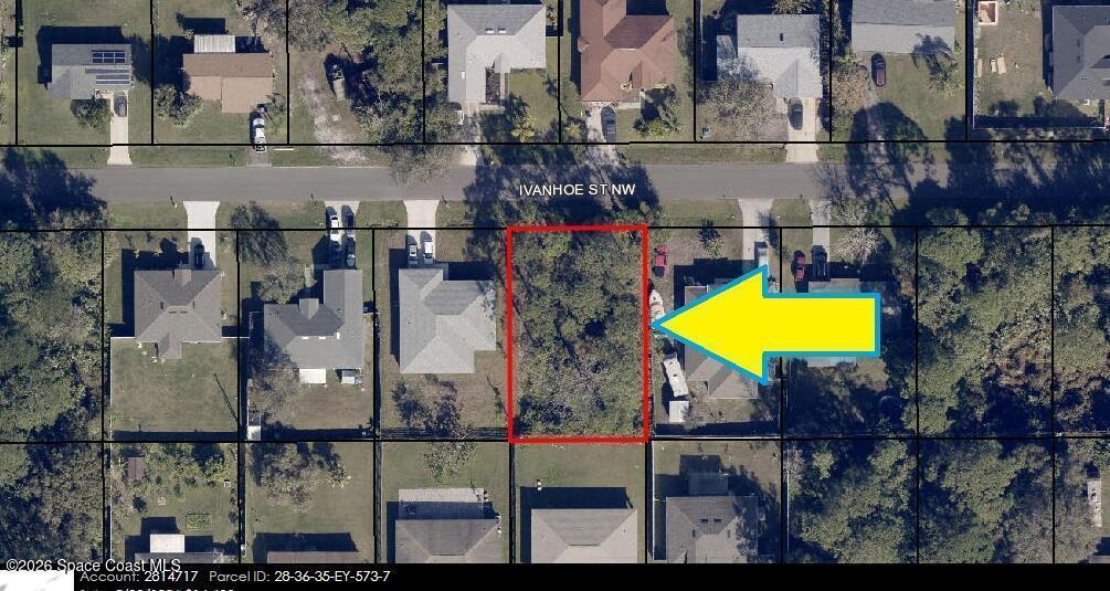 The 0.23 acre single family residential build-able lot (Rs2 Zoning) is available in Port Malabar Unit #14 of Palm Bay. Conveniently located in the northwest section, this lot is just 2.6 miles - 7 minutes to the Winn-Dixie Shopping Market, 2.7 miles - 7 mintues to McAuliffe Elementary School, 10.3 miles - 21 minutes to Melbourne International Airport, and 12.9 miles - 24 minutes to the beaches of Indialantic. From exit #176 of I-95 go west on Palm Bay Rd. for .7 miles, left on Minton Rd. for .2 miles, right on Emerson Drive NW for 1.5 miles, Left on Jupiter Blvd. NW for 1.5 miles, and right on Ivanhoe Street NW. The property will be on your left.