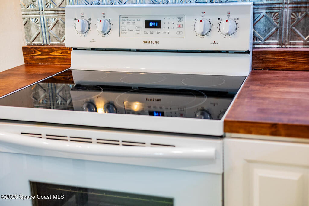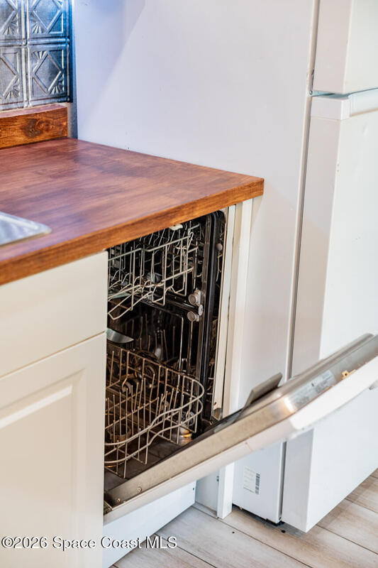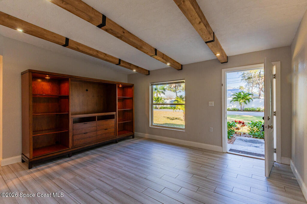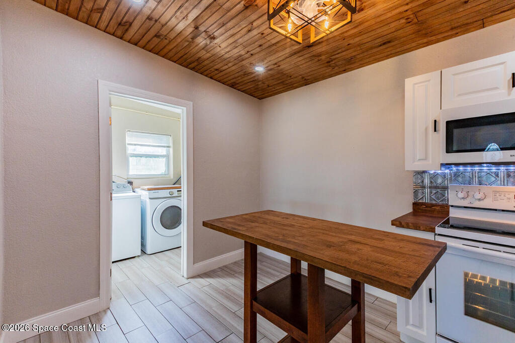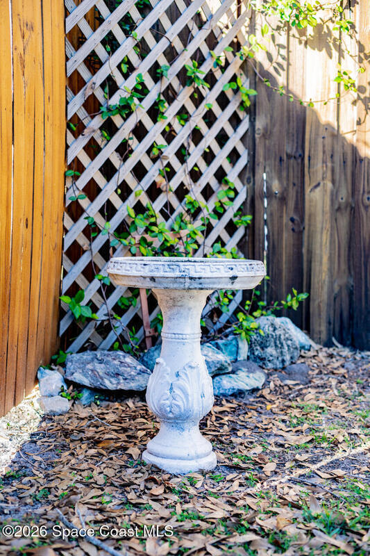 UTILITIES AND YARD MAINTENANCE INCLUDED! JUST REDUCED! Tesla/EV charging station available. Live under the oaks in one of Melbourne's best-kept secret neighborhoods! This island vibe home has 3 bedrooms and is not your typical generic rental. Bursting with character, the living area showcases rustic beam ceilings and wood-look tile floors for a warm, inviting vibe. The on-trend, updated kitchen features a beadboard ceiling, tin-look backsplash, under-cabinet lighting, glass-top stove, dishwasher, wood countertops, and a center island perfect for cooking and entertaining. Enjoy a split floorplan with a large primary bedroom highlighted by a dramatic wood-look accent wall, plus new wood laminate in all bedrooms. The spacious indoor laundry room includes washing machine and new dryer. Step outside to your own private oasis: a fully fenced side yard, lush landscaping, and sweeping oak trees draped in moss. Peaceful, PRIVATE, picturesque--and truly one-of-a-kind.