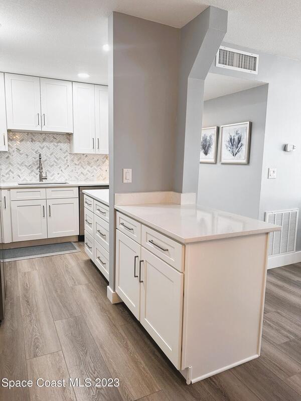 Absolutely STUNNING remodel only 4 miles to the beach, that's 6 minutes! A very open floor plan. White shaker cabinetry, white quartz counters and stainless appliances. Luxury vinyl plank throughout. New doors and trim. Endless windows for natural lighting. Deeded Carport close to entrance. Maintenance Free Living in a beautifully kept Banana River community. A carrying charge covers A/C unit , water heater, water/sewer, trash AND property taxes. Heated pool runs year round. New Smart washer/dryers in laundry. Bball, playground, bike parking. Easy access to Orlando, Space Center, Indian River, Port Canaveral, CASH ONLY, NO AIRBNB, NO RENTALS.