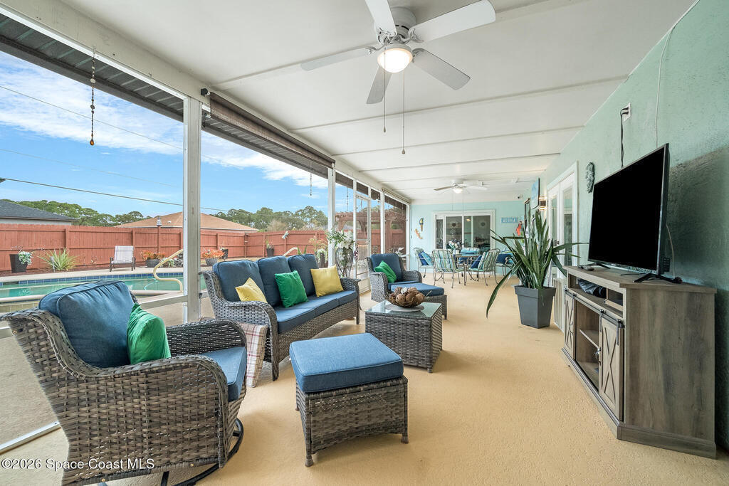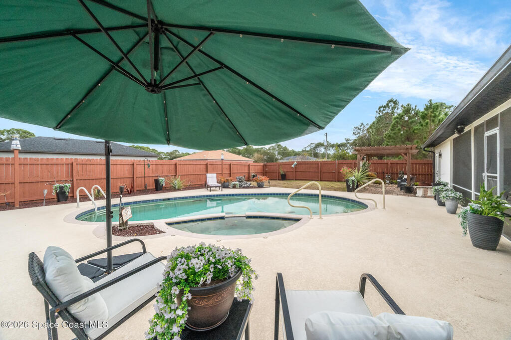 Well-maintained 3-bedroom, 2-bath pool home offering comfort, efficiency, and Florida lifestyle living. The roof was replaced in March 2018, and major upgrades include a 15.33 kW solar system (paid off) installed January 2023 and a Generac whole house gas generator added April 2023 for peace of mind. Inside, enjoy tile and laminate flooring throughout, updated AC ductwork, and textured ceilings--no popcorn. Step outside to a fully fenced backyard with a sparkling pool with Pebble Tech finish and heated hot tub, perfect for entertaining or relaxing year-round. Conveniently located close to beautiful beaches and just about 75 minutes from Orlando attractions. Don't miss this opportunity--schedule your private showing today!