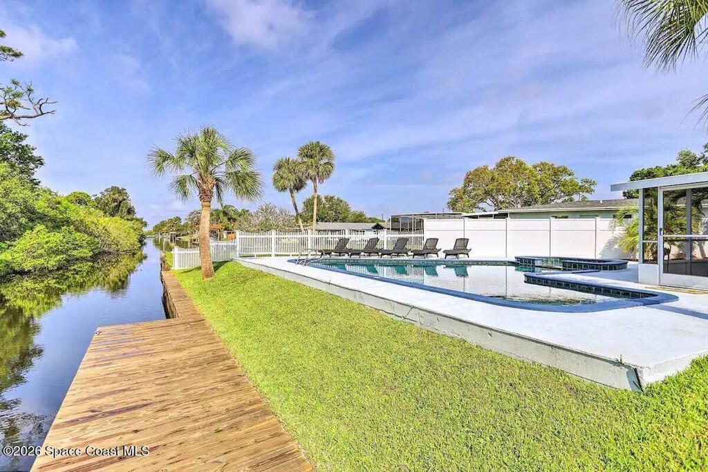Beautiful canal-front home located in desirable Surfside Estates featuring open-concept living perfect for everyday comfort and entertaining. The kitchen offers granite countertops, a stylish backsplash, and a large island overlooking the main living space. Two bedrooms include private en suite bathrooms, ideal for guests or flexible living arrangements. Enjoy outdoor Florida living with a private dock for a small boat and a lower platform for easy kayak or paddleboard access. The backyard oasis includes a pool with heated spa and a spacious patio for relaxing or hosting. An oversized one-car garage provides ample storage. Additional highlights include a new roof in 2020 and a convenient location near Blue Origin, NASA, and other space industry employers, with easy access to Orlando and its world-class attractions. This canal-front retreat is a rare opportunity not to be missed!