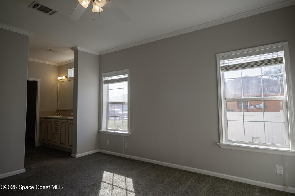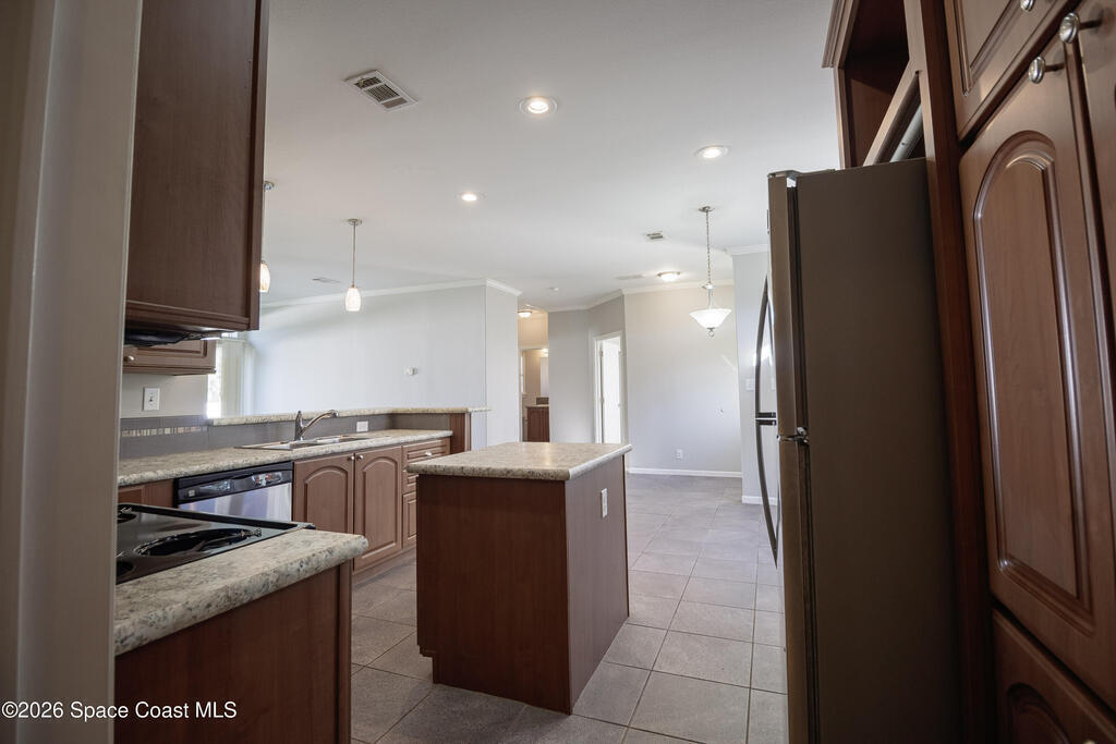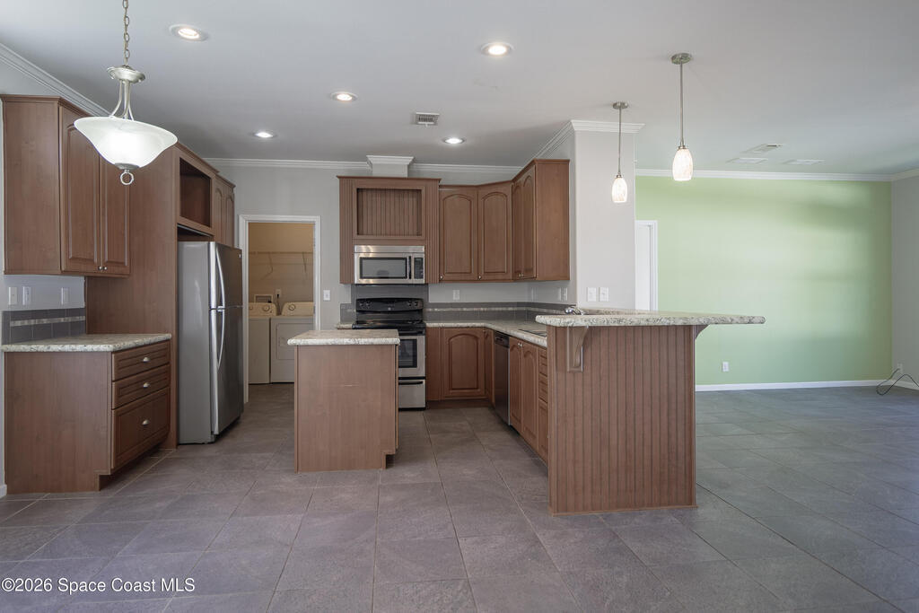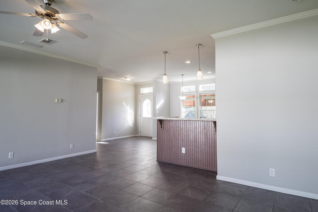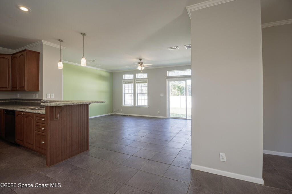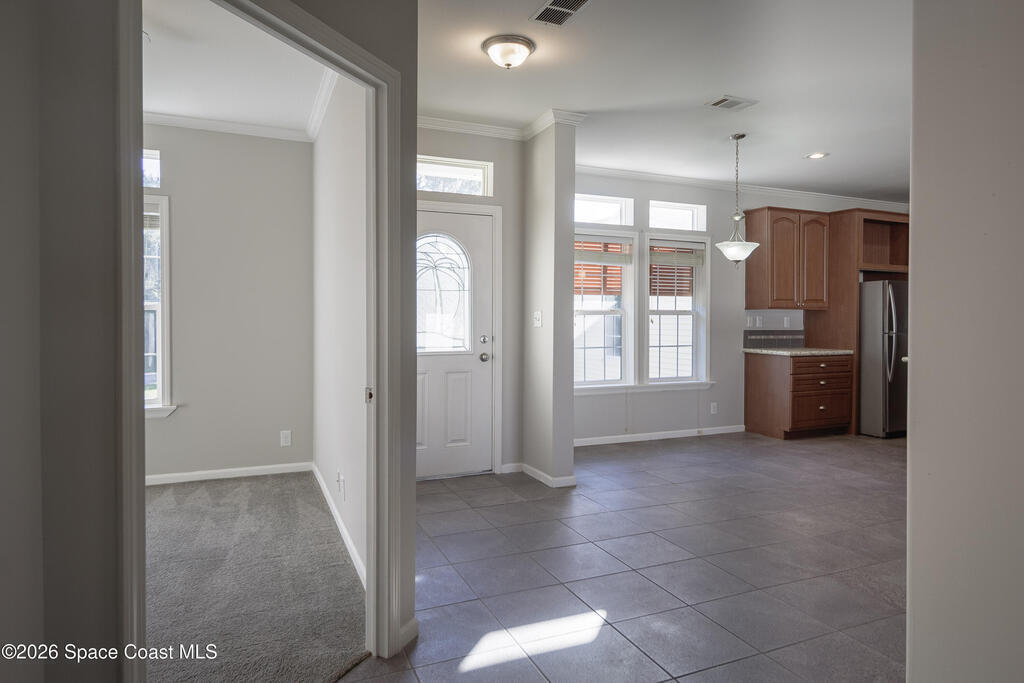 Beautiful 3 bedroom, 2 bathroom home for sale in Palm Bay. Don't miss the opportunity to own this well maintained, 10 year old home. Split layout with primary bedroom suite including new carpet, walk in closet, double vanity bathroom with shower. Two additional nice size bedrooms with ceiling fans and new carpet. The family bathroom has a tub/shower combination. Living room features a ceiling fan and crown molding. Nice size kitchen with lots of cabinets, stainless appliances, center island, breakfast bar adjacent to the dining room. Dining room walks out through the sliding glass doors to the rear patio. Two car garage and interior laundry that includes a washer and dryer. Ready to move in!