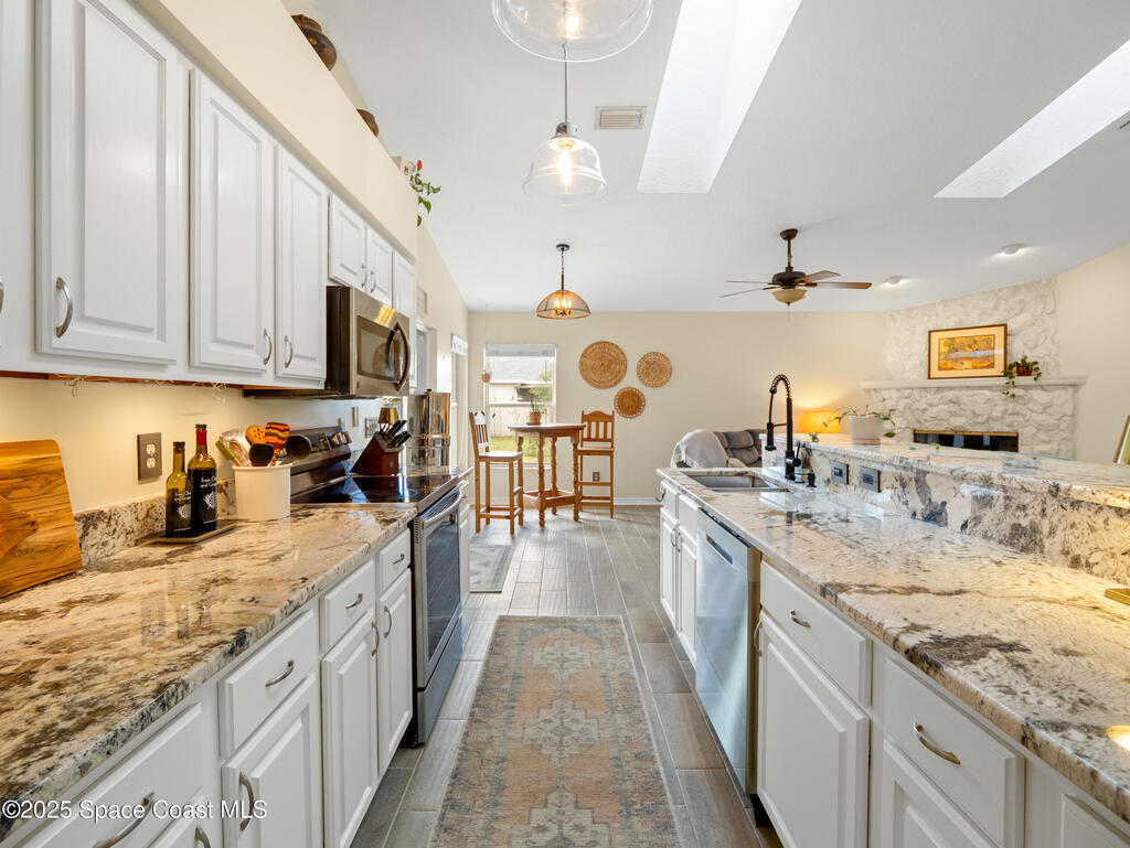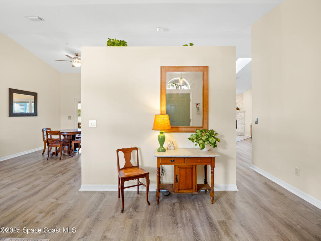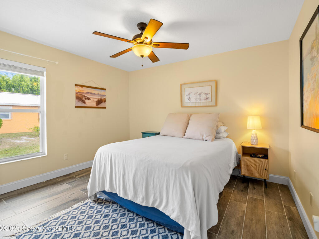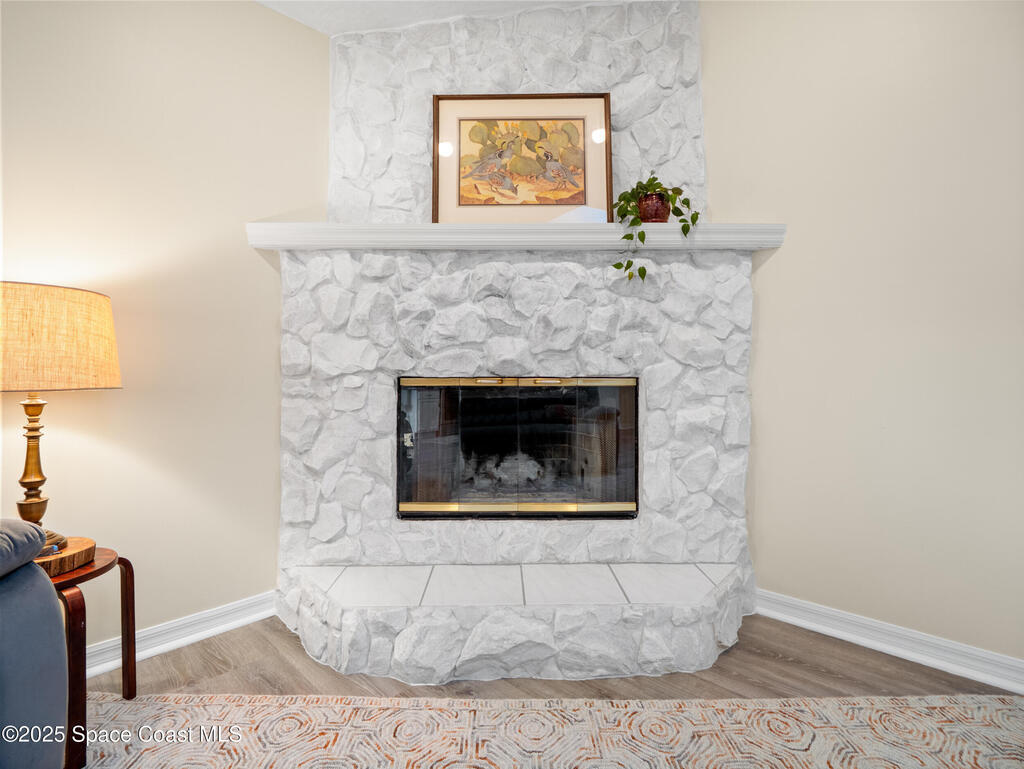PRIDE OF OWNERSHIP in this well-maintained West Melbourne CBS block home on an extended 0.37-acre fully fenced lot. Lush Florida native landscaping offers beauty and room to grow. This home features 3 bedrooms and two living spaces, one with a wood-burning fireplace. The kitchen offers quartz countertops, bar seating, solid wood cabinetry, and stainless steel appliances. Desirable split floor plan with a spacious primary suite including a walk-in closet. Escape the day with your ensuite bath with dual sinks, fully tiled walk-in shower, and separate soaking tub. Weatherproof vinyl flooring throughout--NO carpet. Enjoy morning coffee on the screened-in porch. ROOF 2023; HVAC 2024. Conveniently located just 5 minutes to Hammock Landing and I-95, 15 minutes to area beaches, and 25 minutes to Patrick Space Force Base. Schedule your showing today!