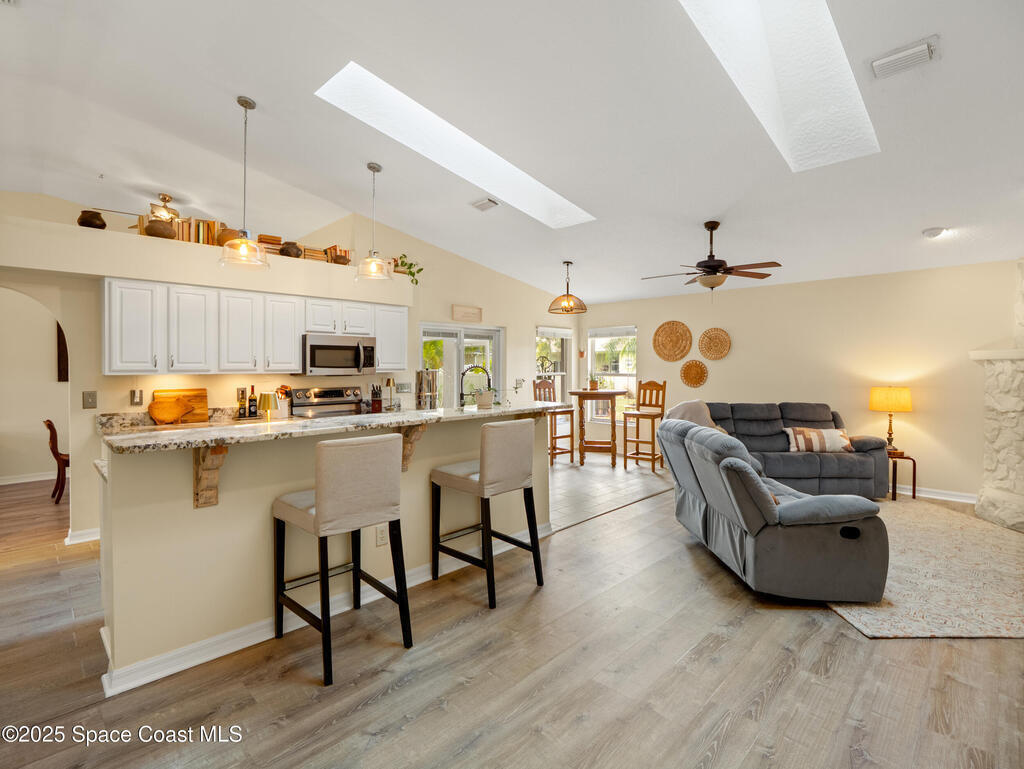 Breakfast Bar, Breakfast Nook, Ceiling Fan(s), Kitchen Island, Open Floorplan, Pantry, Primary Bathroom -Tub with Separate Shower, Primary Downstairs, Skylight(s), Split Bedrooms, Vaulted Ceiling(s), Walk-In Closet(s)