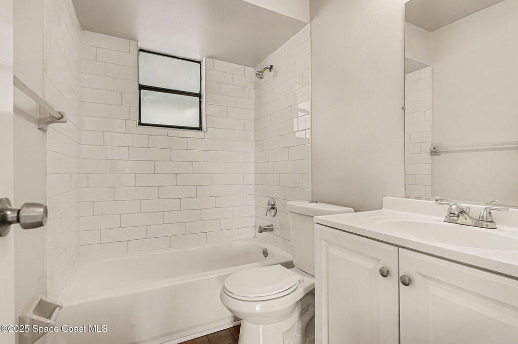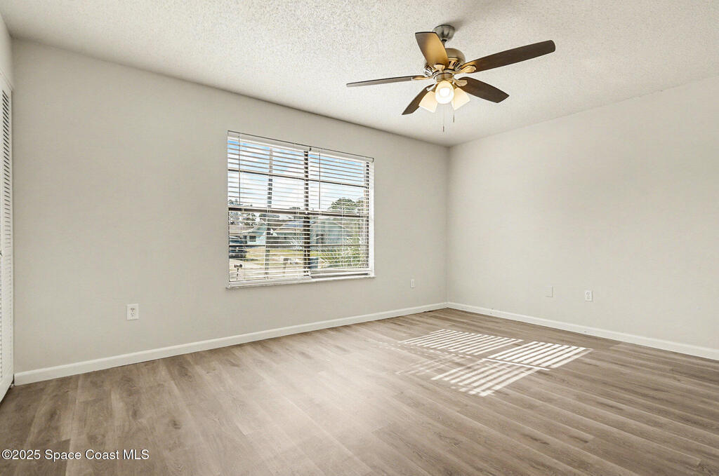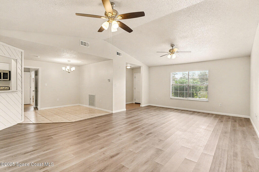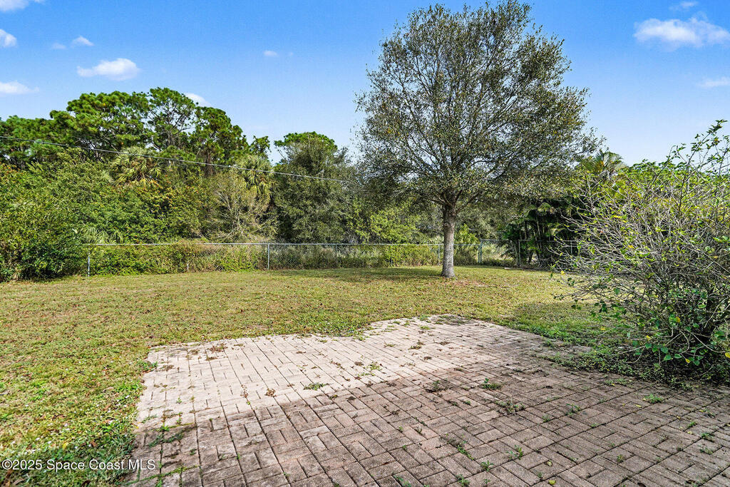 Welcome to this beautifully finished home in desirable NW Palm Bay, offering privacy, style, and a thoughtful layout. The kitchen shines with white shaker cabinets, quartz countertops, stainless steel range, dishwasher, and microwave, all overlooking a bright breakfast nook with peaceful backyard views. Vinyl plank flooring runs throughout the main living areas for a clean, modern feel. The split bedroom plan provides ideal privacy for both homeowners and guests. The primary suite features double-door entry, a spacious en-suite with dual sink vanity, a tiled walk-in shower with glass door, and a generous walk-in closet. Step outside to a screened lanai and extended patio, perfect for relaxing or entertaining. The fully fenced backyard backs to acreage along Hield Rd, creating a rare sense of seclusion with no direct rear neighbors.