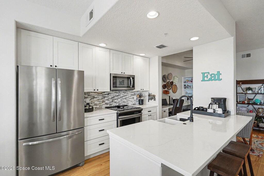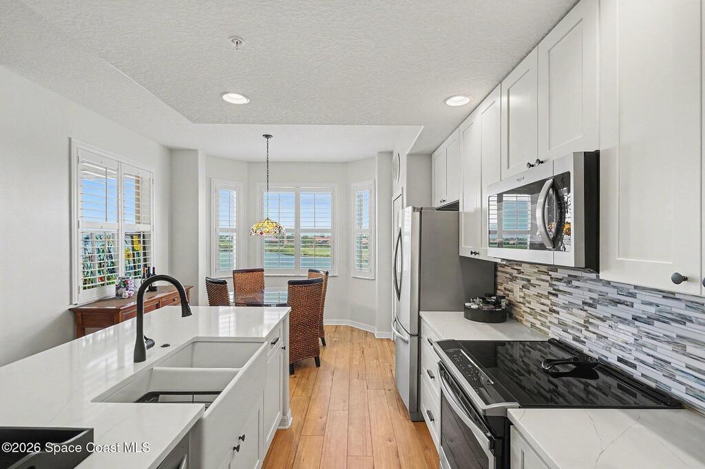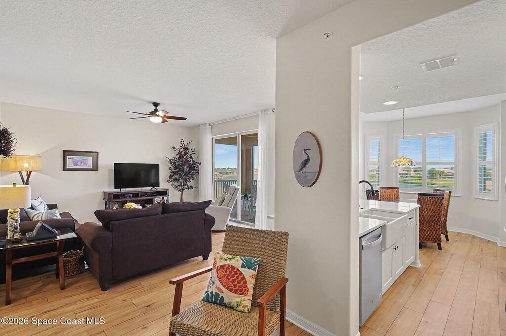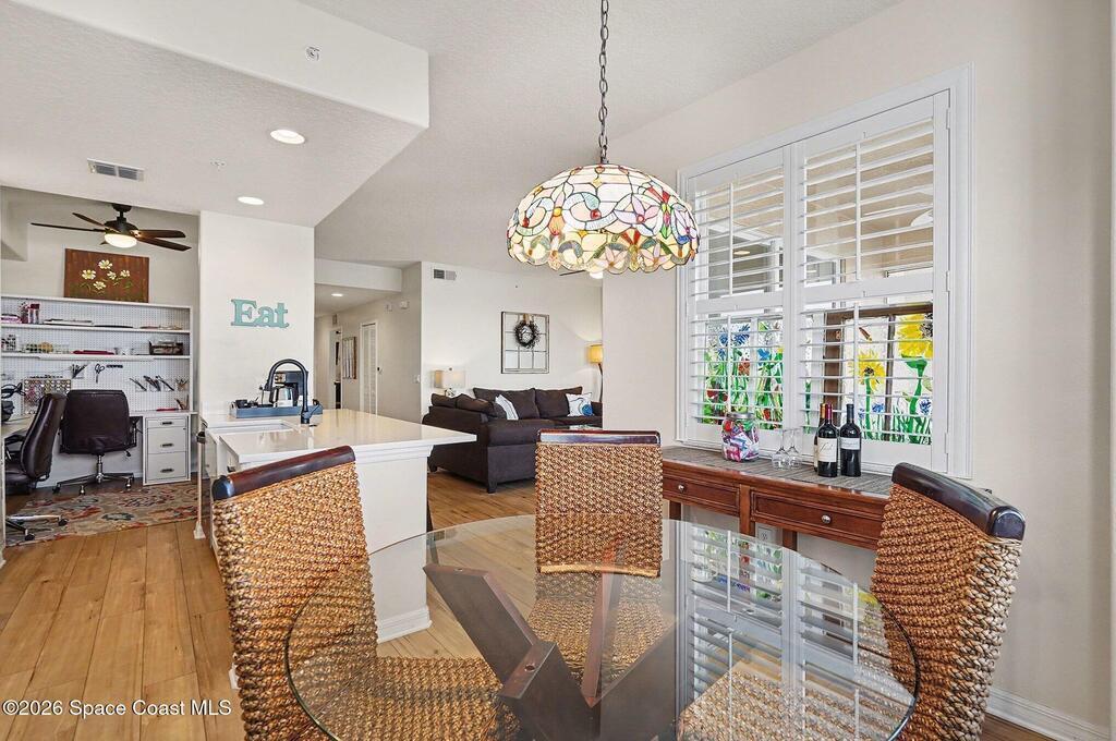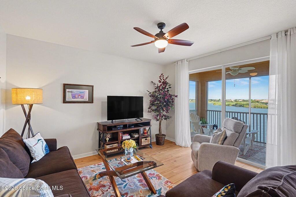 Sensational, freshly painted and meticulously maintained 2 bedroom, 2bath condo with beautiful, new luxury plank flooring, plantation shutters and stainless steel appliances complementing the quartz countertops, pull out drawers and overall kitchen design can be your sanctuary! Cozy breakfast nook overlooking the meandering waterway fed by theSt. Johns River and Duran Golf Course, the picturesque views will take your breath away! The separate dining room currently used as an office offers flexibility for your lifestyle. Awesome views from the screened lanai and living room are amazing. Spacious primary suite with walk in closets is a retreat of its own. Don't miss out on resort-style living in West Viera's most prestigious 55+ community! Overlook the 7th hole of Duran Golf Course Wildlife & meandering waterway views Rocket launches and more!Low-cost utilities, impact glass, covered parking, storage closet, spectrum TV, high speed internet, water and more included in HOA.