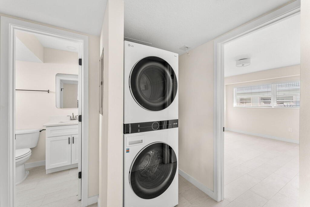 The wait is over, renovations are complete! Welcome to our exclusive beachside apartments, just 1, 000 feet from the beach. This 1-bed, 1-bath sanctuary underwent a full renovation in '24. Enjoy a stylish kitchen equipped with SS Whirlpool appliances & quartz countertops, a luxurious bathroom featuring a glass door shower and quartz vanity, and an LG stacked washer and dryer in-unit. Wood-look tile flooring throughout adds an elegant touch. With restaurants, breakfast spots, and shopping just steps away, coastal living has never been more convenient.