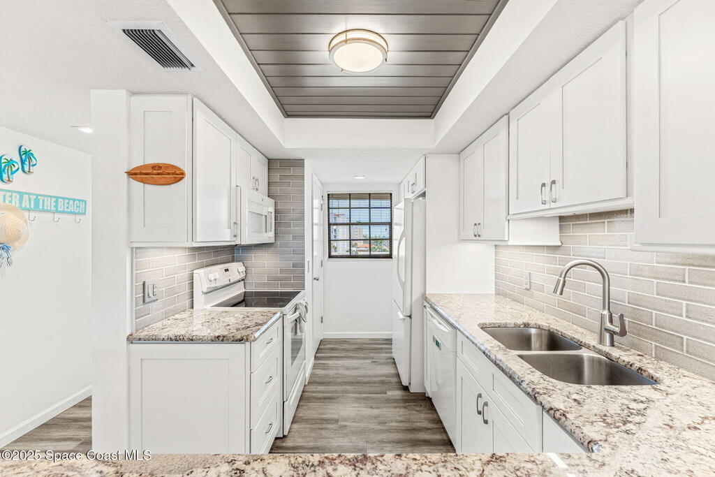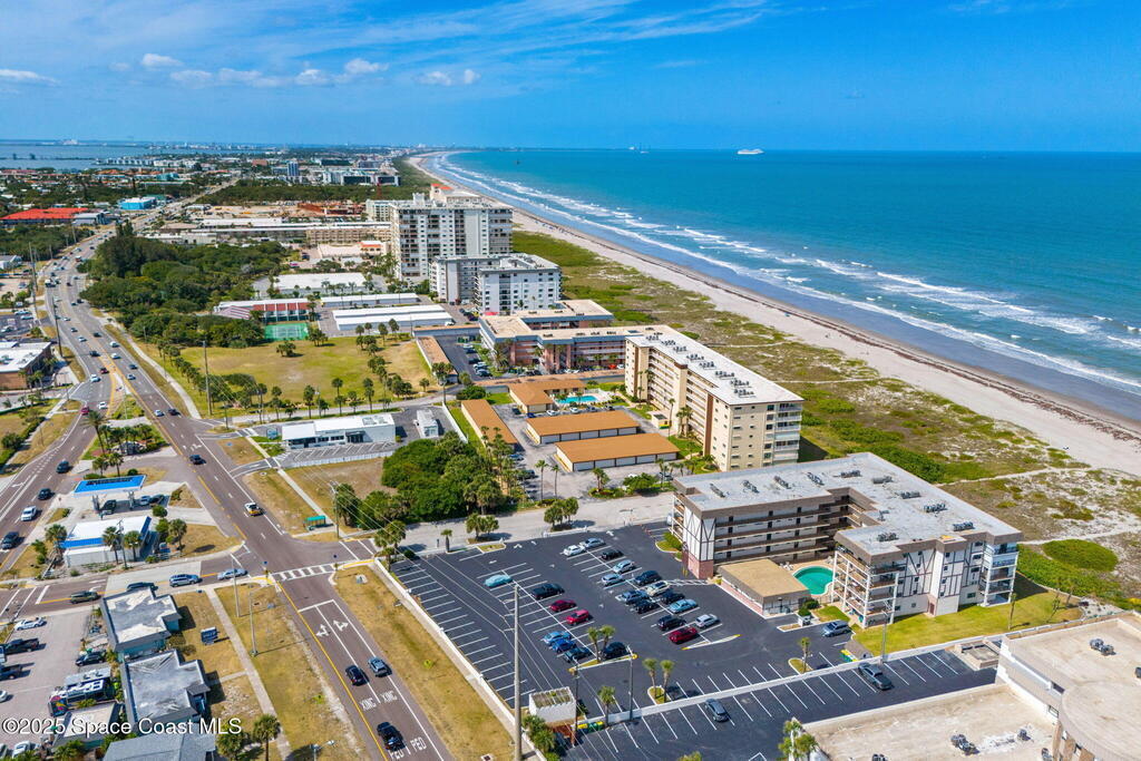 This renovated TOP FLOOR, NW CORNER UNIT offers OCEAN & RIVER VIEWS with a WRAP AROUND BALCONY! Top floor means no pesky view-obstructing structural components--just watching rocket-launches, sunshine, sea breezes & good vibes. An extra window at the corner provides plenty of natural light for that bright, beachy feel. Move right in--this furnished unit features vinyl flooring, a full copper rewire, and a 2018 kitchen remodel with white shaker, soft-close cabinetry, granite countertops and breakfast bar, and a pantry with rollout shelves. The in-unit laundry/utility room includes a newer large-capacity washer and dryer. Be storm ready with electric roll-down shutters on the sliders & corner window, and crank shutters for the front windows. Spend the day at the beach with convenient private access and finish the day with a refreshing dip in the ocean-view community pool, then walk downtown for dinner and cocktails. Recharge the next morning with a quick walk to breakfast at Whisk & Grind