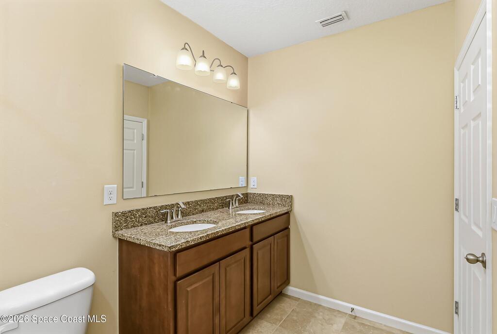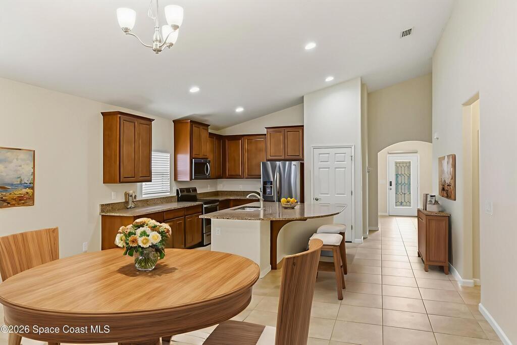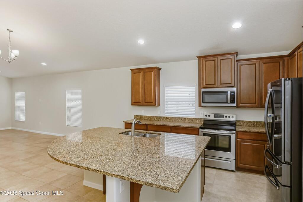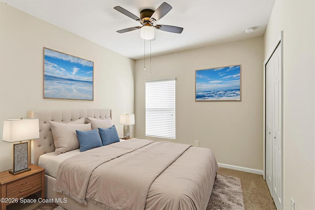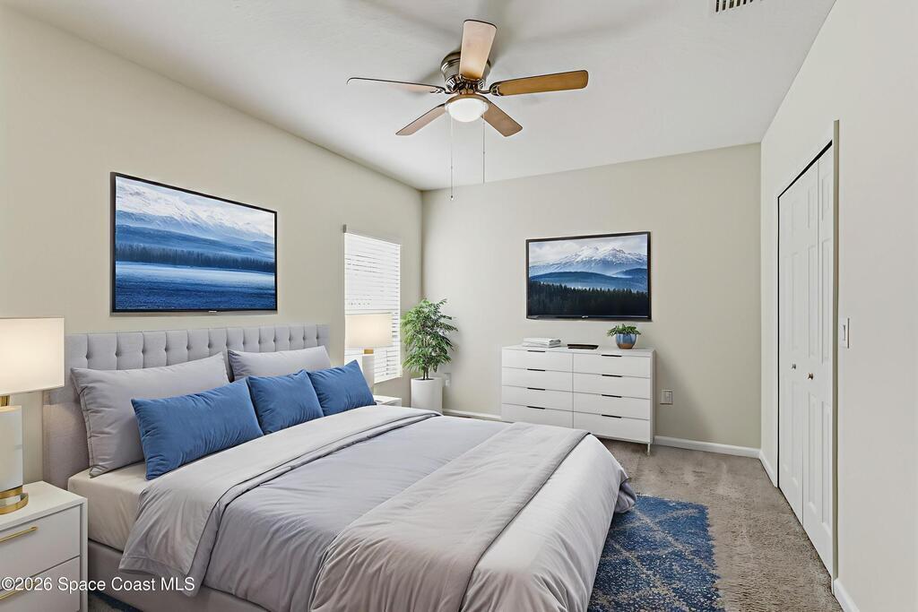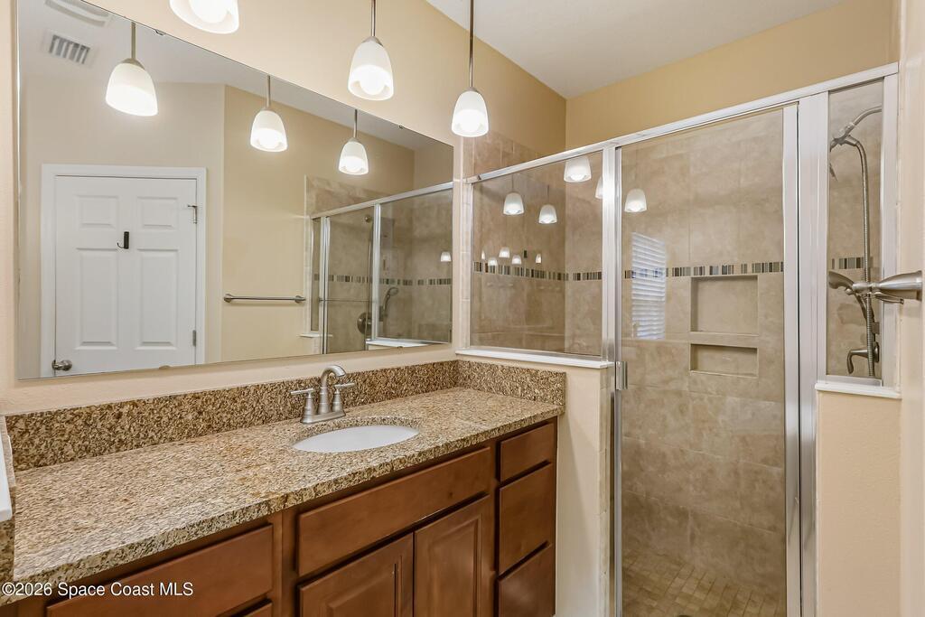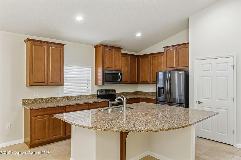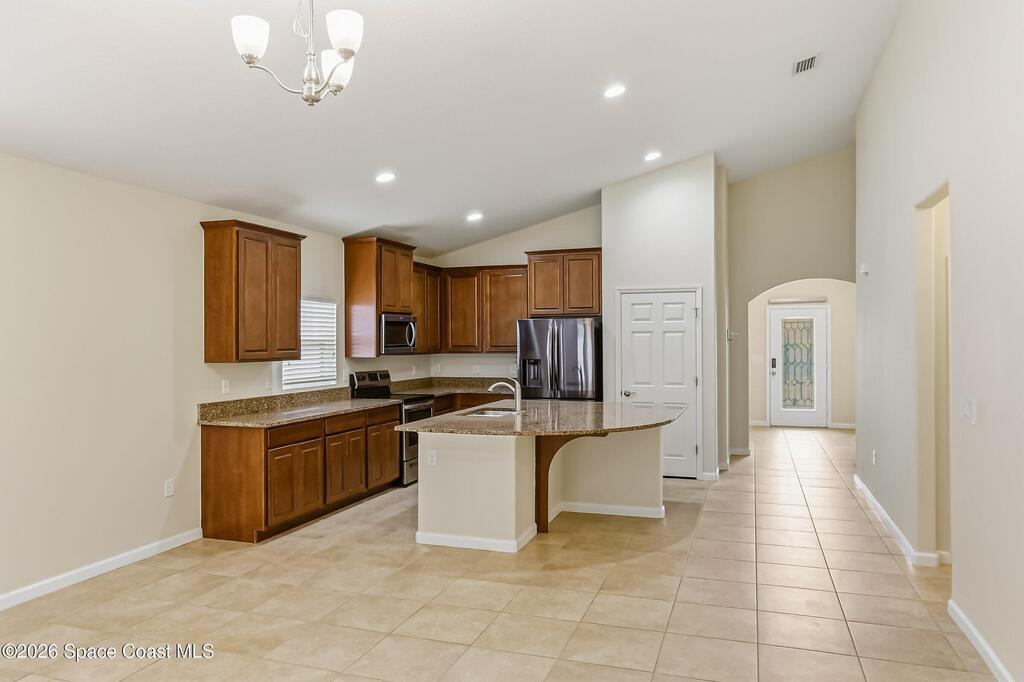 Come see everything this Palm Bay home has to offer! A bright and open living space makes it the perfect place to host guests or a comfortable space to relax in. From the moment you walk in, you are greeted with the great room, flooded with natural light, as well as French doors to an office/multi-use space, as well as the back patio. The massive island in the kitchen makes both of these easier than ever, along with upscale appliances that allow you to appreciate your new space. New paint has been applied inside and out, along with fantastic upkeep to make this 2017 home feel brand new. The primary bedroom has one of the most desirable layouts you can find, with dual walk-in closets and a split dual vanity in the bathroom, sure to give you a lavish feel. The Extravagance continues into the secondary bathroom, with another dual vanity. Don't miss the opportunity to make this impeccably maintained, move-in-ready gem your own!