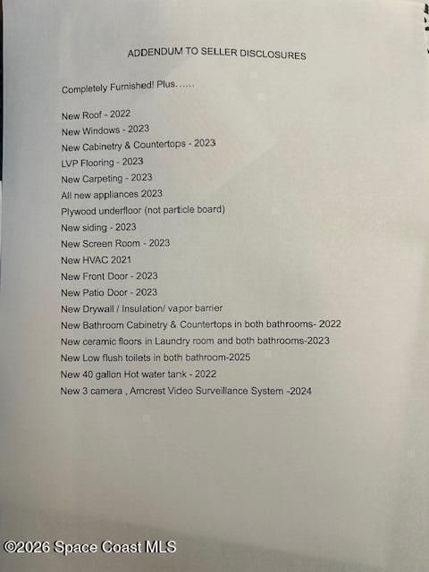 Just bring your toothbrush and pajamas! Everything is done and the house is furnished! This is a premium property in a 55+ neighborhood! The home has been lovingly cared for and has the following New/Newer UPDATES: Roof 2022, Windows 2023, Kitchen & Bathroom Cabinetry and Countertops 2023, LVP Flooring 2023, Carpeting 2023, Appliances 2023, Plywood underfloor (not particle board!), Siding 2023, Screen Room 2023, HVAC 2021, Front and Patio Doors 2023, Drywall/Insulation/Vapor Barrier, Ceramic flooring in Laundry and both bathrooms, 40 gal HWH and Surveillance System 2024. It is fully furnished and ready for its new owners! Come check out this beautiful home!