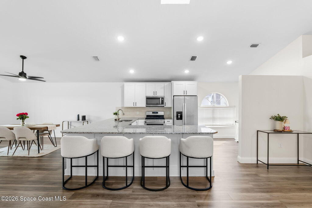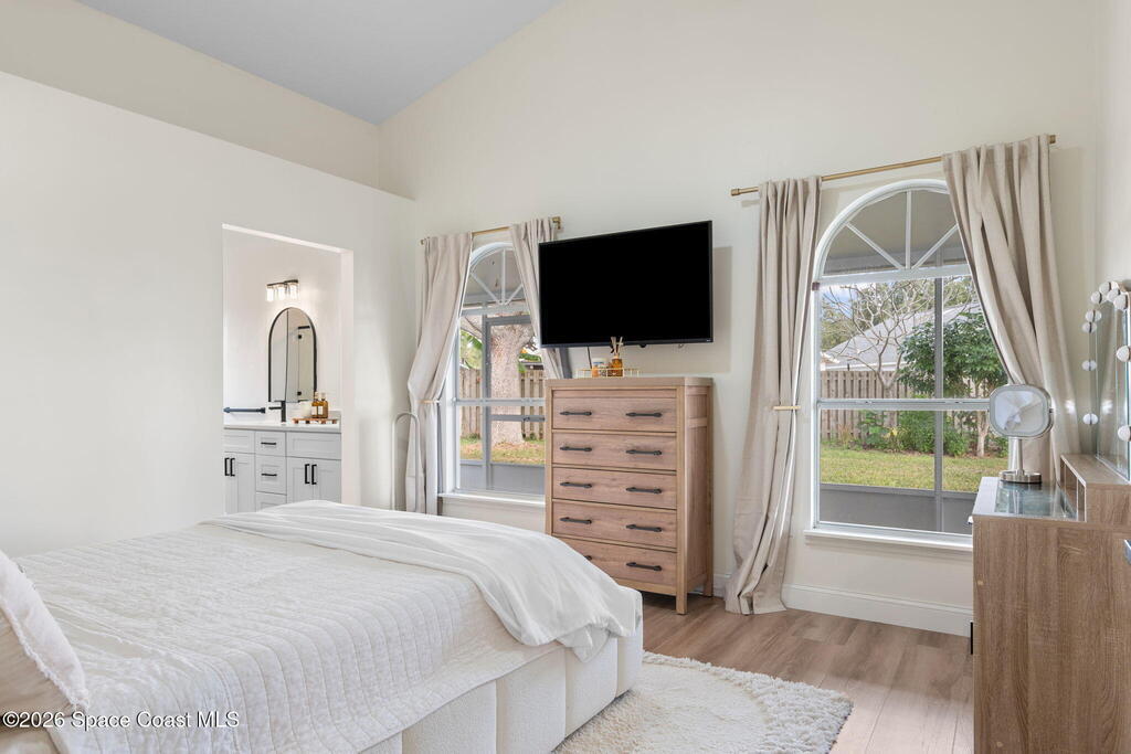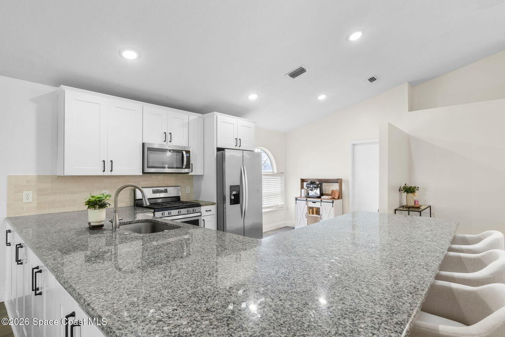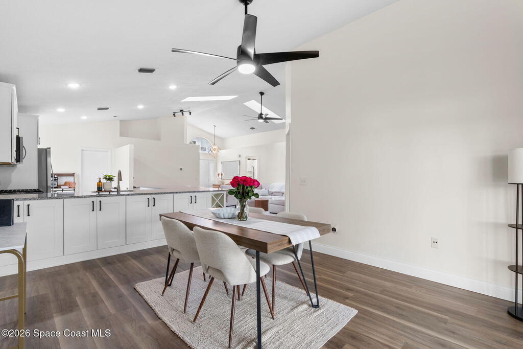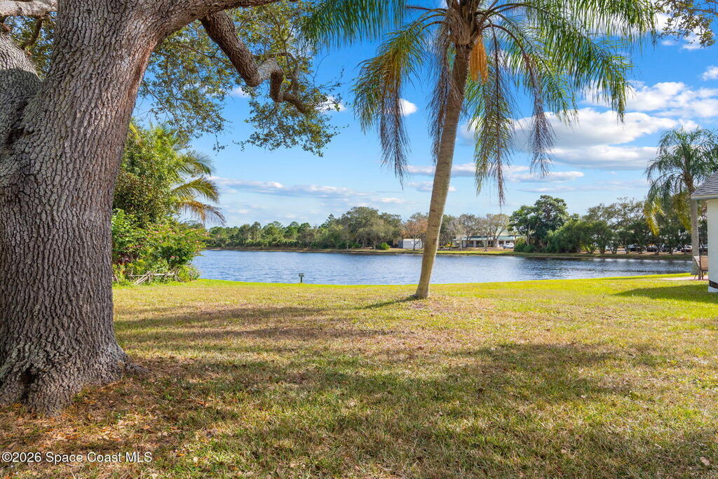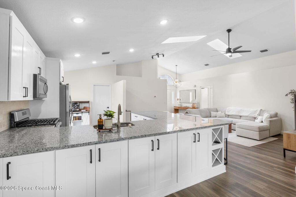 This meticulously updated Viera home delivers the perfect blend of modern design & thoughtful upgrades. Situated on a desirable cul-de-sac oversized lot with tranquil water views. Manicured curb appeal including freshly painted exterior, enhanced landscaping, new stone accents & upgraded lighting. You are welcomed by a bright, open-concept floor plan highlighted by vaulted ceilings, skylights that flood the home with natural light, and fresh paint on every wall. No carpet. Luxury vinyl flooring flows seamlessly throughout the living areas and bedrooms, creating a cohesive and low-maintenance space ideal for everyday living. The kitchen has been tastefully refreshed with painted cabinetry, updated hardware, backsplash, stainless steel appliances, a spice rack cabinet, and a large center island that anchors the space while offering ample prep and seating. New light fixtures and ceiling fans enhance both form and function. Both bathrooms have been fully remodeled with no detail