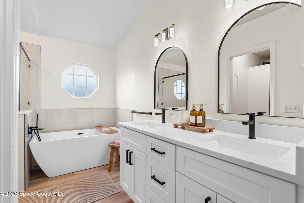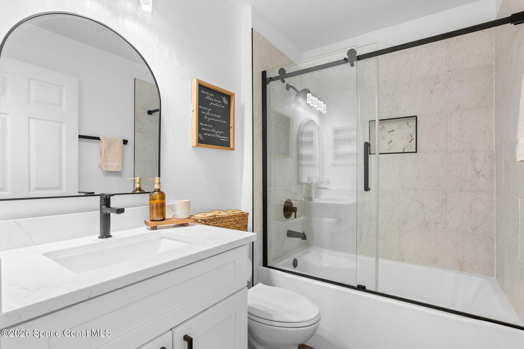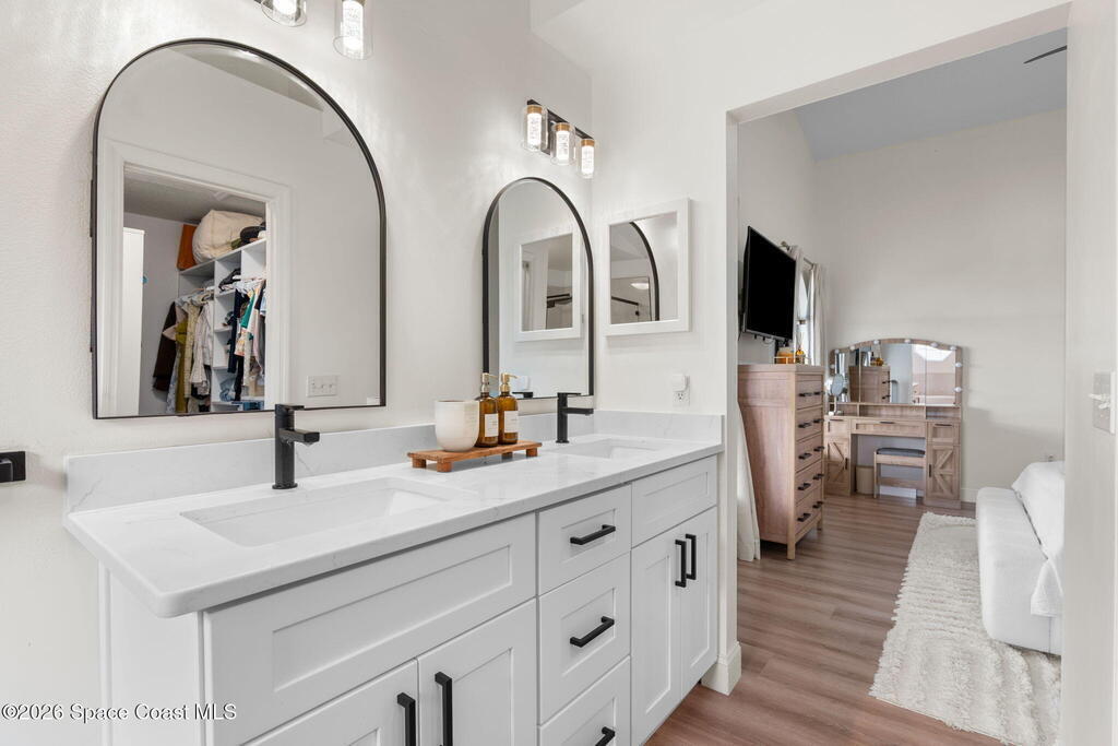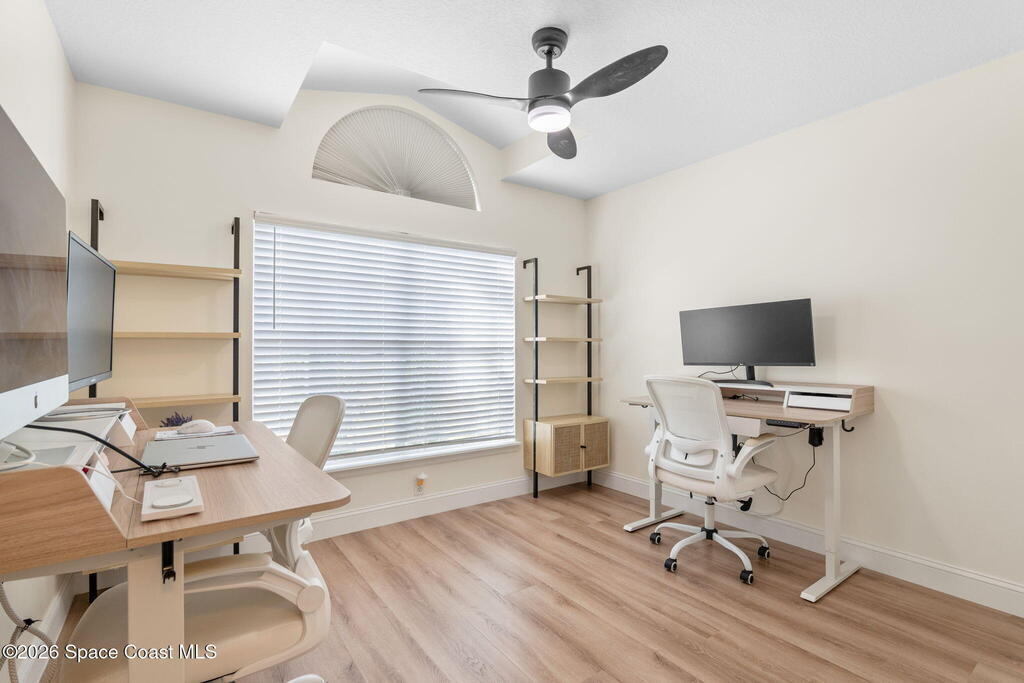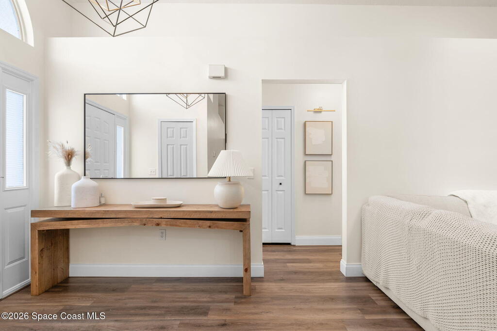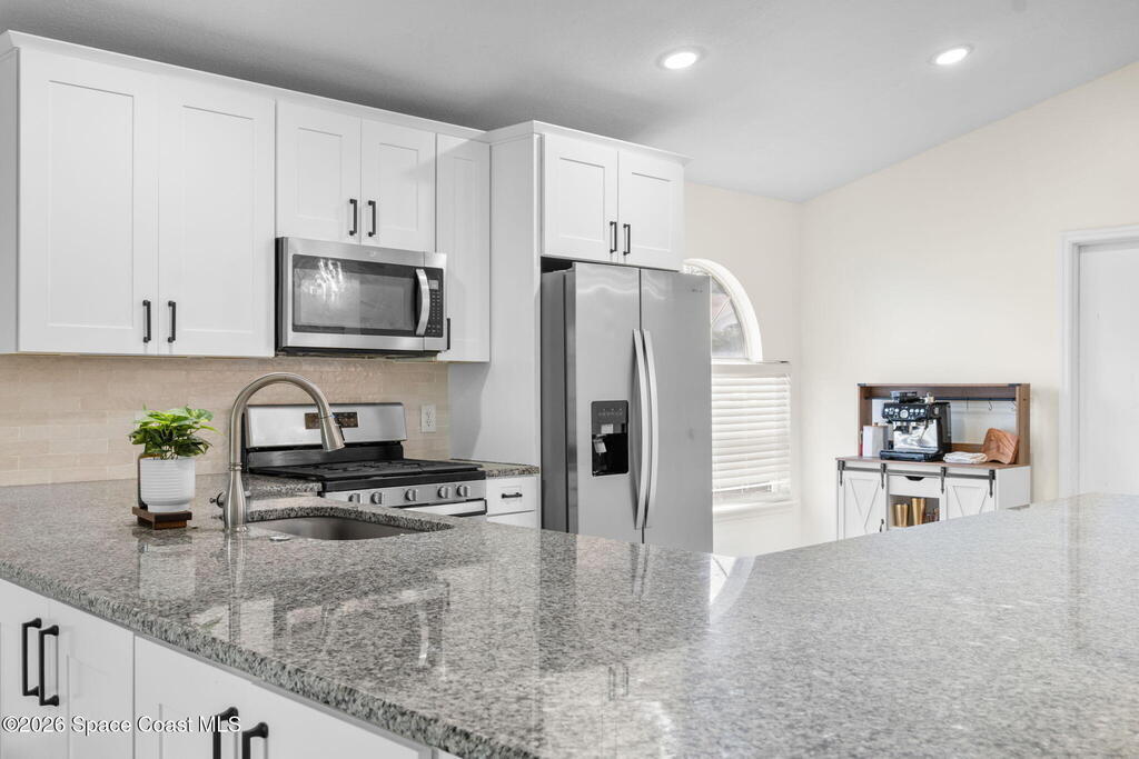 This meticulously updated Viera home delivers the perfect blend of modern design & thoughtful upgrades. Situated on a desirable cul-de-sac oversized lot with tranquil water views. Manicured curb appeal including freshly painted exterior, enhanced landscaping, new stone accents & upgraded lighting. You are welcomed by a bright, open-concept floor plan highlighted by vaulted ceilings, skylights that flood the home with natural light, and fresh paint on every wall. No carpet. Luxury vinyl flooring flows seamlessly throughout the living areas and bedrooms, creating a cohesive and low-maintenance space ideal for everyday living. The kitchen has been tastefully refreshed with painted cabinetry, updated hardware, backsplash, stainless steel appliances, a spice rack cabinet, and a large center island that anchors the space while offering ample prep and seating. New light fixtures and ceiling fans enhance both form and function. Both bathrooms have been fully remodeled with no detail