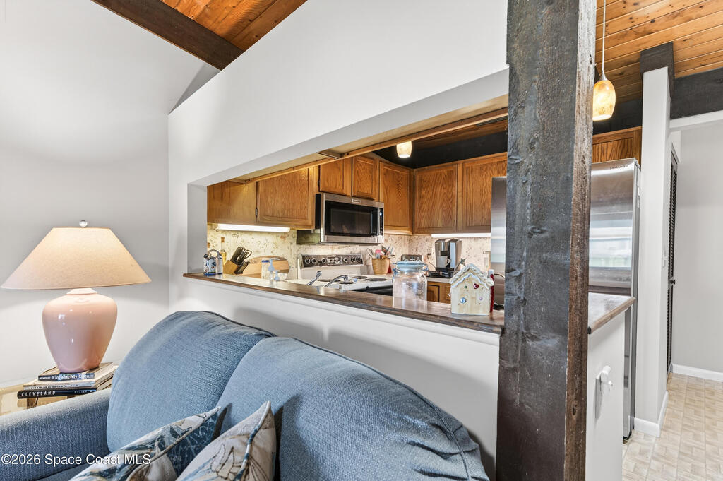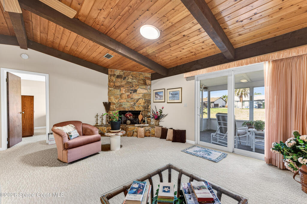 LOVELY ATTACHED SOUTH BEACH VILLA WITH SCREENED IN PORCH, VAULTED BEAMED CEILINGS, IMPACT WINDOWS PLUS SHUTTERS, NEW WEATHERHEAD, NEW ELECTRIC SERVICE, BIG GUTTERS, LED LITES IN GARAGE, ROOF 2018, AC IN AND OUT 5 YEARS OLD, WOOD BURNING FIREPLACE W/EQUIPMENT, WASHER, DRYER, FANS, COMMUNITY POOL, ORIGINAL OWNER AND WELL MAINTAINED. LOW HOA FEE