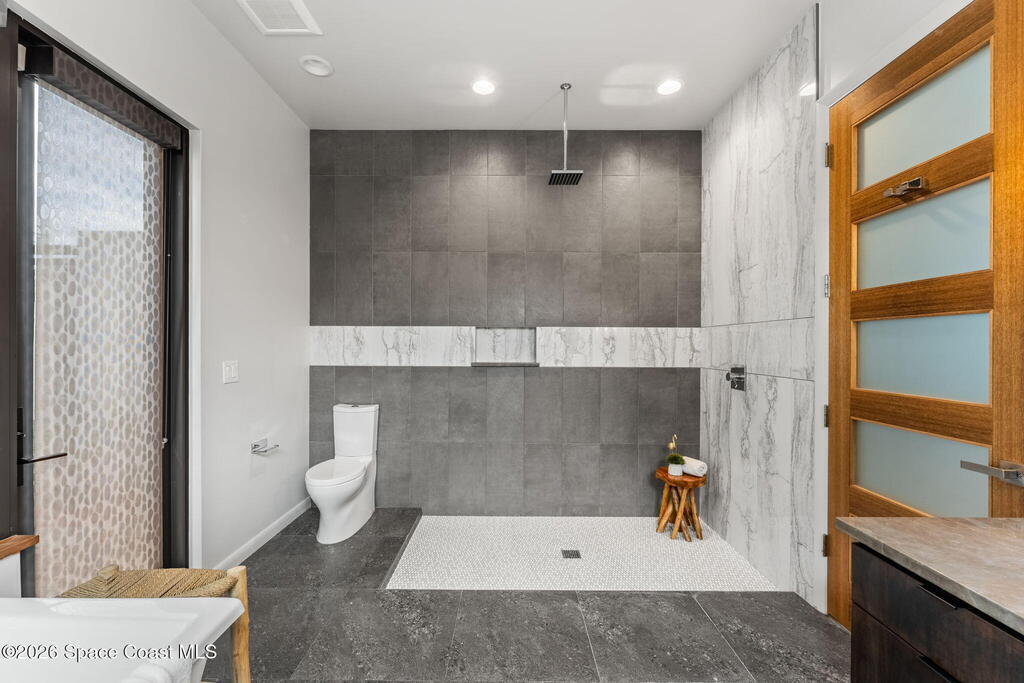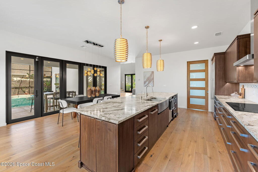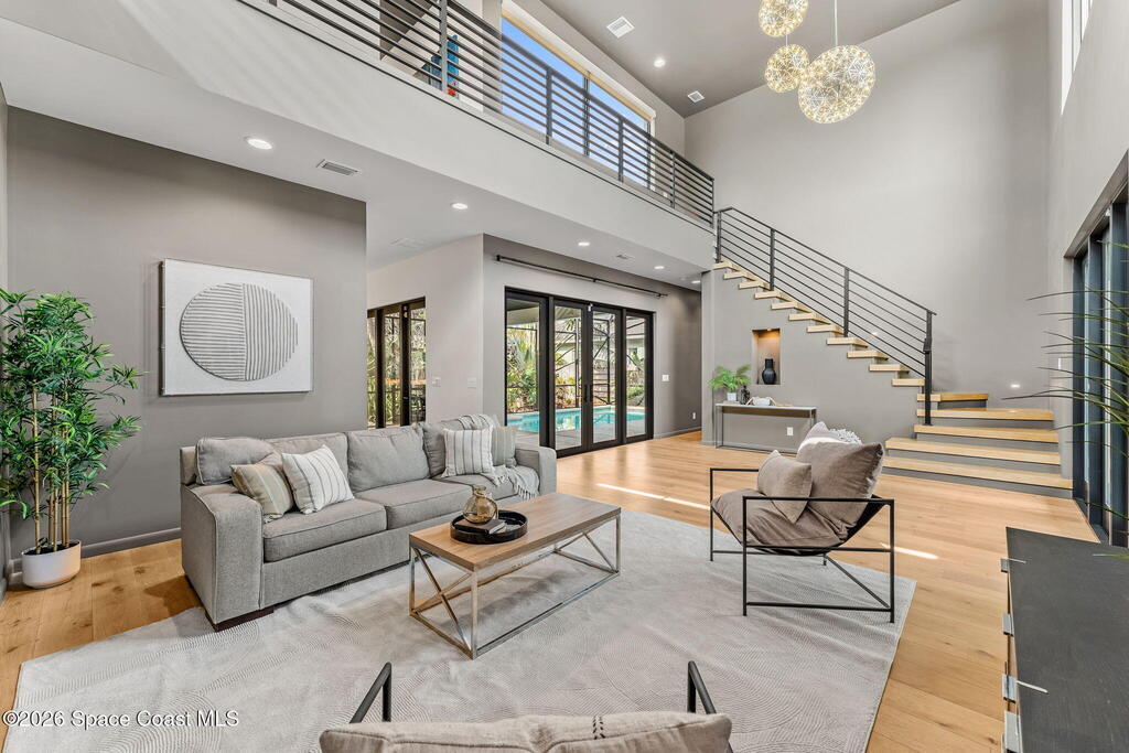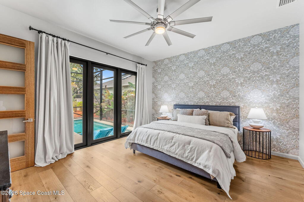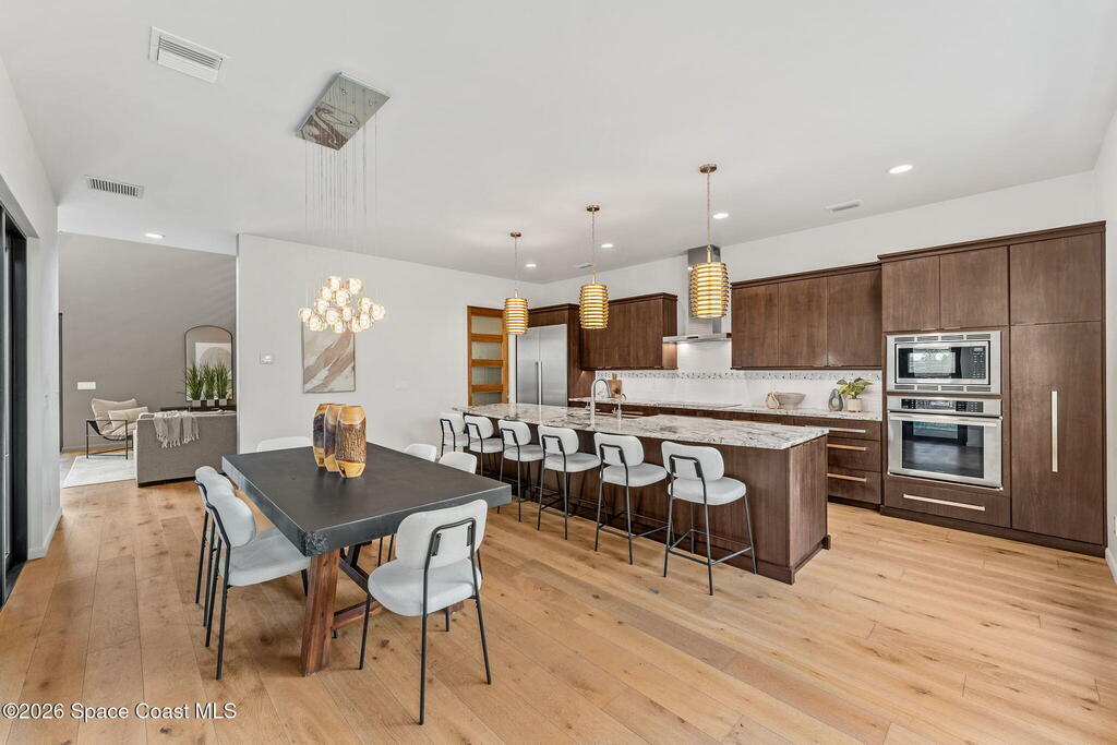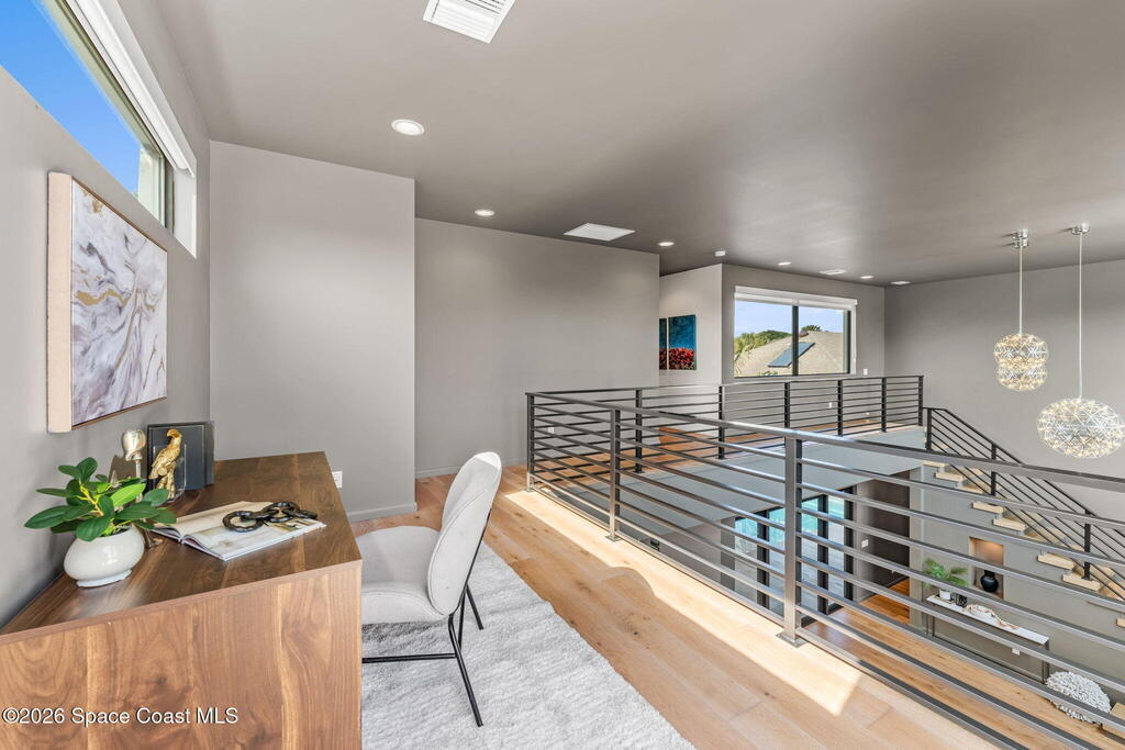 This is coastal living without compromise--steps from the beach, architecturally striking, and intentionally designed for those who expect more. A screen-enclosed saltwater pool defines the outdoor experience, surrounded by a sleek lounge deck, freestanding hot tub, outdoor shower, and firepit that transform the courtyard into a private resort setting. Inside, wood and tile flooring set a refined foundation for open, light-driven interiors, while the kitchen delivers both style and substance with an oversized island, breakfast bar seating, and a substantial walk-in pantry with wine cooler. The first-floor primary suite offers direct pool access, a custom walk-in closet with built-ins, and a showpiece en-suite bath centered around a dramatic walk-in shower. A loft-level retreat introduces two additional bedrooms, a full guest bath with tub/shower combo, and access to a commanding rooftop balcony--an expansive space designed for sunset views and evening gatherings.