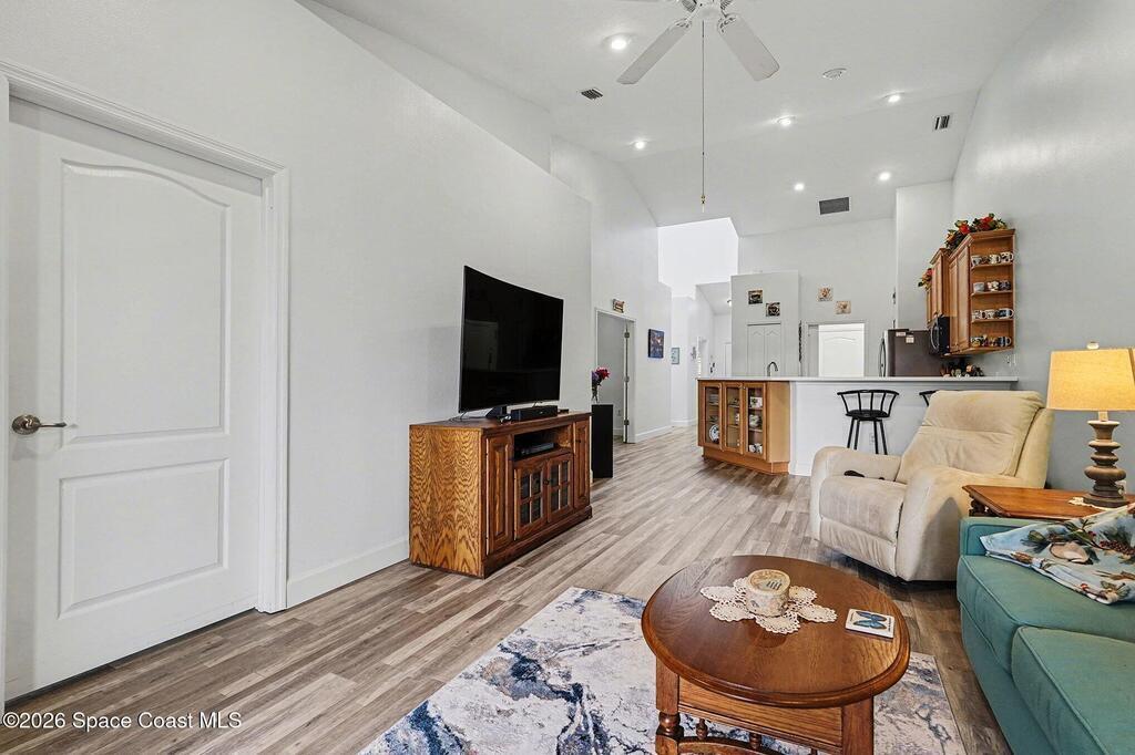 Welcome home!! Enjoy luxury senior living at it's best with an open floor plan and soaring ceilings that create a light, spacious feel throughout. Recent upgrades include fresh paint, new 5 3/4'' baseboards and durable luxury vinyl plank flooring, complemented by plantation shutters in the bedrooms for luxurious feel & new high end verticals.The spacious primary suite offers a large walk-in closet and a spa-like bathroom with a generous walk-in shower and double vanities. The kitchen is equipped with easy-to-maintain Corian countertops, newer stainless steel appliances, and a functional layout perfect for everyday living or entertaining.Additional highlights include a newer tankless water heater, newer a/c, washer and dryer, and a screened patio ideal for relaxing outdoors. Conveniently located within walking distance to the clubhouse, pool, and all activities. Feel secure with the 24 hour guarded gate entrance --this home offers comfort, convenience, and a vibrant community lifestyle