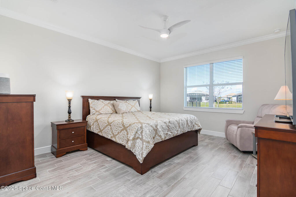Lakefront living in Viera's premier 55+ community just 15 min to the beach, delivering remarkable value, design & lifestyle. Social calendar will soon shine w/ nearly complete 30k SF clubhouse w/ restaurant, resort pool, pickleball, tennis & fitness center. This home stuns w/a stone facade, bay window & open layout. Inside, find wood-look tile, Minka-Aire fans, crown molding, tall baseboards, faux-wood blinds, CAT6 wiring & gutters. The Chef's kitchen is a showpiece: storage room, white soft-close cabinets w/pull-outs, built-in microwave & oven, gas cooktop & striking Calacatta Gold quartz on all counters (incl. baths), large island w/pendant lights. The great room soars w/tray ceiling & 8ft doors for a refined feel. The owner's suite offers a sizeable walk-in closet & a bath w/a dual rain/std shower. All baths have floor-to-ceiling tiled showers & comfort-height toilets. A drop-zone bench adds daily convenience. Garage w/ 3 overhead storage shelves. Your exceptional lifestyle awaits!