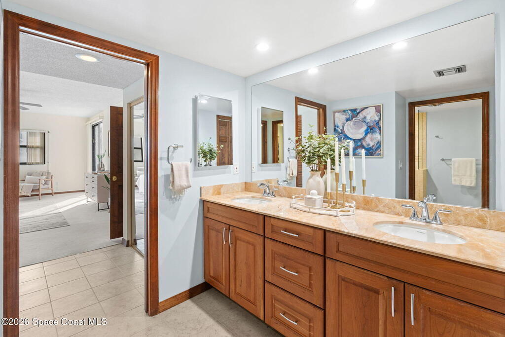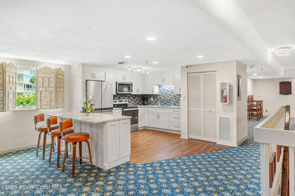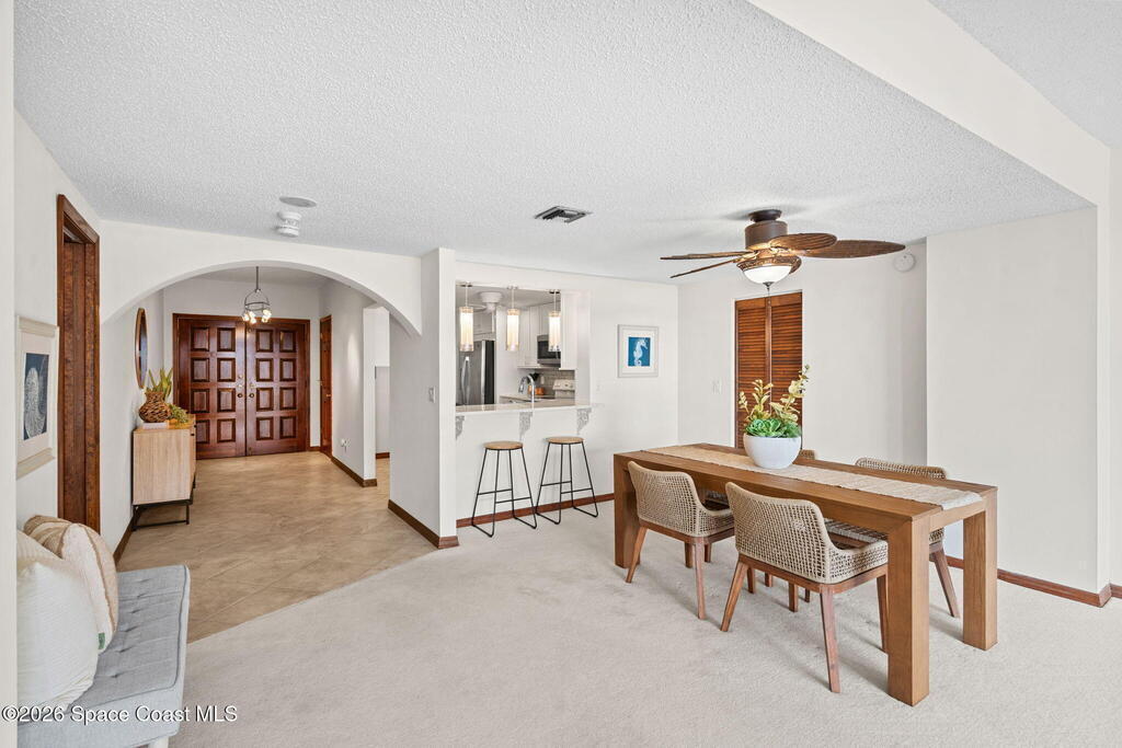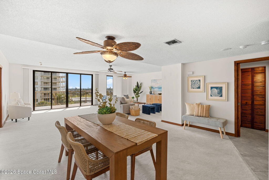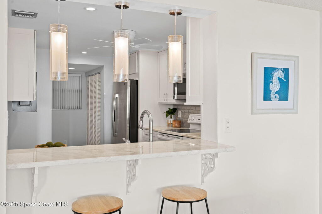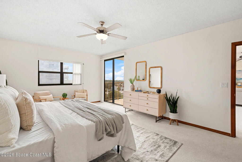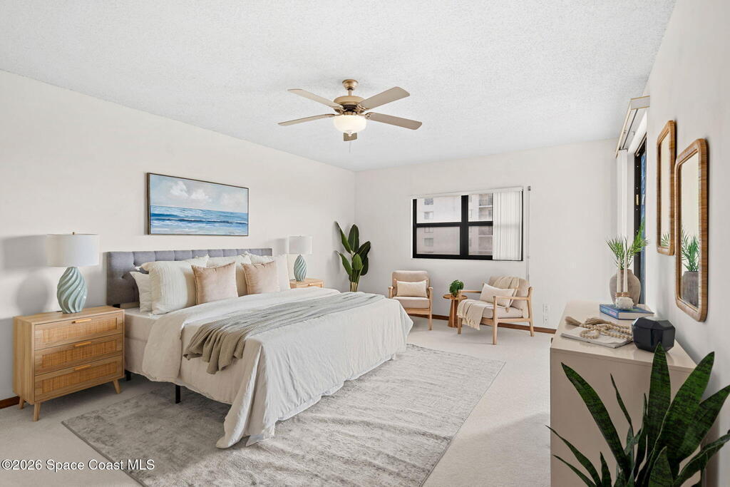 Experience coastal living at its finest in this beautifully updated 5th floor residence, offering 1993 sq. ft. of bright, open living space. The seamless flow between the living, dining, and kitchen areas creates an inviting atmosphere perfect for relaxing or entertaining. The renovated kitchen and bathrooms elevate the home with modern comfort and style.The expansive primary suite is a true retreat, featuring a custom multi head shower with built in bench, a dedicated vanity area with generous linen storage, dual closets, and sliding doors that lead to an impressive 8x27 covered balcony. Wake up to breathtaking sunrises and sweeping shoreline views every day.Guests will enjoy their own spacious suite, complete with a walk in closet, adjacent hall bath, and a private pocket door that transforms the space into a secluded getaway.With hurricane rated windows and doors, plus a private one car garage, this home delivers peace of mind along with its coastal charm.