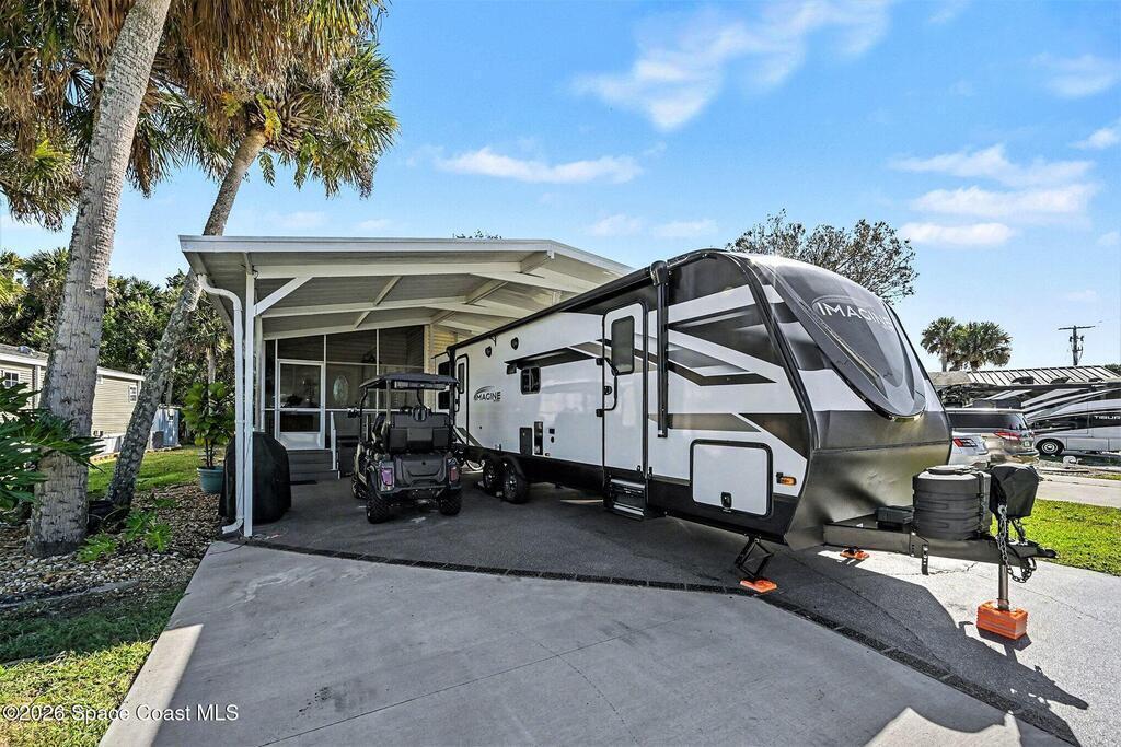 Welcome to resort living in The Great Outdoors Premier RV & Golf Resort! This updated 2-bedroom, 1.5-bath park model home offers comfort, convenience, and room to spread out. Enjoy a covered carport/RV port with a raised 13' roof, plus an additional 466 square feet of concrete for extra parking or outdoor entertaining. Recent upgrades include a new 8x12 Lark building with electric and a thermostat-controlled ventilation fan, a new vanity in the half bath, and an ultraviolet light added to the A/C system. A 2023 survey is available for peace of mind. Offered partially furnished (antiques and living room rug excluded), this well-maintained home is perfectly suited for seasonal or full-time resort living with access to golf, pools, and endless amenities.