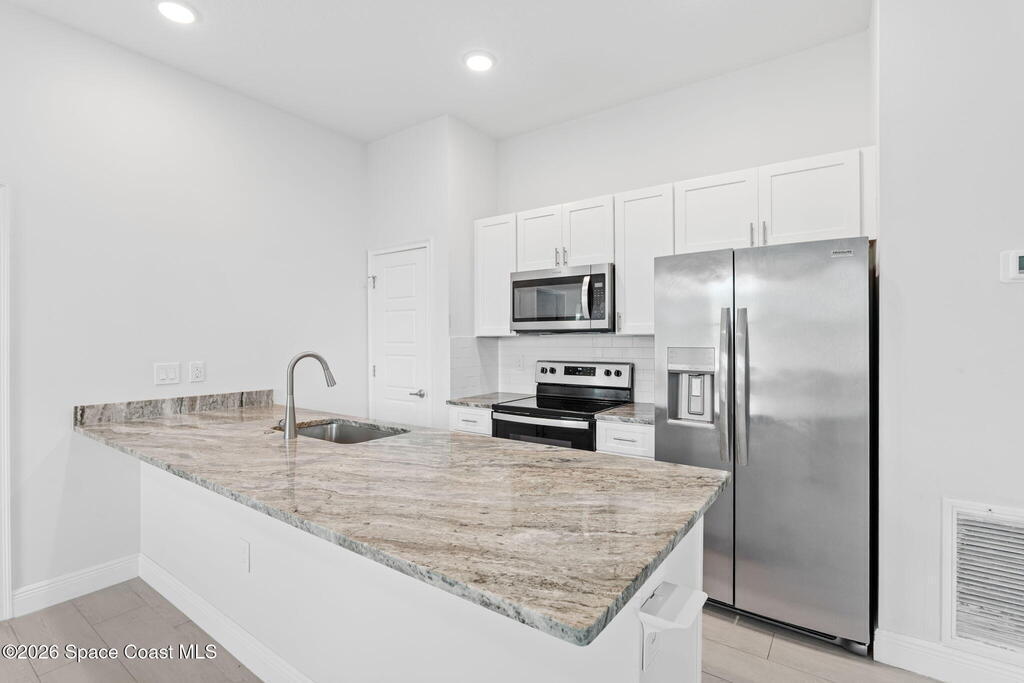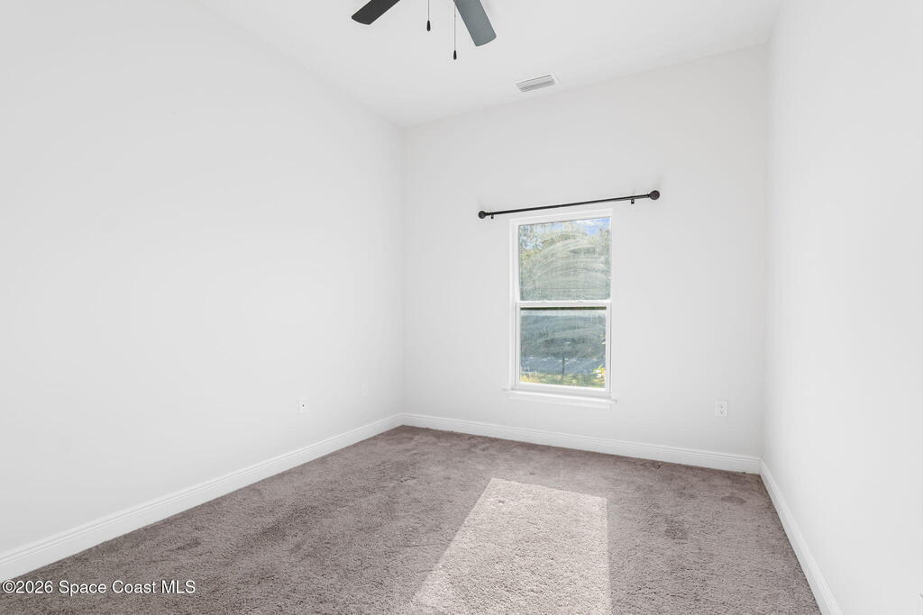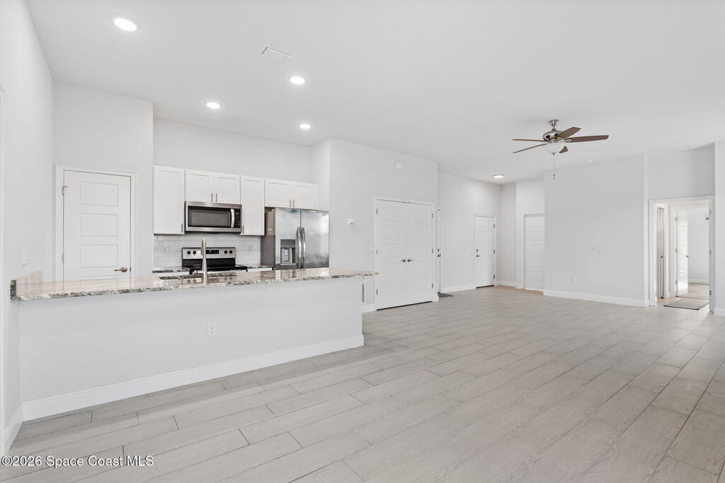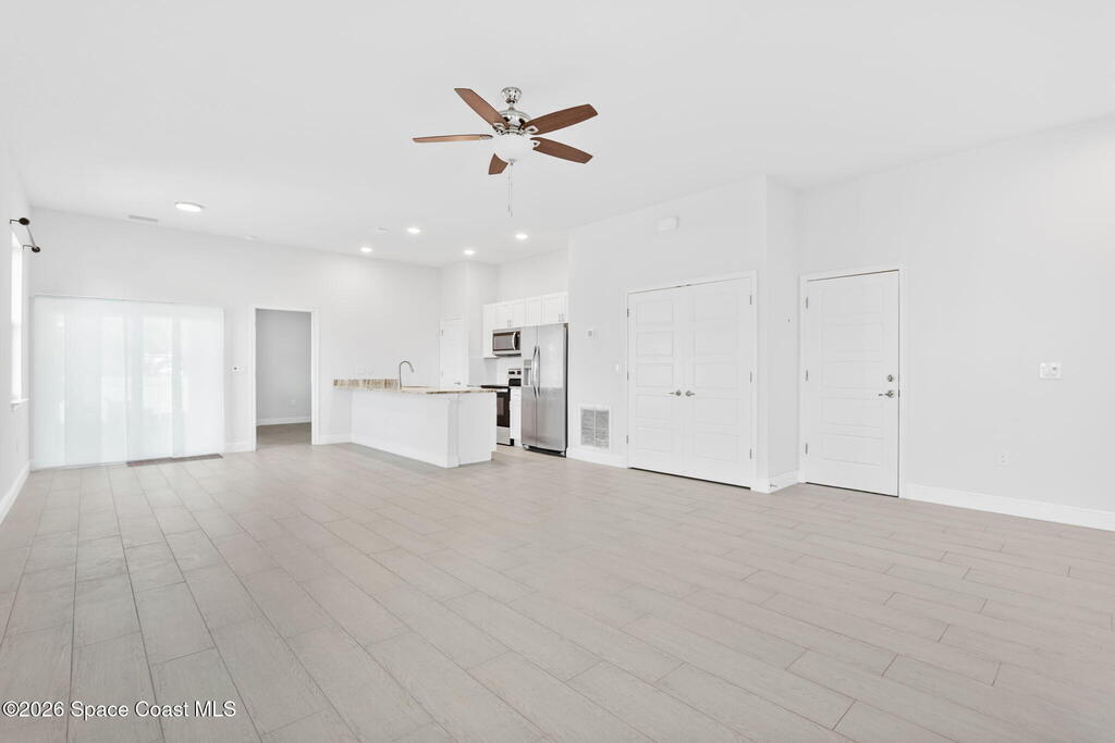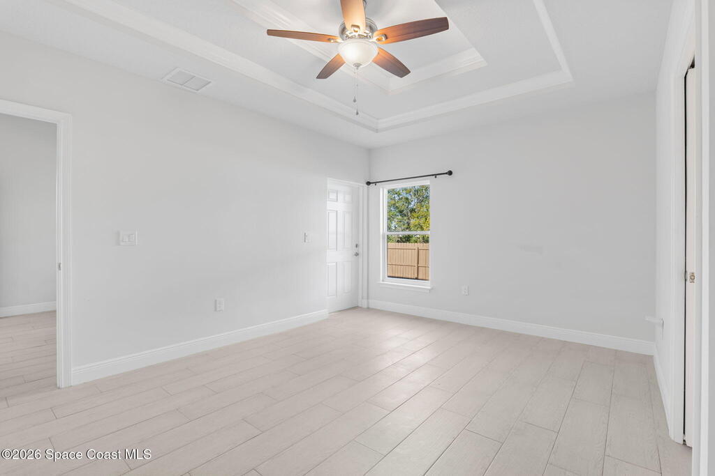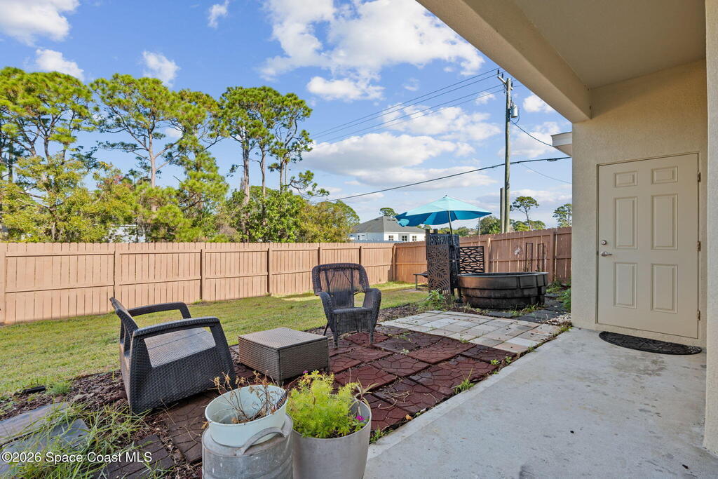 Built in 2022, this well-maintained single-level 3-bedroom, 2-bath home offers approximately 1, 600 sq ft of modern, functional living space. The open-concept layout features tile flooring throughout the main living areas, recessed lighting, and a spacious kitchen with granite countertops, stainless steel appliances, ample cabinetry, and a large center island.The primary suite includes a tray ceiling, ceiling fan, private en-suite bath with dual granite vanities and a tiled walk-in shower, plus an adjoining sitting room/flex space ideal for a home office, nursery, or private retreat. Secondary bedrooms are well sized and versatile.Additional highlights include a dedicated laundry area, attached two-car garage, covered patio, and fully fenced backyard. Convenient Palm Bay location near shopping, dining, schools, and major roadways.