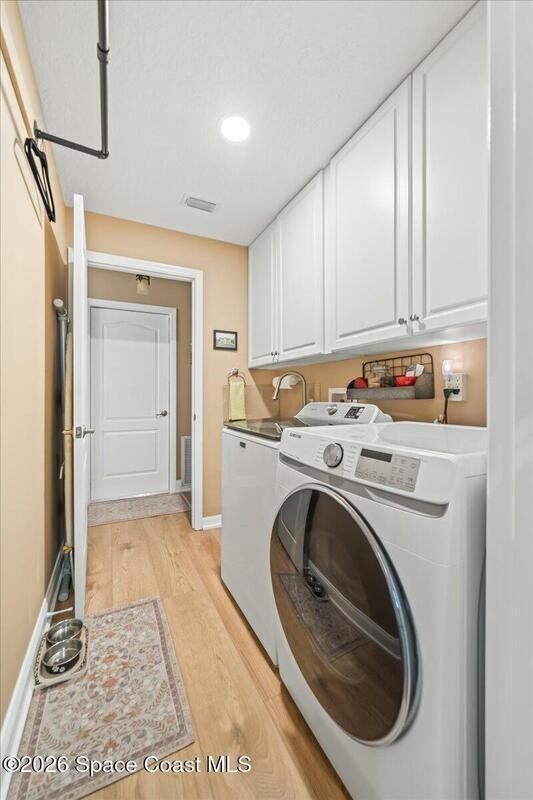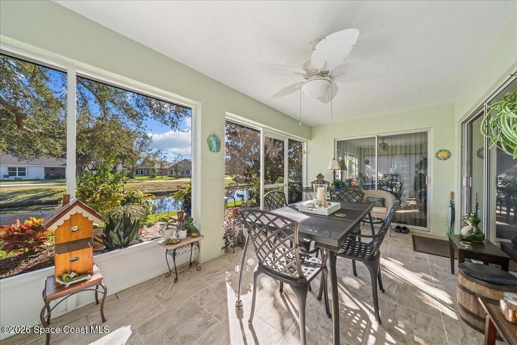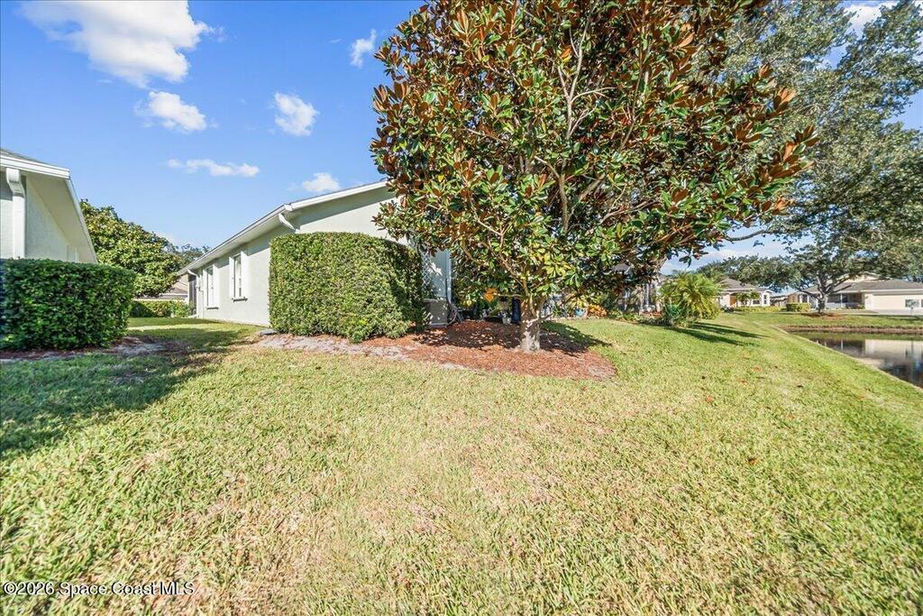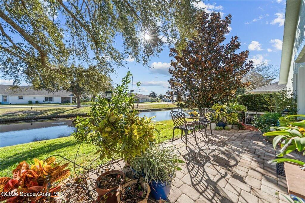 Welcome to your Waterfront Home in the gated 55+ community of Compass Pointe. This 3BD/2BA move-in ready home has been updated throughout. Enjoy the updated kitchen with 42'' white cabinets, appliances and an enlarged pantry. The flooring has been updated throughout with Luxury Vinyl Plank for easy maintenance and beauty. This home was upgraded with all new accordion shutters throughout. Both bathrooms have beautifully upgraded seamless glass showers and updated fixtures. The open floorplan of this home offers water views from the kitchen, family room, primary bedroom and welcoming screened lanai. The 2023 roof and gutters add an additional layer of comfort. Enjoy the community amenities, including a screen heated pool and spa, bocce ball, putting green, shuffleboard and organized activities. Conveniently located to shopping, dining and the beaches.