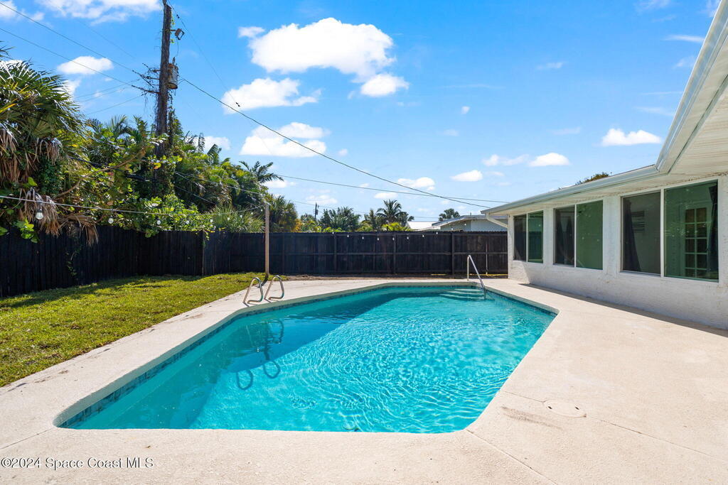 The perfect opportunity for beachside living less than 1 mile to Downtown Cocoa Beach and a short stroll to the ocean. This pool home features a 5 bedroom 2 bathroom main house with a 1 bedroom 1 bathroom, 700 sq ft guest apartment with full kitchen over the garage. Live in the main house and rent the apartment or keep the current licensed short term rental going. Recent updates and standout finishes include a newer roof, HVAC, stone counters, new flooring throughout, stainless appliances, huge kitchen island, a shiplap accent wall, crown molding, a resurfaced pool, fencing, sod, the list goes on. In addition to the driveway up to the garage there is ample graveled parking in front of the home. Minutes to area shops and restaurants, Cocoa Beach is a dream destination and perfect town for investment. Currently a top 10 rated surf town in the world, you'll never want to leave.