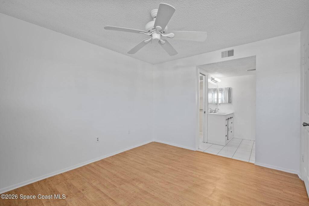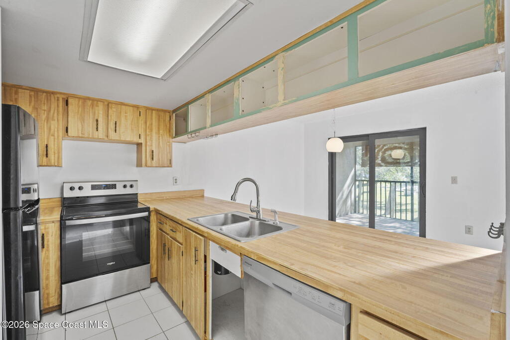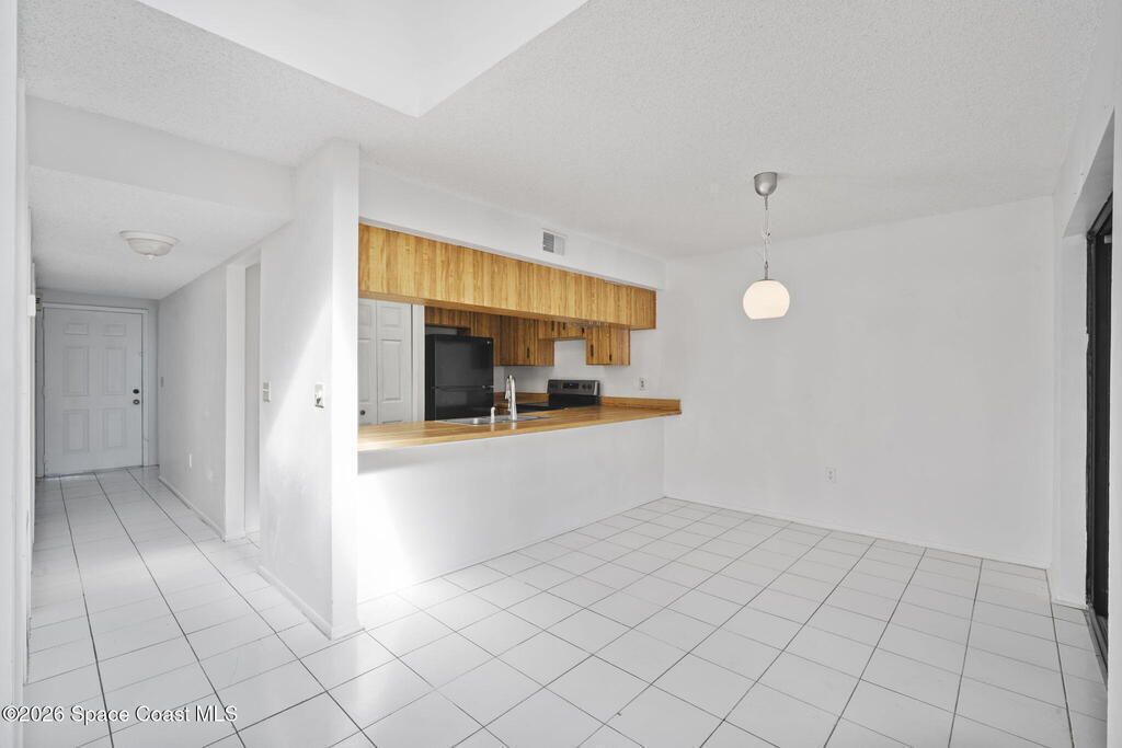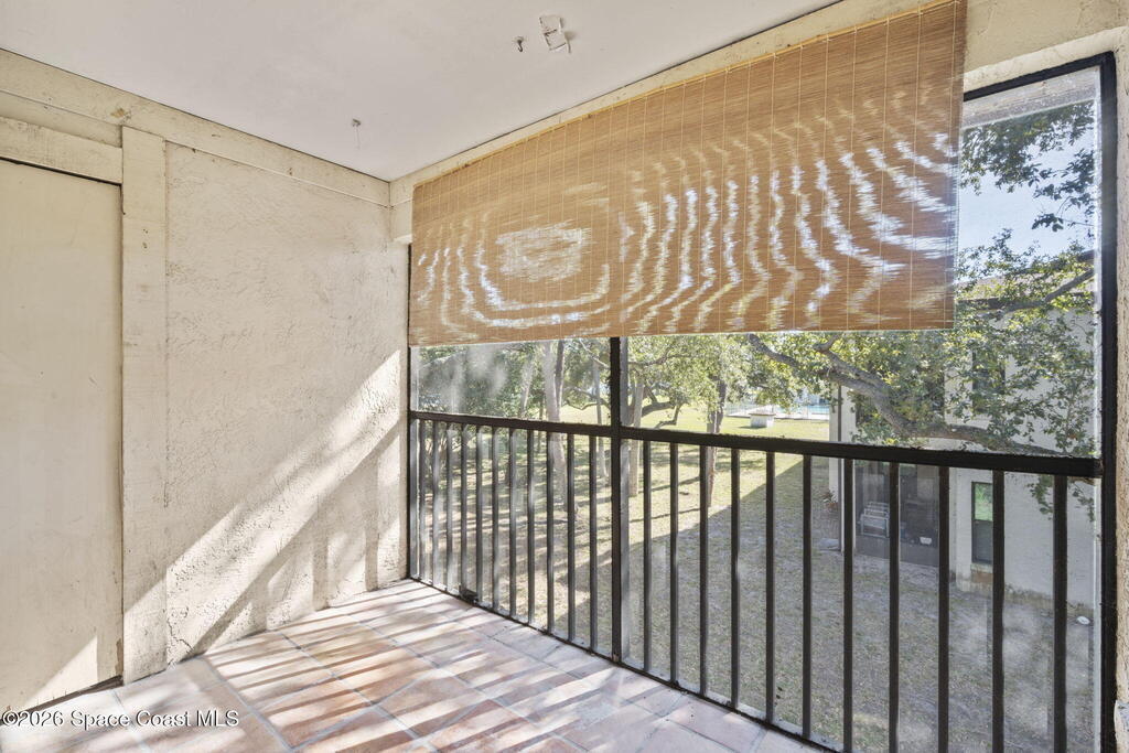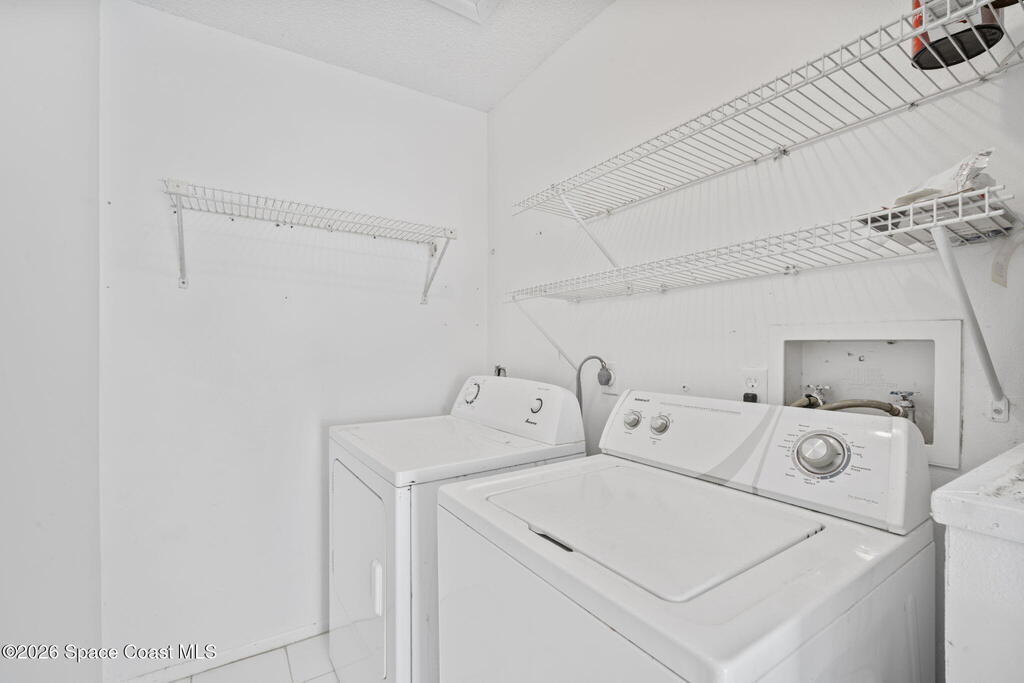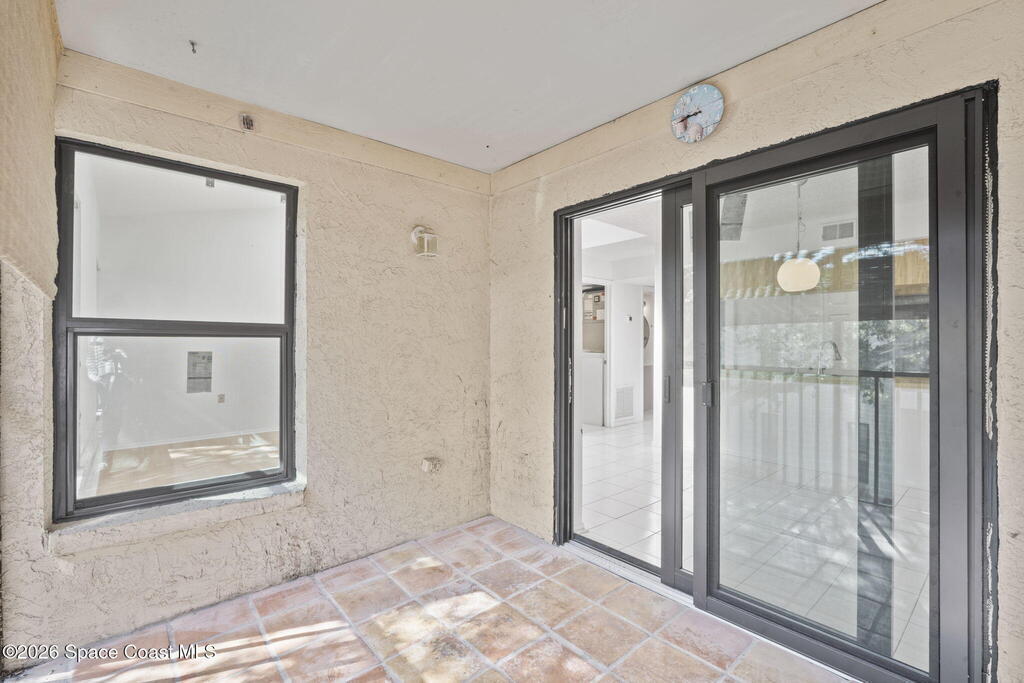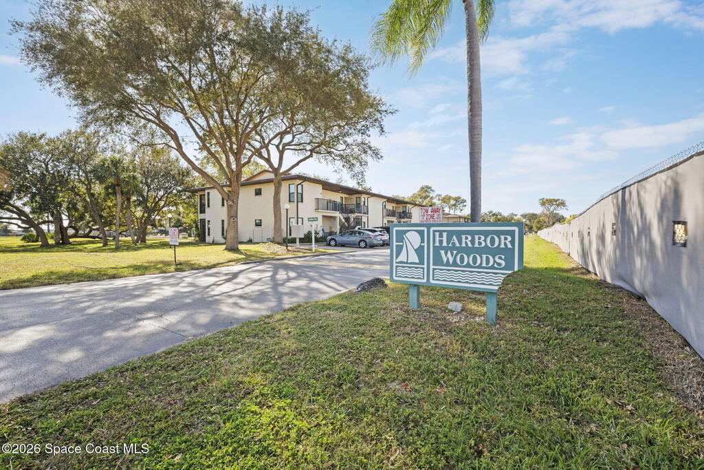 Perfect starter home or investment opportunity in Harbor Woods, Merritt Island! This two-bedroom, two full-bath condo offers an efficient, well-designed layout that lives larger than its square footage. Recently installed hurricane impact windows and a sliding glass door provide peace of mind and energy efficiency. The spacious primary suite features a walk-in shower and single-sink vanity. The main living area features vaulted ceilings accented by two beautiful skylights, creating a bright and open feel. The efficient galley-style kitchen includes a breakfast bar and newer appliances, while the indoor laundry room comes complete with a washer and dryer. Enjoy views from the dining area through the screened lanai overlooking the community pool in the distance. Additional updates include a newer A/C and water heater (2020). Condo fees cover water, cable/internet, and all exterior maintenance. Harbor Woods is a well-managed community. Schedule your showing today!