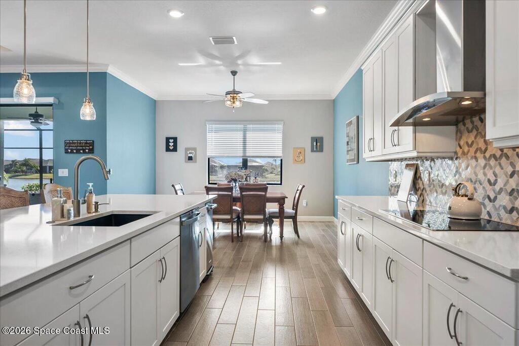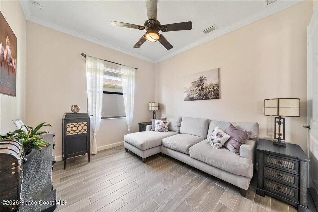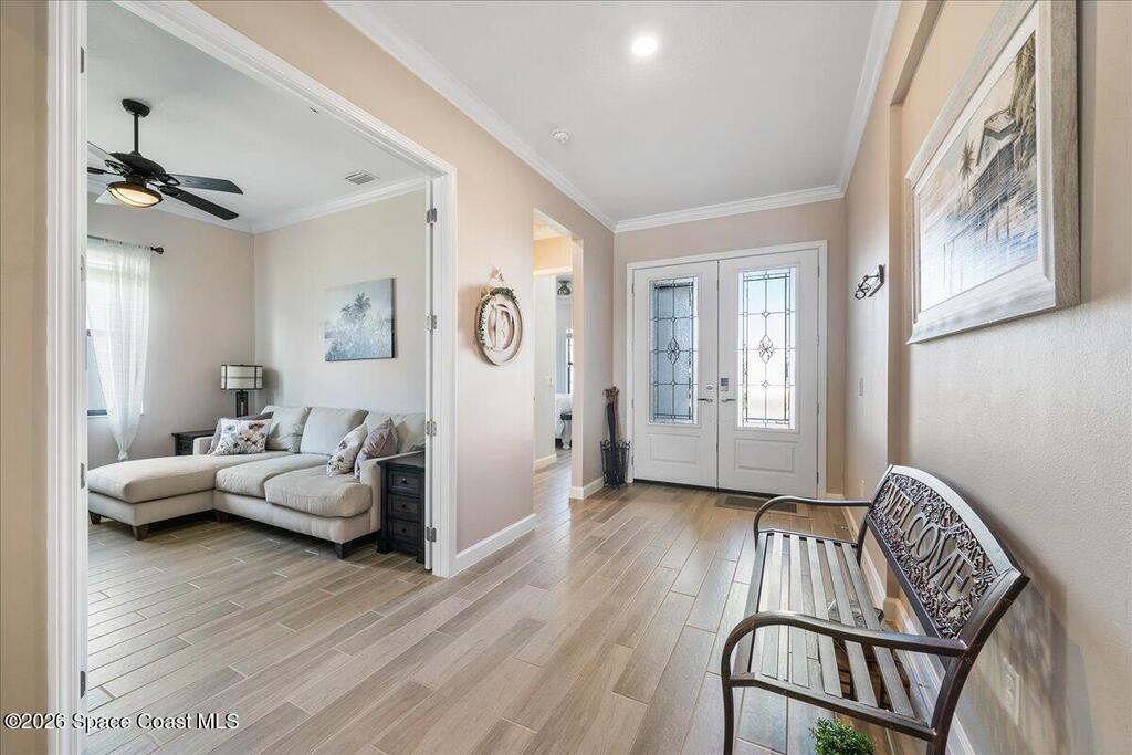 Live like you're on vacation in this better than builder new home on a premium lot close to all the resort like amenities in 55+ Bridgewater at Viera. Quality, tasteful upgrades including wood look tile throughout the bedrooms, tile backsplash, crown molding, vaulted screen patio enclosure, storage cabinets in the laundry room and leaded glass front doors.Stunning kitchen has a massive island open to the dining and family room framing incredible views of the lake. The three bedrooms have their own bathrooms and are separated into different wings for privacy. Primary bedroom looks out to the lake and has a spacious ensuite bathroom with large shower. double vanities, walk in closets, and soaking tub. Den or 4th bedroom. Take your golf cart or miles of community sidewalks to the pool, gym, work out rooms, pickleball or tennis courts, or catch a movie in the movie theater. HOA covers lawn maintenance so you can enjoy all Florida living has to offer. Minutes to the beach and I-95