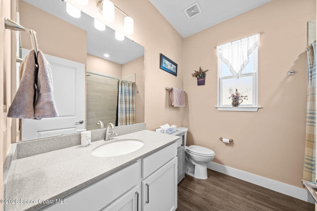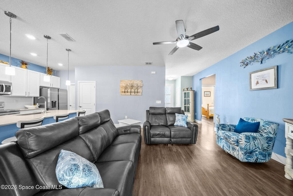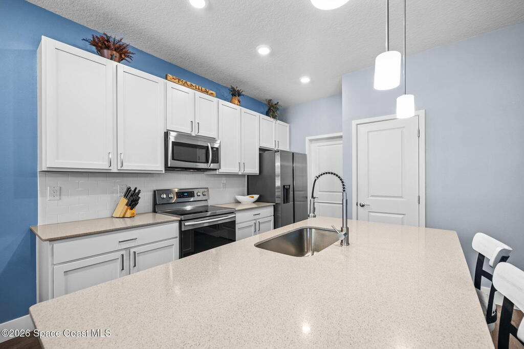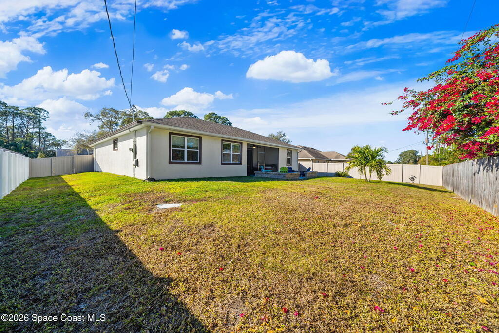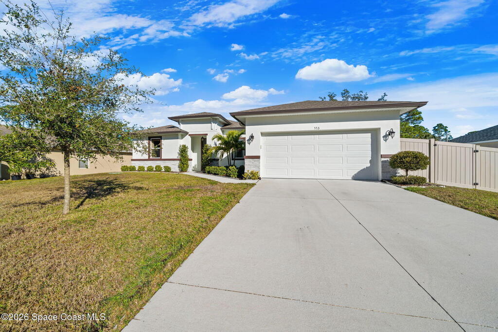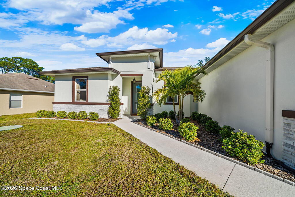 5K towards buyers closing cost! Built in 2021, this energy-efficient concrete block home offers 3 bedrooms, 2 bathrooms, and 1, 727 sq ft of modern living on city water in Palm Bay. The open floor plan is enhanced by 9'4'' ceilings and luxury vinyl plank flooring throughout--no carpet--creating a bright and spacious feel. The kitchen features 42'' cabinetry, quartz countertops, and stainless steel appliances, flowing effortlessly into the main living and dining areas, perfect for everyday living and entertaining.Designed with energy efficiency in mind, this home offers newer construction standards that help keep utility costs low while maintaining year-round comfort. The primary suite is a true retreat with a tray ceiling, large walk-in closet, dual sinks, and a beautifully tiled walk-in shower filled with natural light from the transom window. Both bathrooms feature quartz countertops for a cohesive, upscale look.