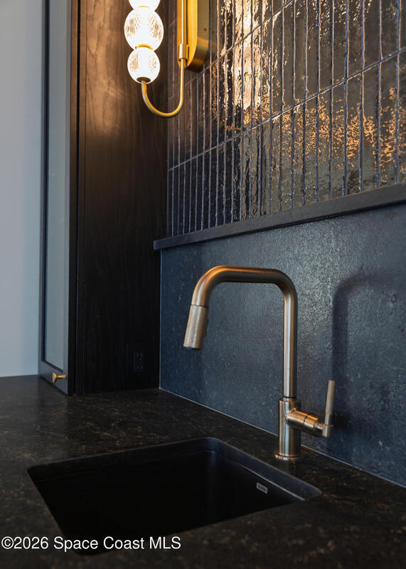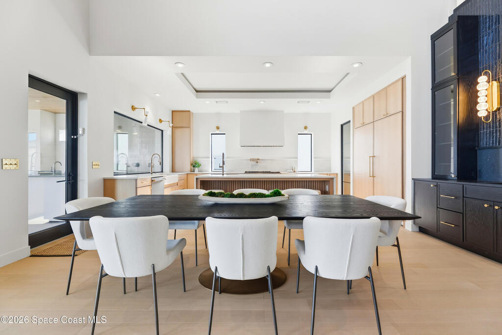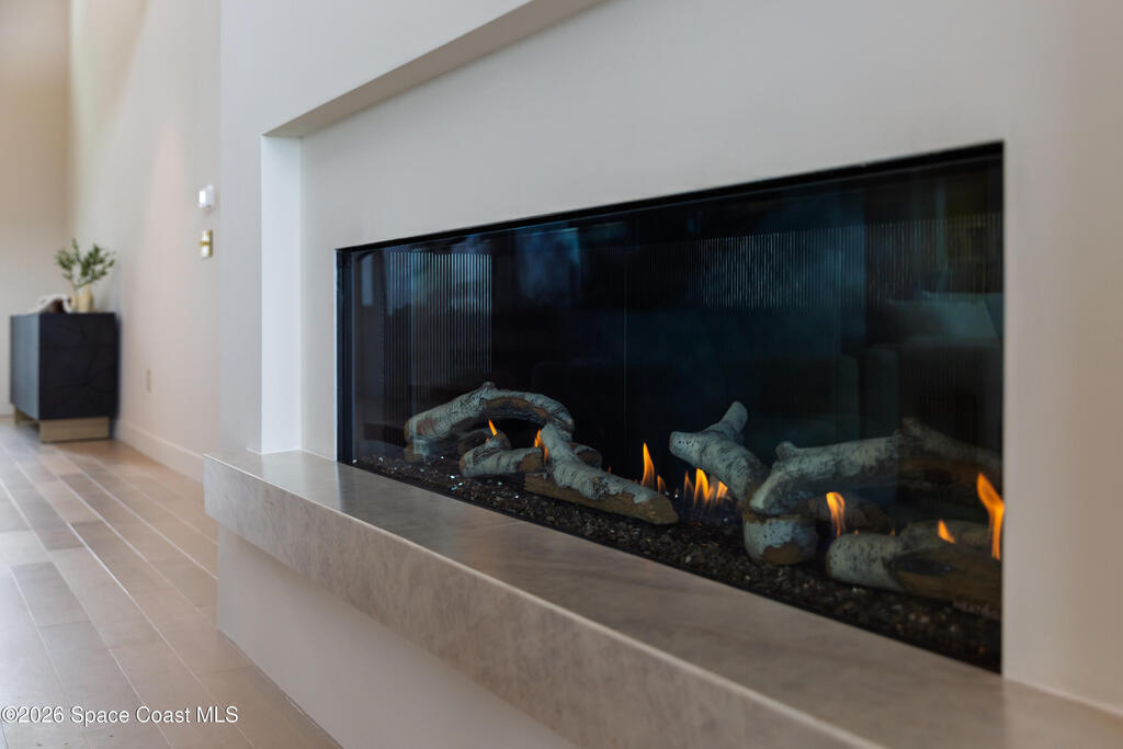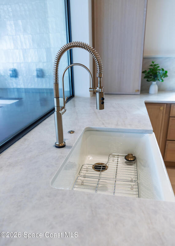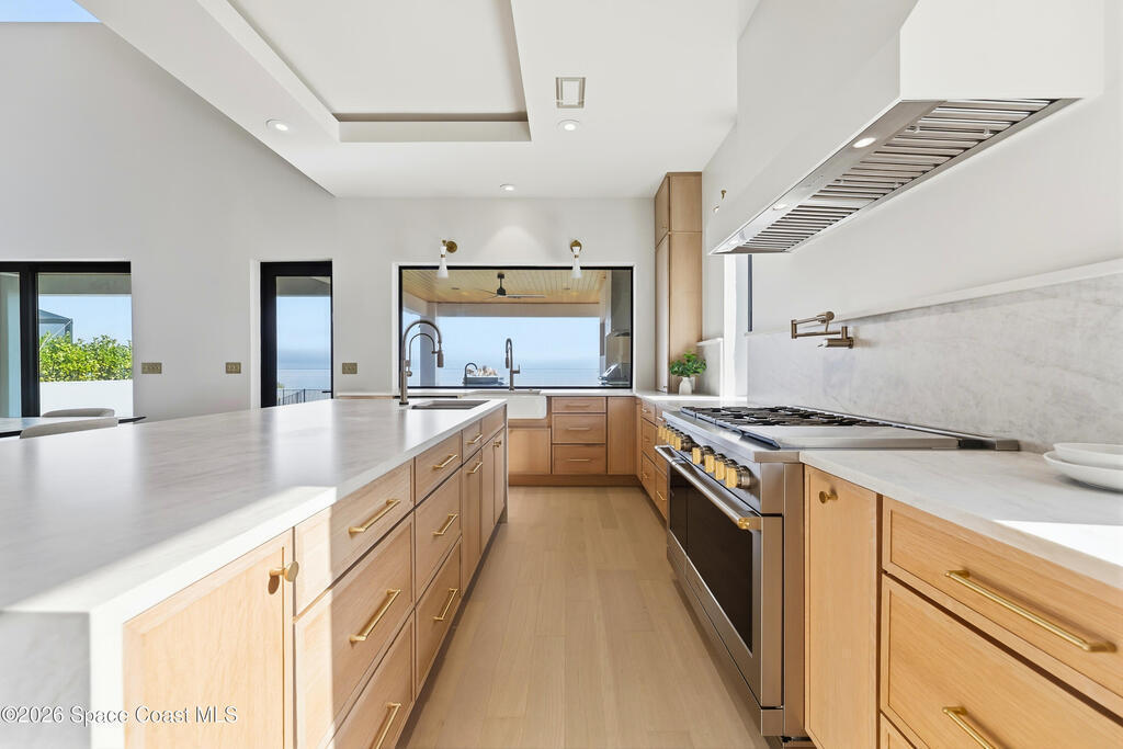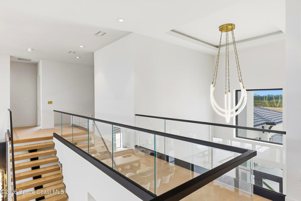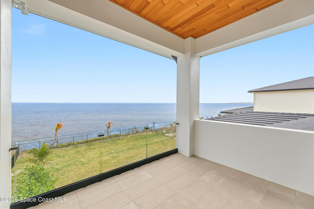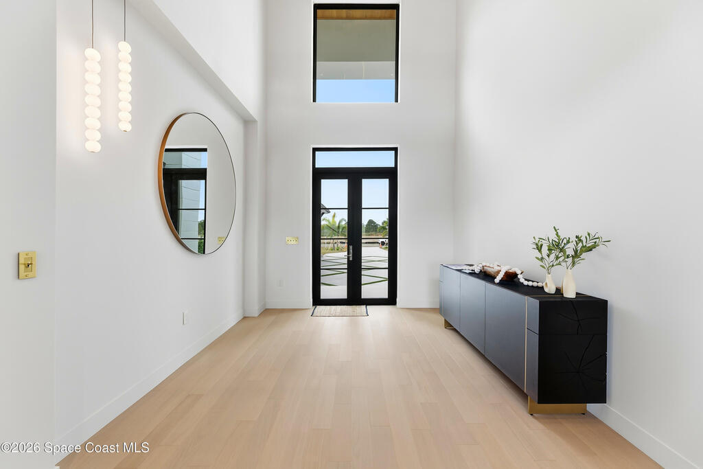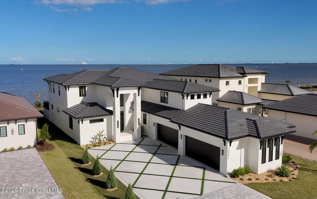Experience waterfront living in this newly custom-built luxury home, perfectly positioned along the Intracoastal within the premier gated community of The Shores at Tranquility. Set on .45 acres with 69+ feet of direct waterfront, this 4-bedroom, 4-bath residence offers an oversized bonus room, a 4-car garage and is thoughtfully designed for both everyday comfort and elegant entertaining. A beautiful double-door entry welcomes you into 23-foot ceilings and 3-5 mile waterfront views showcased through oversized sliding glass doors, creating an unforgettable first impression with front-row views of Kennedy Space Center rocket launches, abundant wildlife, and breathtaking sunrises from the comfort of home.The heart of this home is a chef's kitchen featuring premium Monogram appliances, a 48-inch gas range with double ovens, six burners, and a griddle, quartz countertops with waterfall edges,