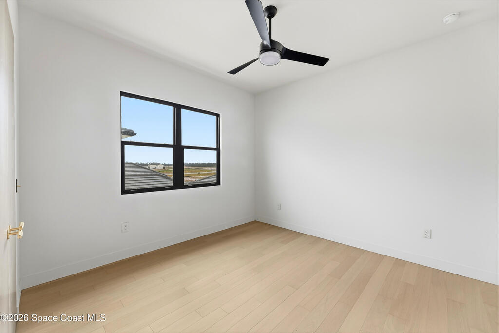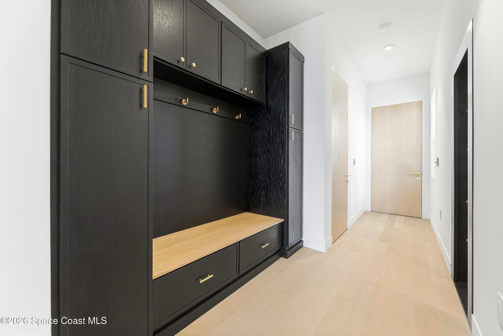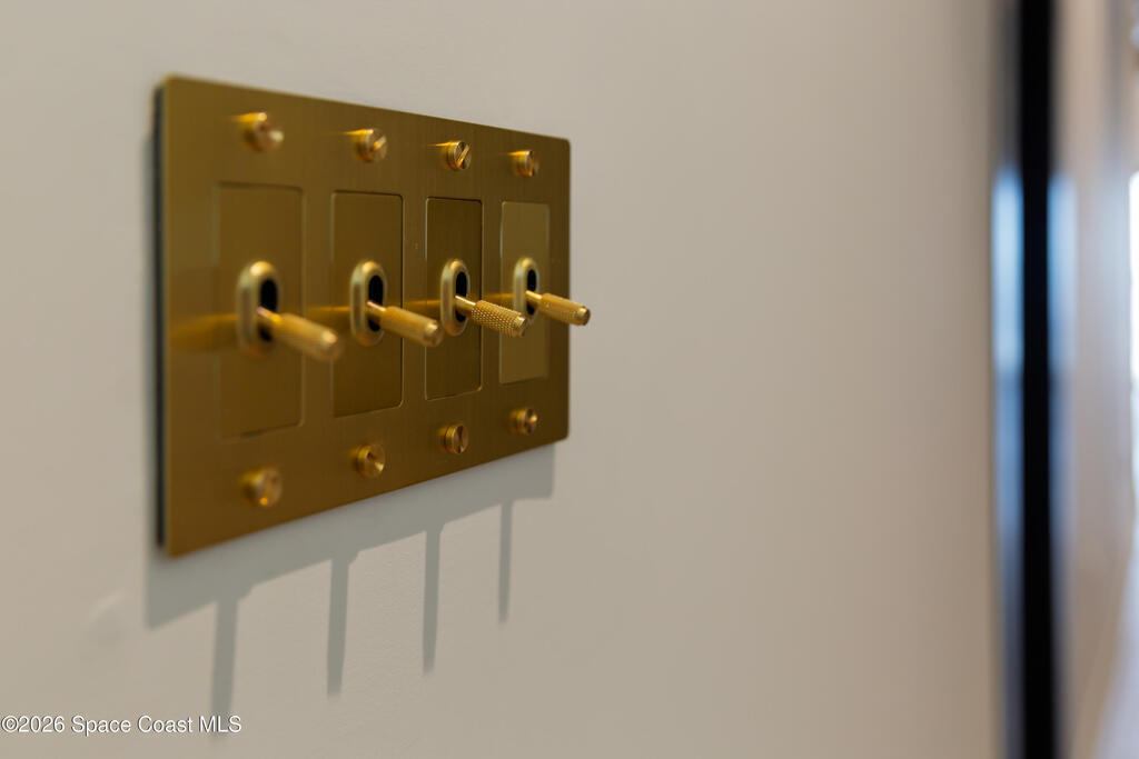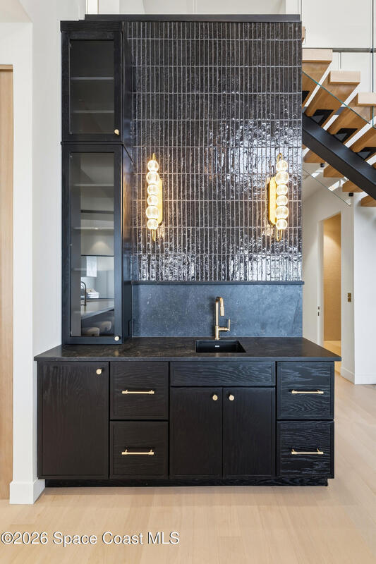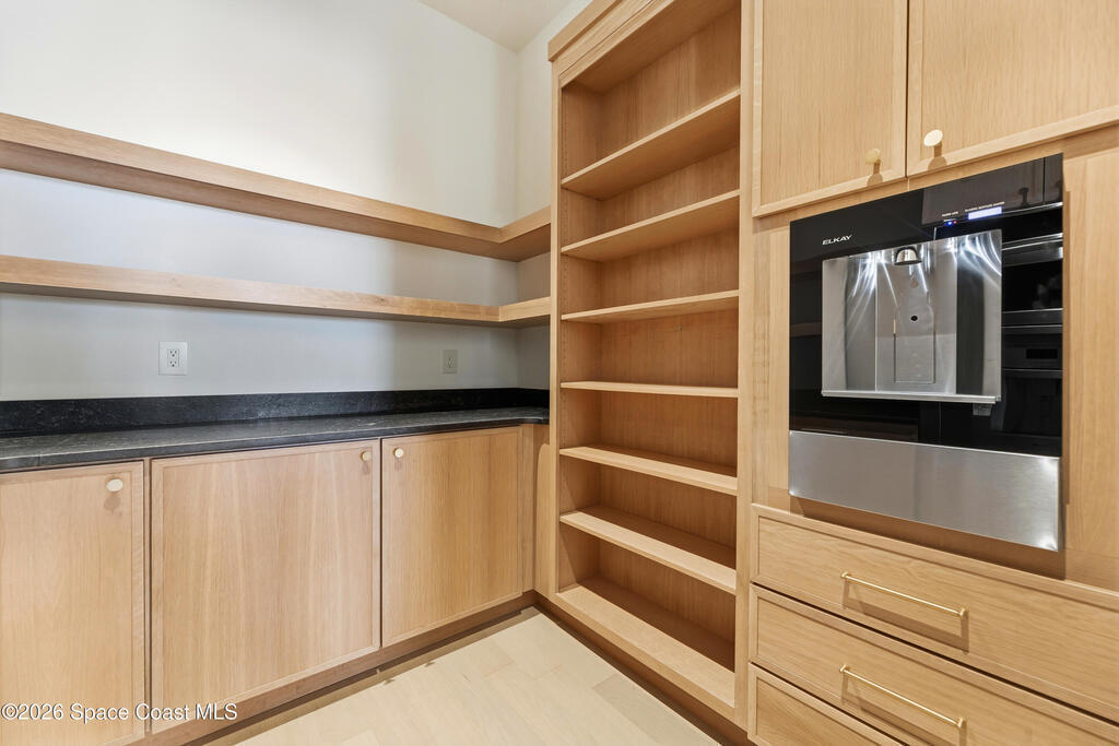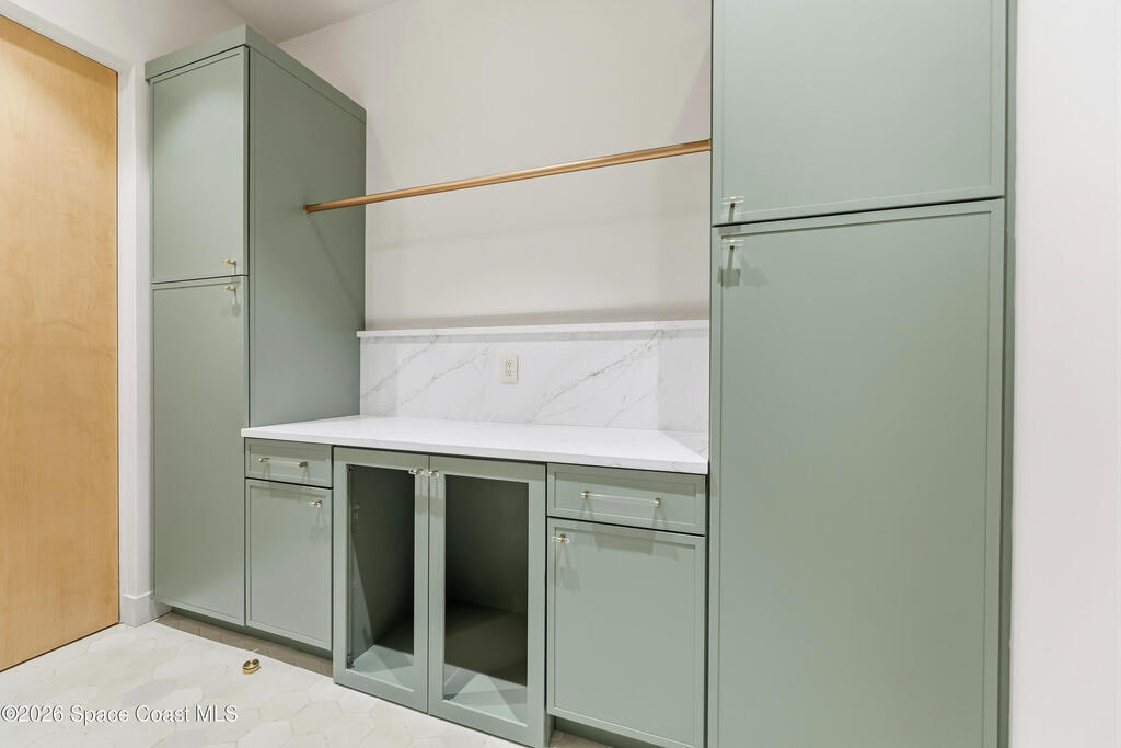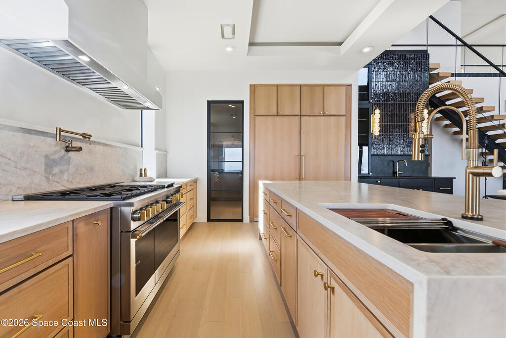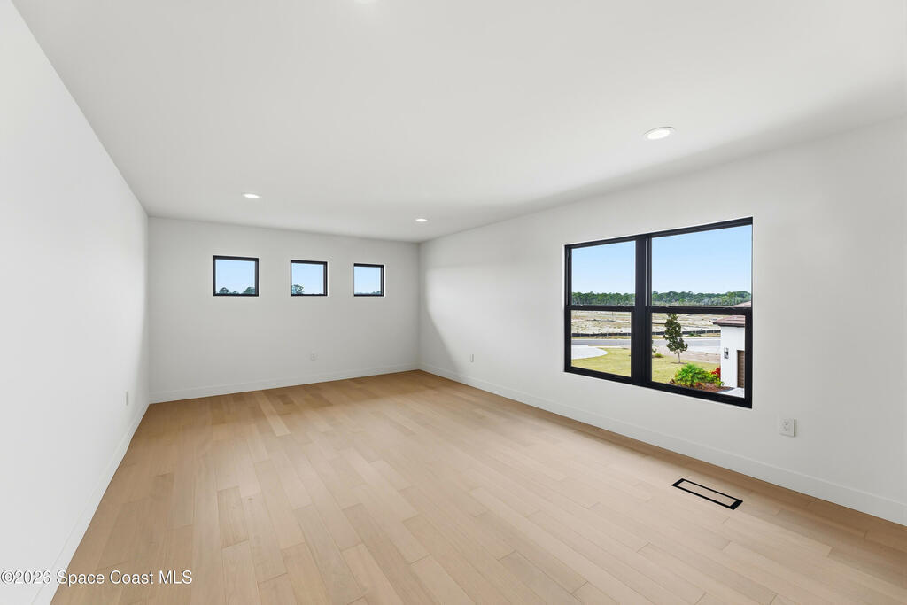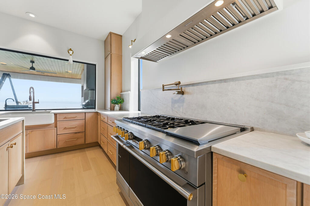Experience waterfront living in this newly custom-built luxury home, perfectly positioned along the Intracoastal within the premier gated community of The Shores at Tranquility. Set on .45 acres with 69+ feet of direct waterfront, this 4-bedroom, 4-bath residence offers an oversized bonus room, a 4-car garage and is thoughtfully designed for both everyday comfort and elegant entertaining. A beautiful double-door entry welcomes you into 23-foot ceilings and 3-5 mile waterfront views showcased through oversized sliding glass doors, creating an unforgettable first impression with front-row views of Kennedy Space Center rocket launches, abundant wildlife, and breathtaking sunrises from the comfort of home.The heart of this home is a chef's kitchen featuring premium Monogram appliances, a 48-inch gas range with double ovens, six burners, and a griddle, quartz countertops with waterfall edges,