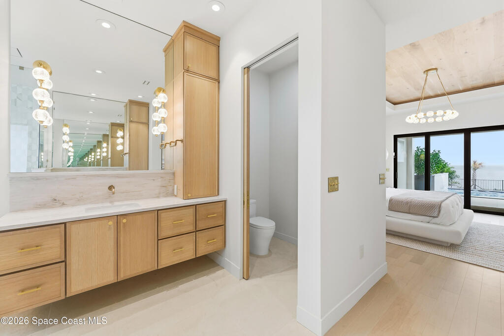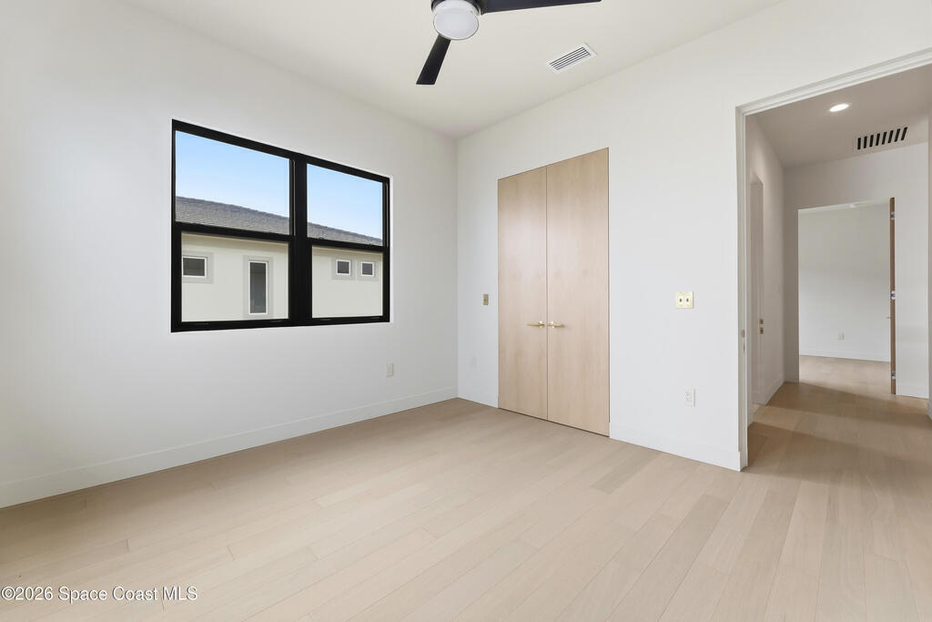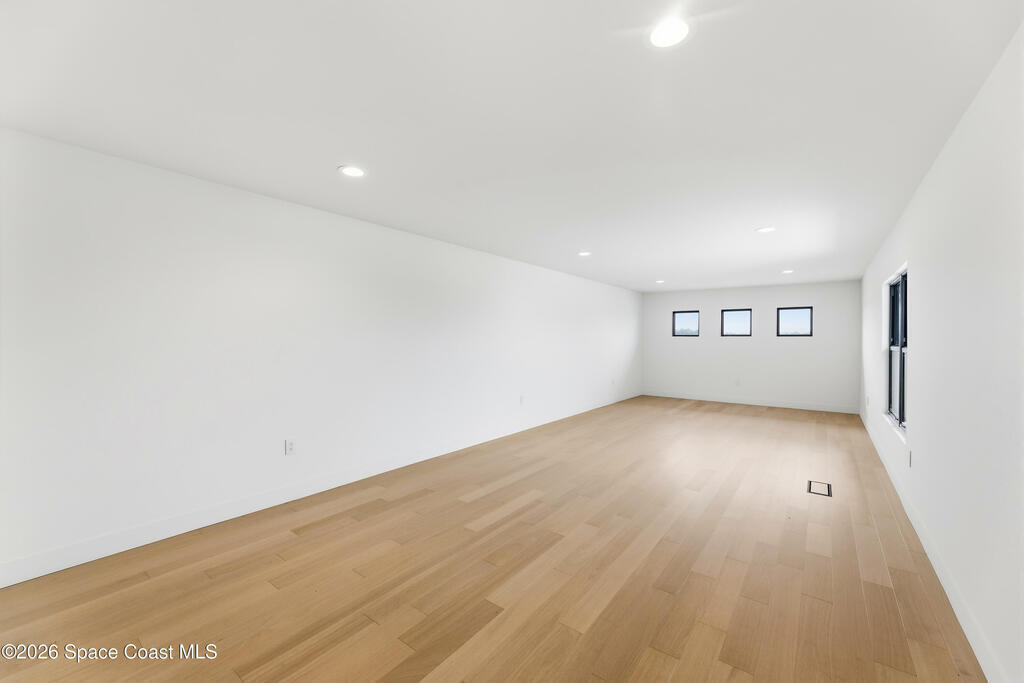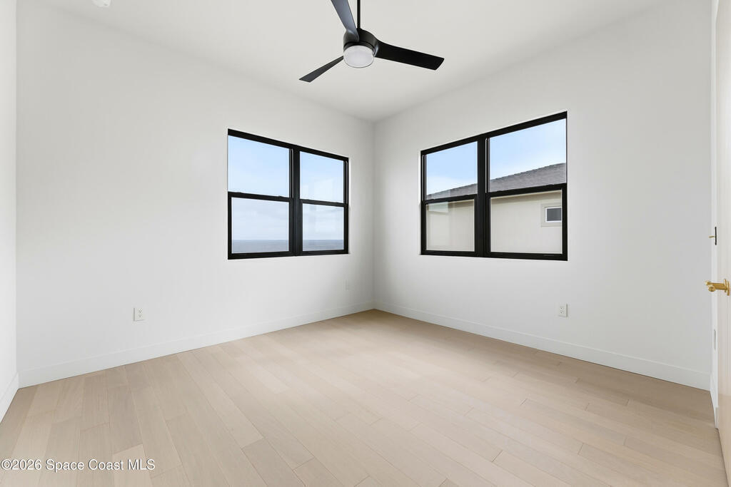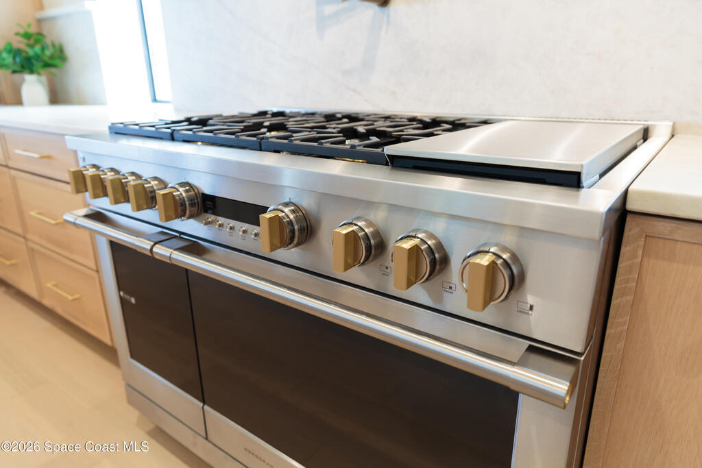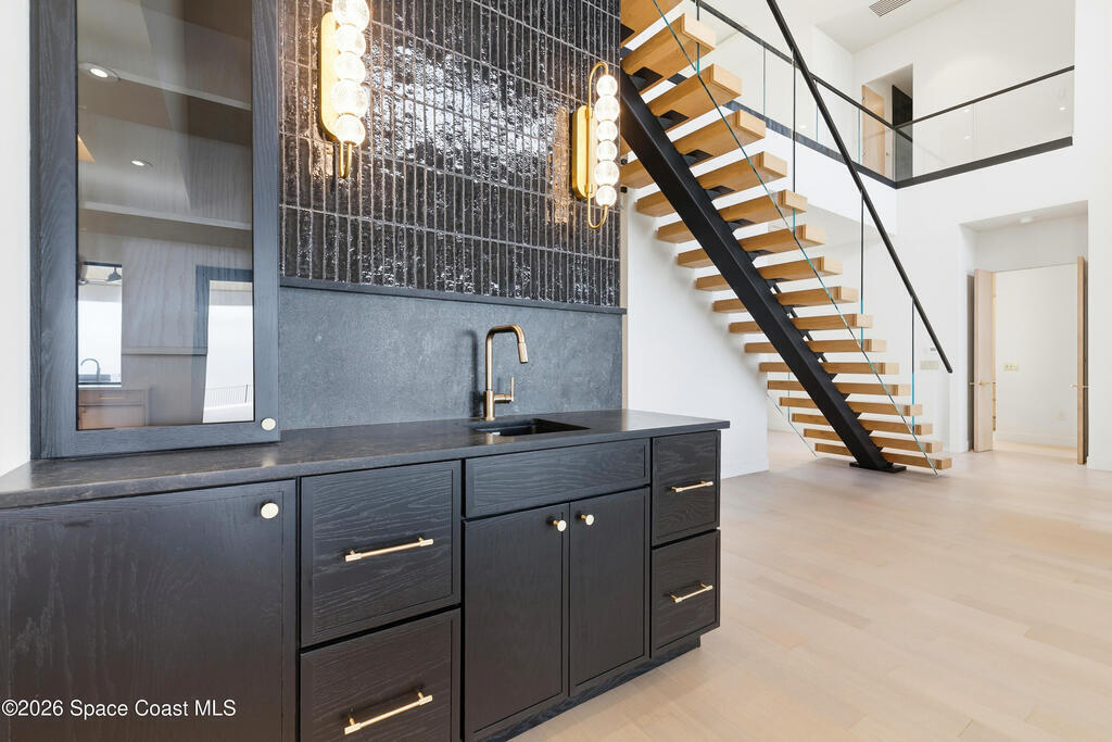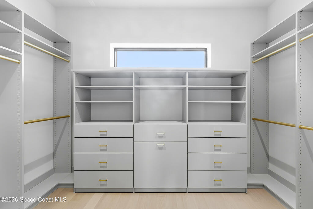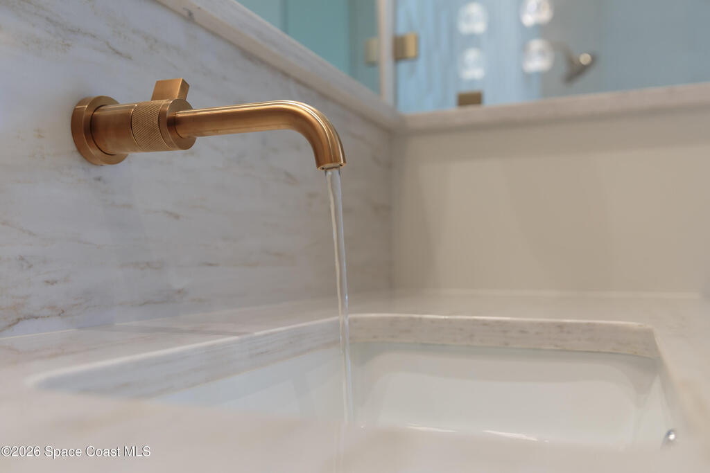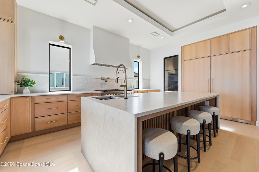 Experience waterfront living in this newly custom-built luxury home, perfectly positioned along the Intracoastal within the premier gated community of The Shores at Tranquility. Set on .45 acres with 69+ feet of direct waterfront, this 4-bedroom, 4-bath residence offers an oversized bonus room, a 4-car garage and is thoughtfully designed for both everyday comfort and elegant entertaining. A beautiful double-door entry welcomes you into 23-foot ceilings and 3-5 mile waterfront views showcased through oversized sliding glass doors, creating an unforgettable first impression with front-row views of Kennedy Space Center rocket launches, abundant wildlife, and breathtaking sunrises from the comfort of home.The heart of this home is a chef's kitchen featuring premium Monogram appliances, a 48-inch gas range with double ovens, six burners, and a griddle, quartz countertops with waterfall edges,