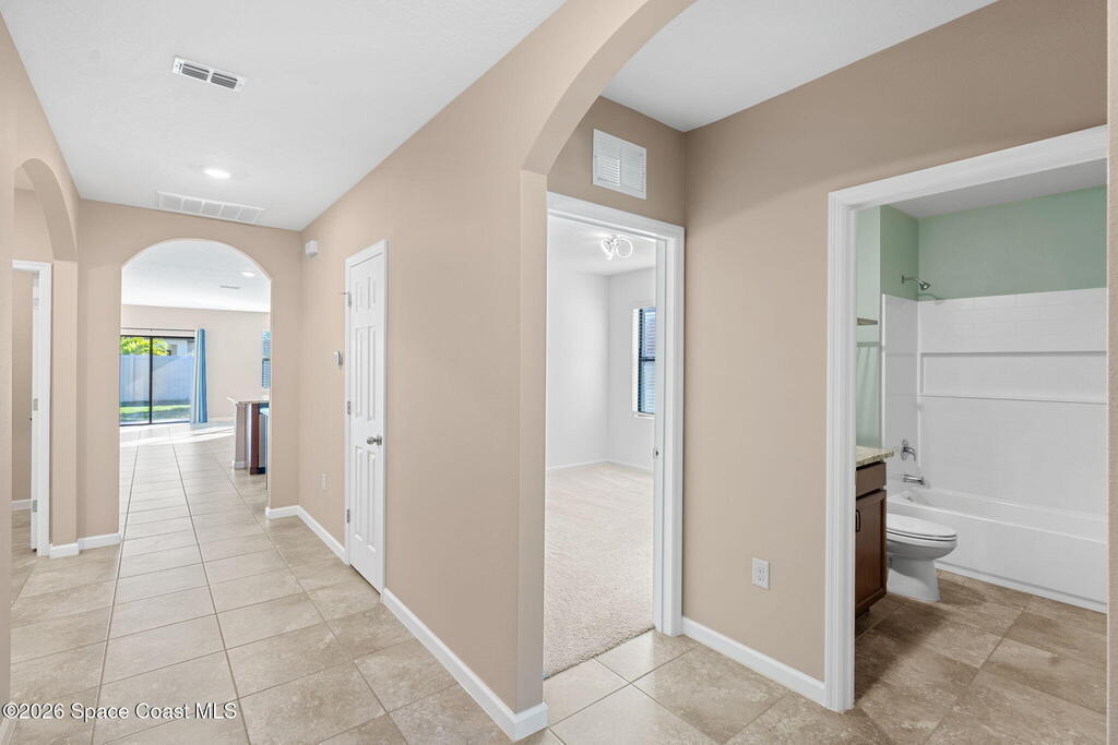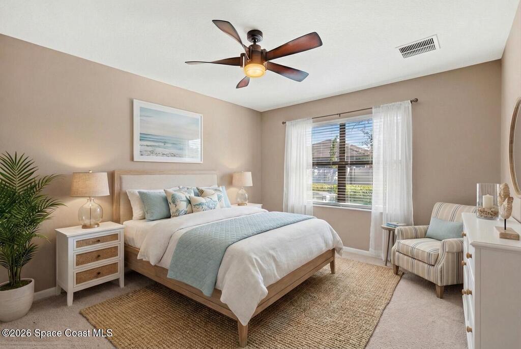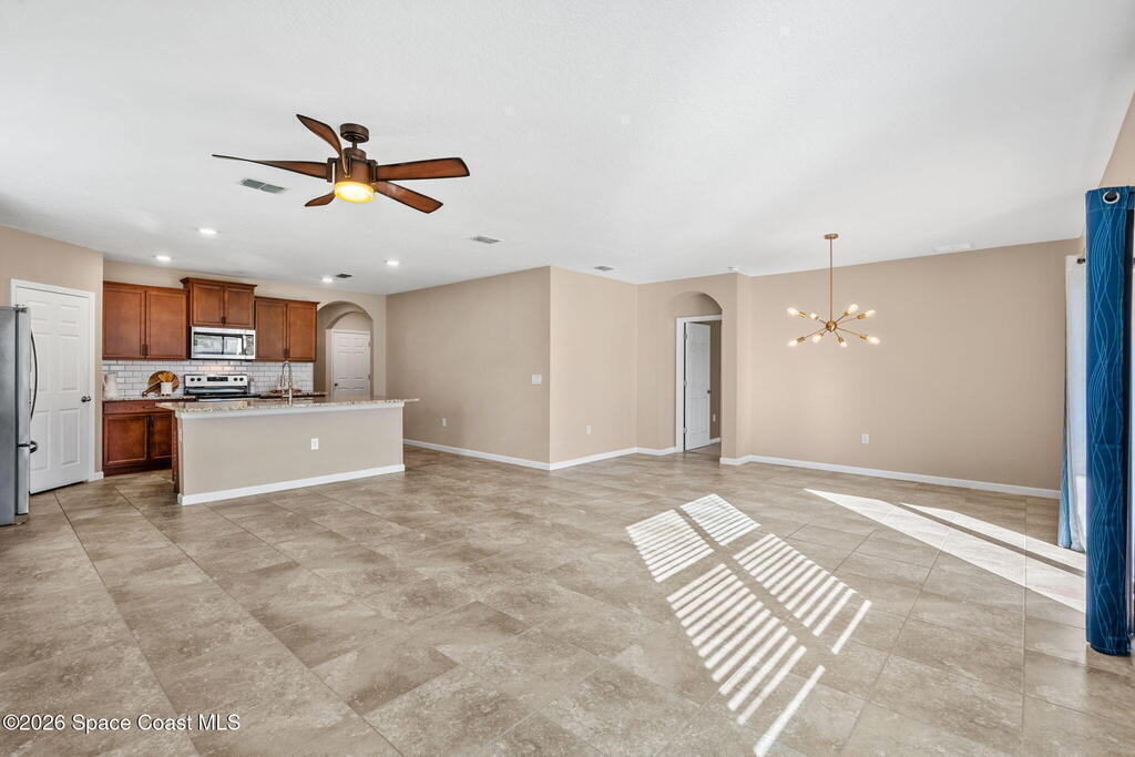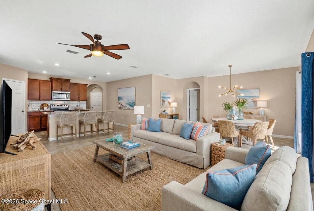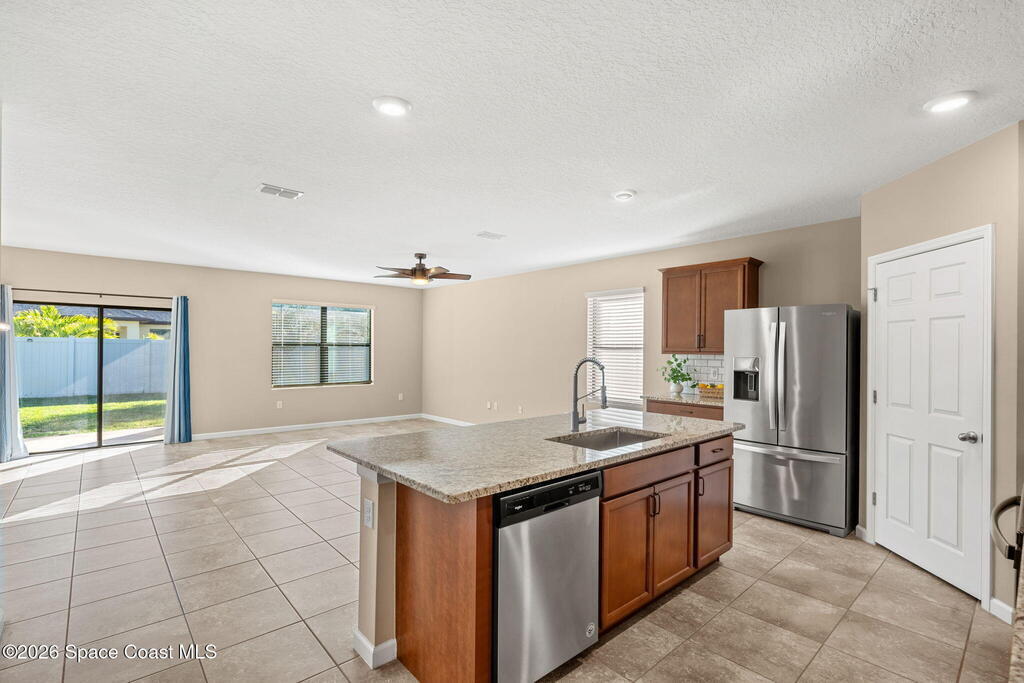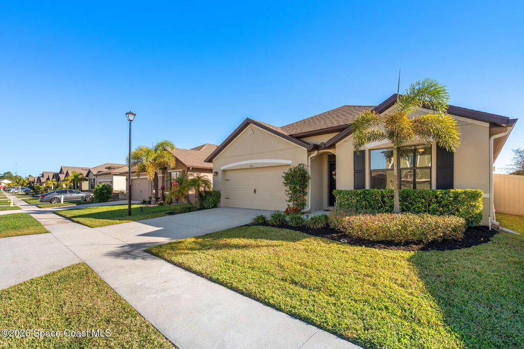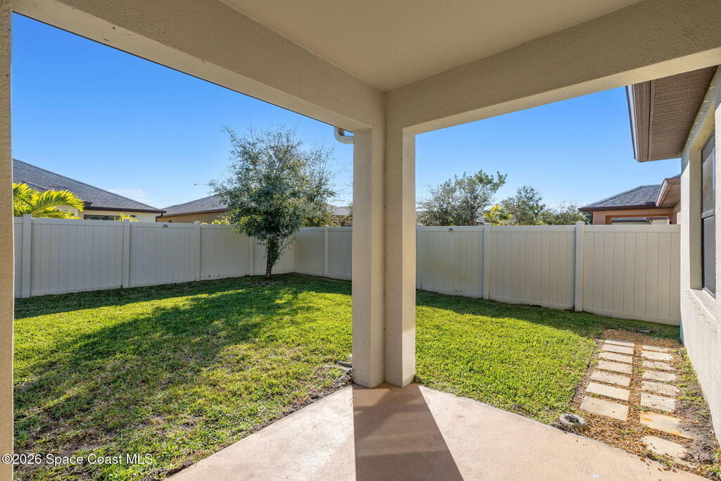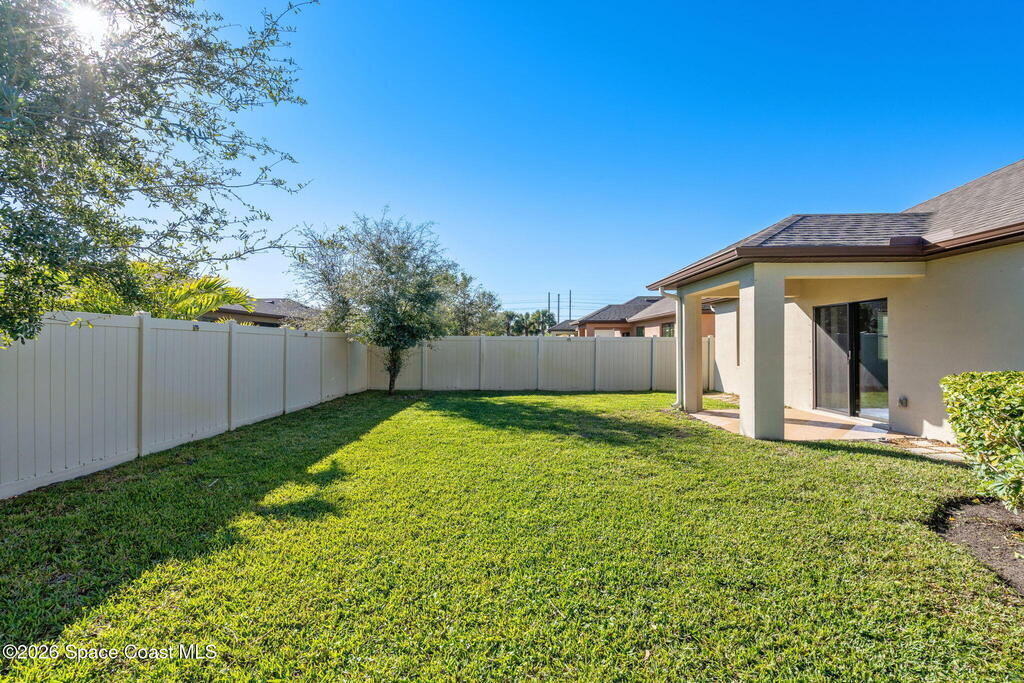 Newly built in 2021 and move-in ready, this well-maintained 4BR/2BA home offers 1, 908 living SF of open-concept living. The kitchen features upgraded granite countertops, a spacious island w/ breakfast bar seating, SS appliances, upgraded faucets and refrigerator, classic subway tile backsplash, and a walk-in pantry- many of the upgrades set this home apart from the others. The primary suite includes a walk-in closet and en-suite bath w/ dual sinks, granite countertops, and a walk-in shower. Three additional bedrooms provide flexibility for guests, a home office, or hobbies, and a dedicated laundry room adds convenience. An Apple smart home system controls lighting, door locks, thermostat, security, and more. Outside, enjoy the vinyl-fenced backyard with upgraded St. Augustine grass, ideal for pets, play, and entertaining. Located in the family/pet-friendly Southhampton Lakes community w/ a dog park. Close to shopping, dining, major employers, including L3 Harris, I-95, and much more!
