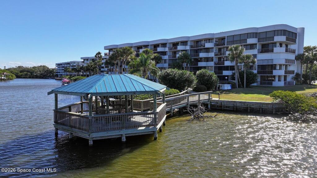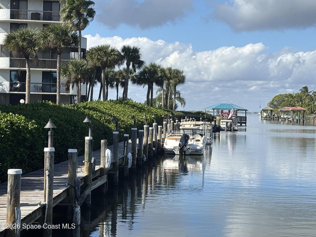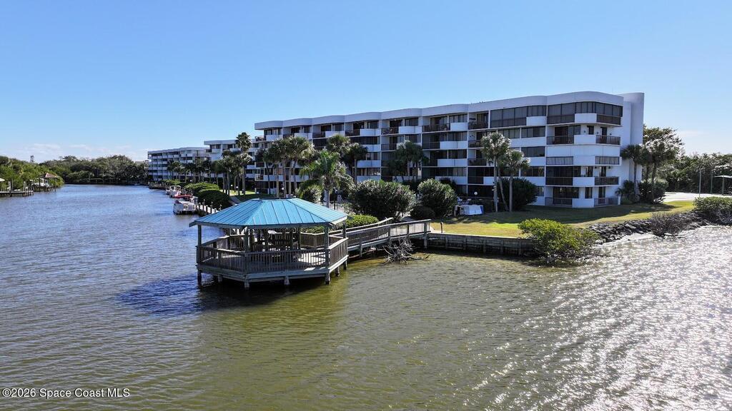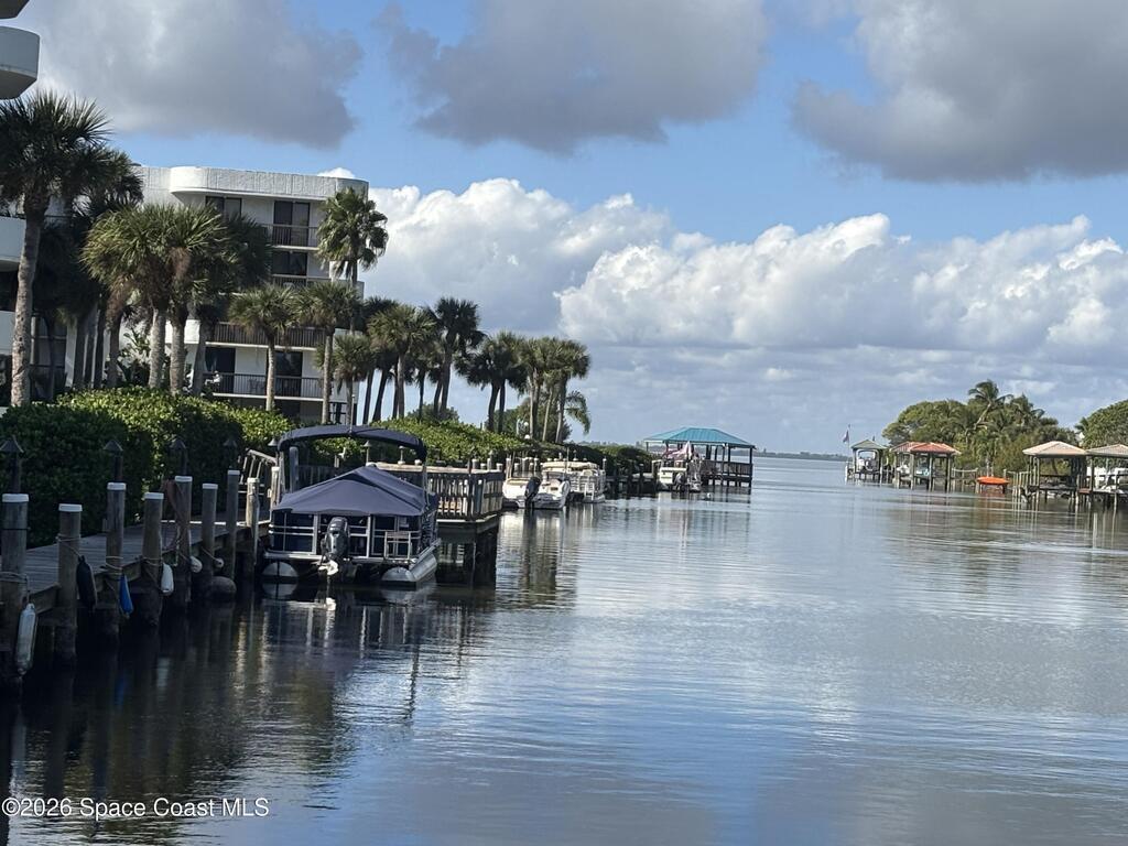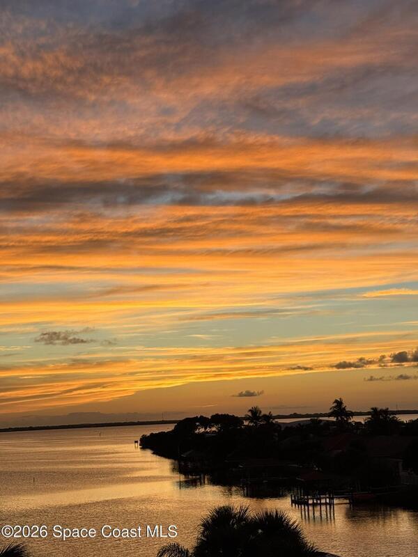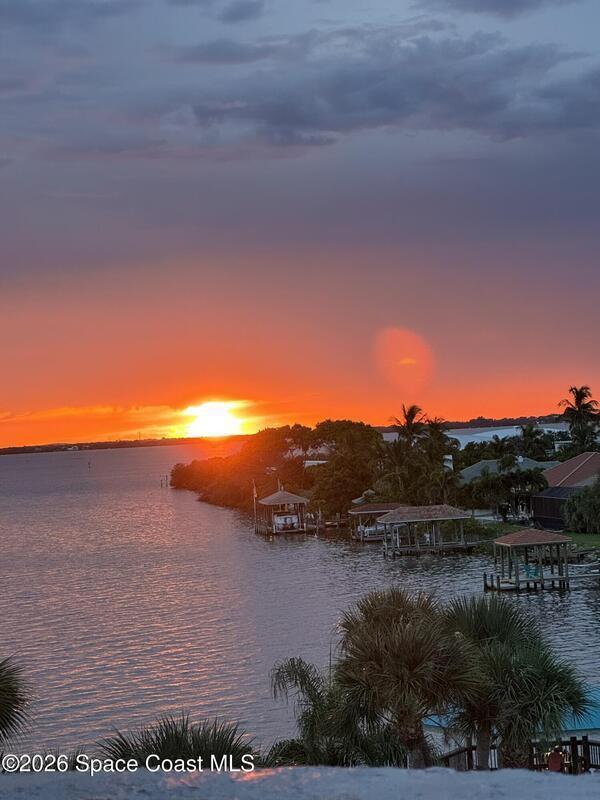 Relax at the heated pool, fish off the dock or gazebo or watch the ships come and go. See space launches and manatees play almost daily from either of the 2 balconies on the 5th floor of this 3 bedroom completely renovated river front condo in the Treasure Island gated community. Upgraded floors (no carpet), granite counter tops, updated kitchen and baths with solid wood cabinets, floor to ceiling tile bathrooms, and wood tones throughout. All roofs replaced in 2024 and the HVAC in this unit replaced 2019 (10yr. transfer warranty). The Association includes limited, but even more rare access to boat dock spaces and boat trailer spaces on-sight (assigned spaces). Association fees are one of the lowest monthly dues in the area. The monthly fee covers 2 gazebos, a heated pool, fishing from the dock that runs the length of the property, and a covered pull-through entry portico to each building for unloading vehicles at the elevator (see attached list for more upgrades & amenities).
