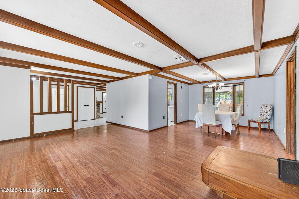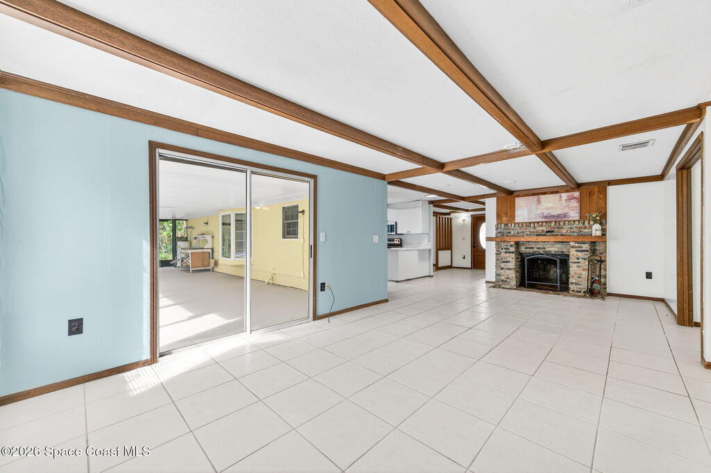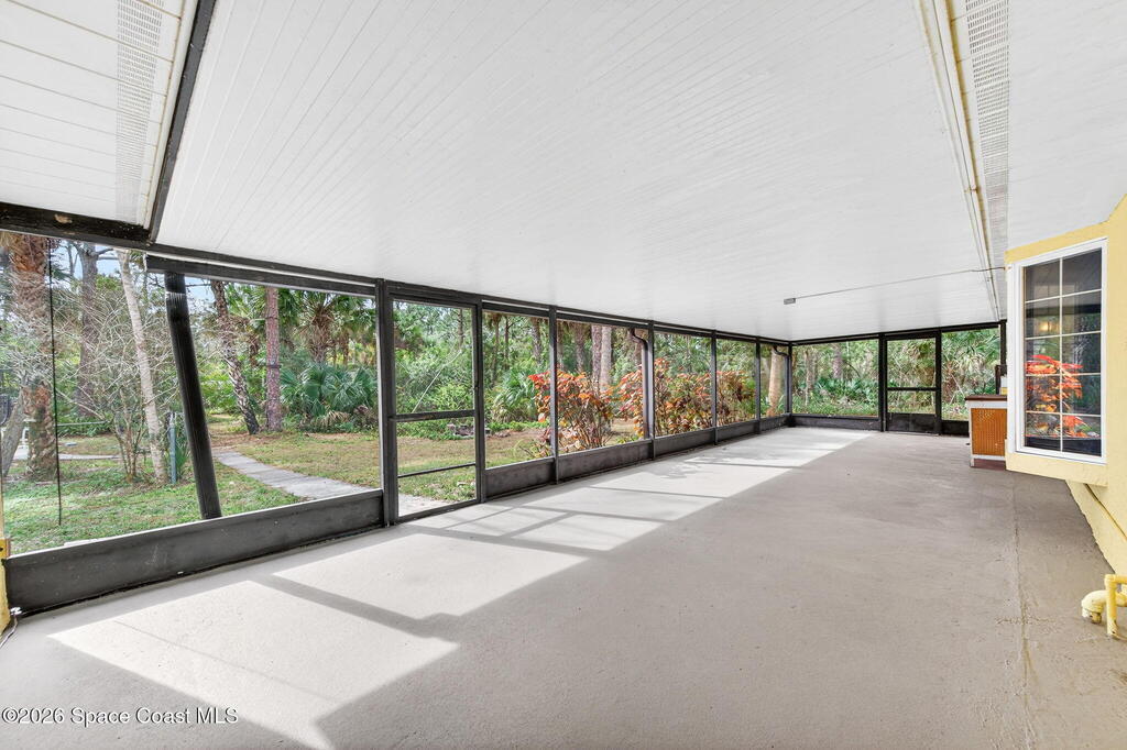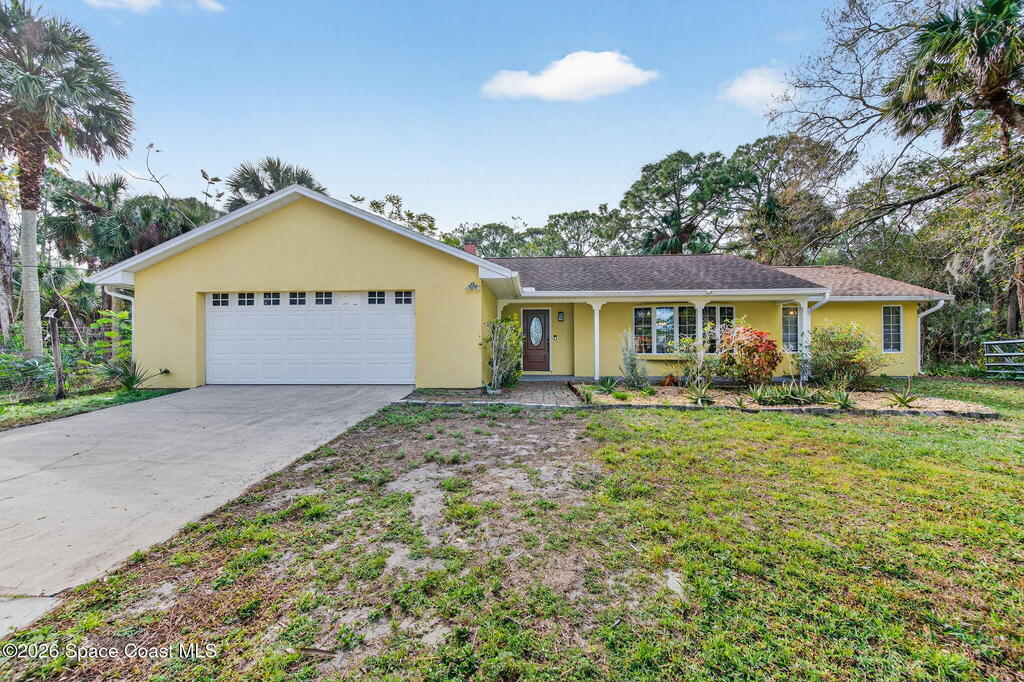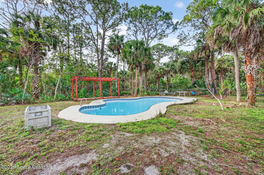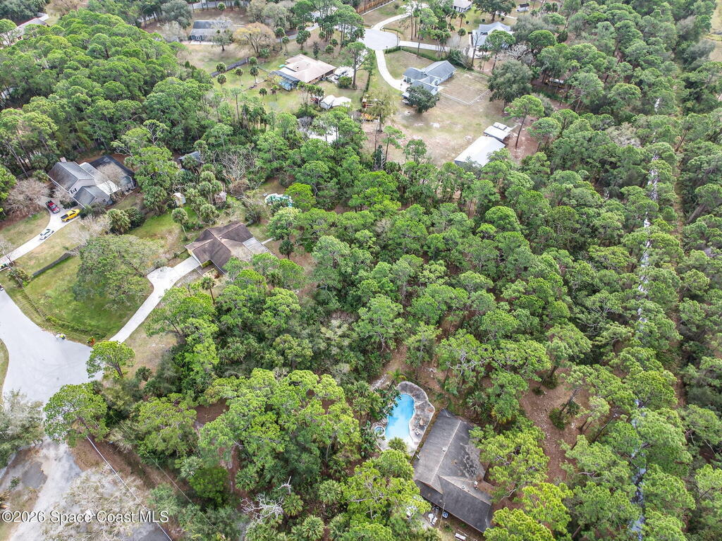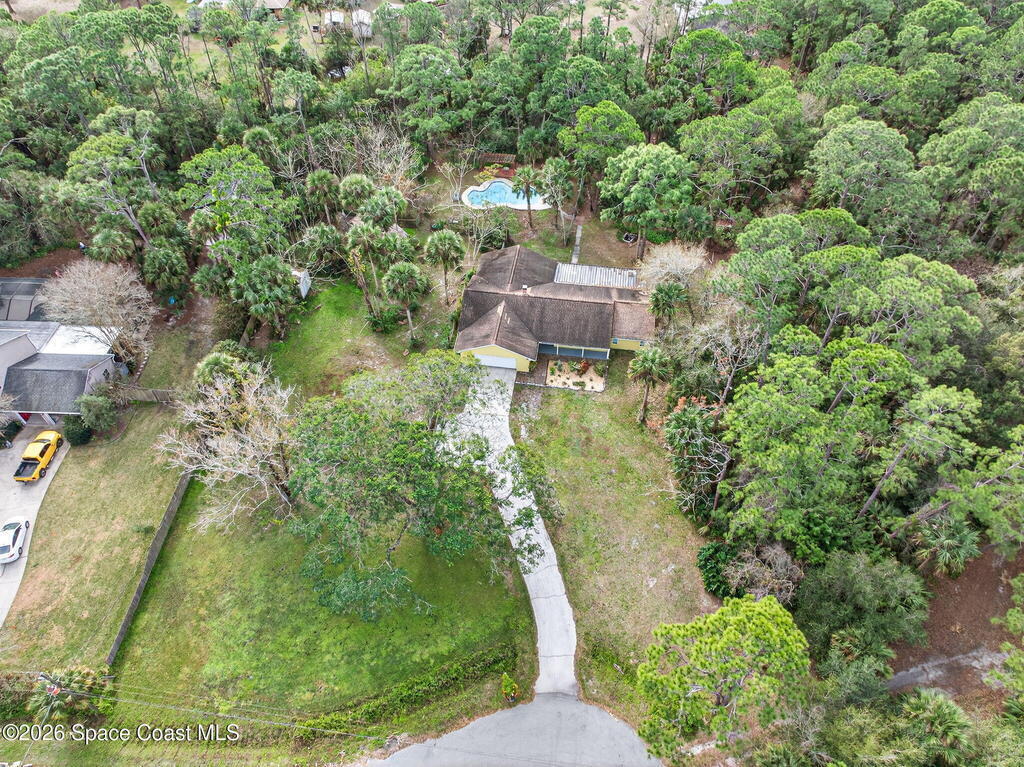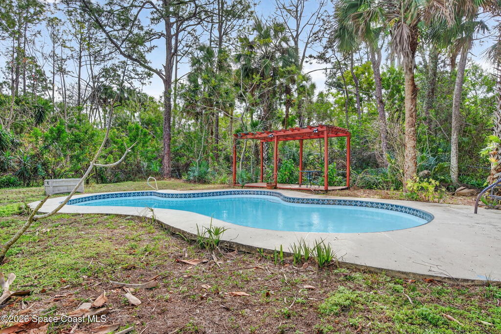 Welcome home to this charming 3 bedroom, 2 bath pool home on a quiet cul-de-sac, set on a spacious 1.86-acre lot. Zoned for horses, goats, chickens, and more, this unique country retreat offers privacy and versatility. Recent updates include HVAC (2025), chimney cap, remodeled kitchen, updated primary bath, instant tankless water heaters, new pool pump (2024), laminate flooring, solar tube, fresh interior/exterior paint. Low ceilings and excellent insulation make for lower electric cost. Outdoor features include a 7-foot-deep inground pool, cabana, fire pit, huge covered screened porch, shed, open barn, fencing, pond (low level with dry weather), and nature trail. No HOA--RV and boat parking allowed. Enjoy peaceful living near I-95 and the Beachline, less than 20 minutes to Titusville, Merritt Island, Rockledge, and Viera. Close to Airports, Schools, Dining and Entertainment.