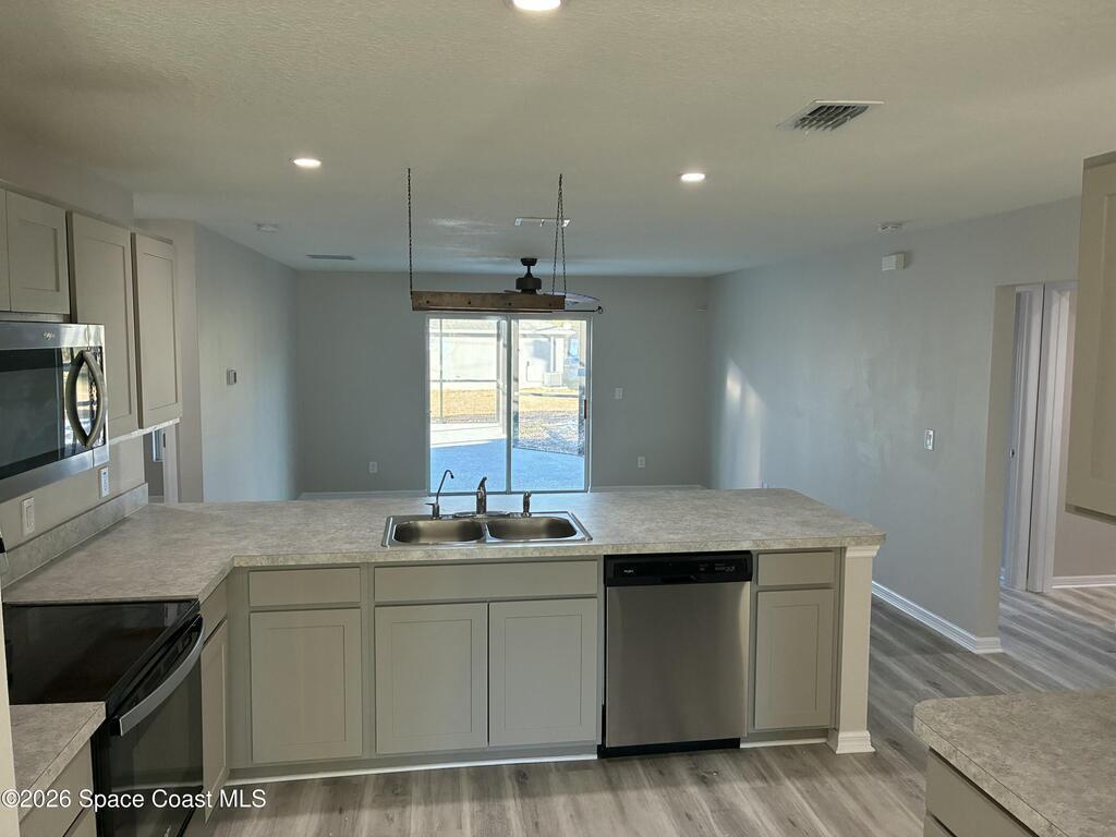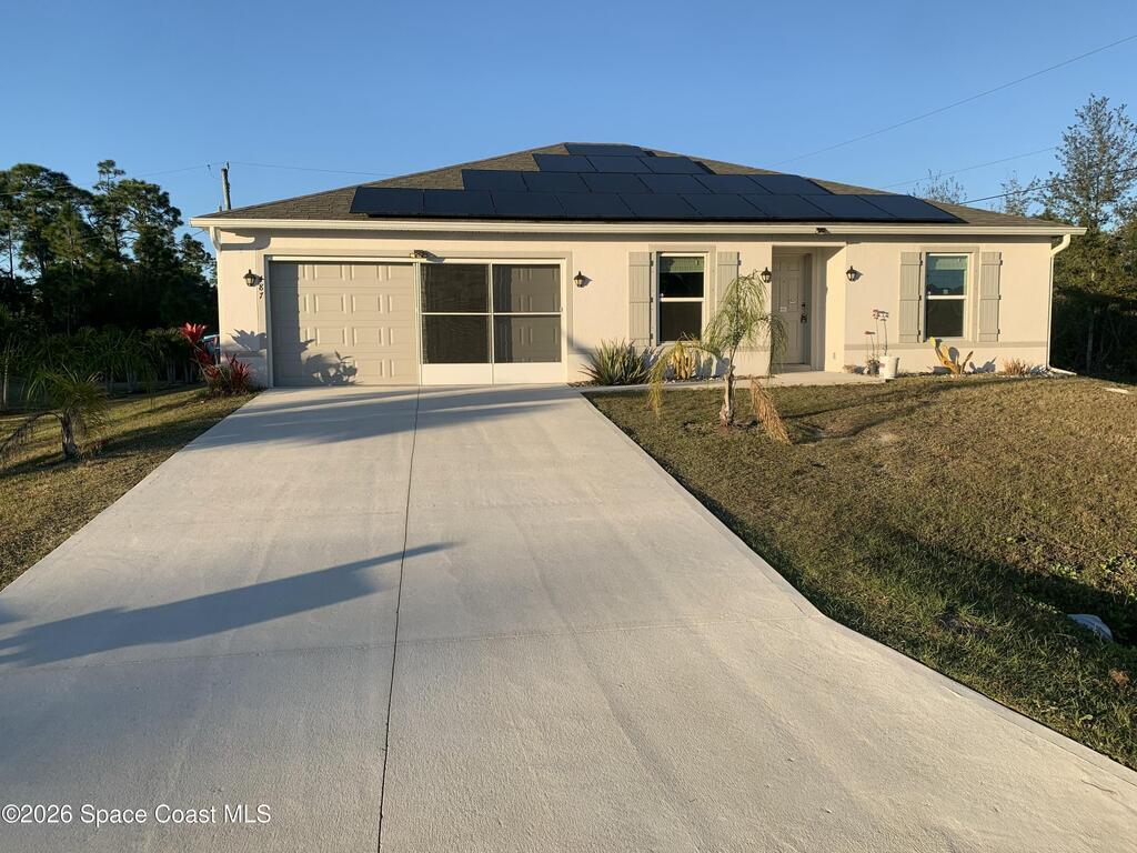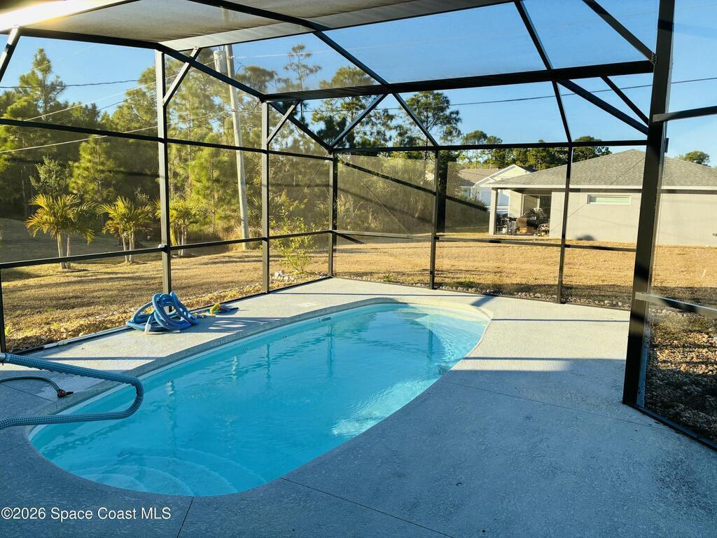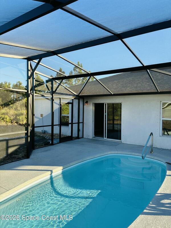 SE Palm Bay POOL home! Tons of conveniences to help keep those biils LOW! Solar panels, private well, whole house filtration system, reverse osmosis system, and septic system. Fresh interior paint! Luxury vinyl plank and tile floors. Formal living.formal dining, Open kitchen area with breakfast bar. Family room with sliding glass door to screened pool area. Split plan. Roomy primary bedroom with en-suite bath with walk-in shower and walk-in closet. Saltwater pool with screen enclosure. Large .23 acre lot. Inside laundry room with full size washer and dryer hookups. Owner including pool service and lawn service in the rent.