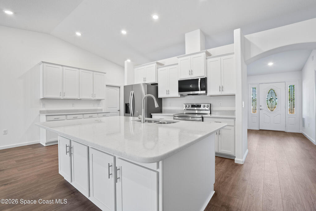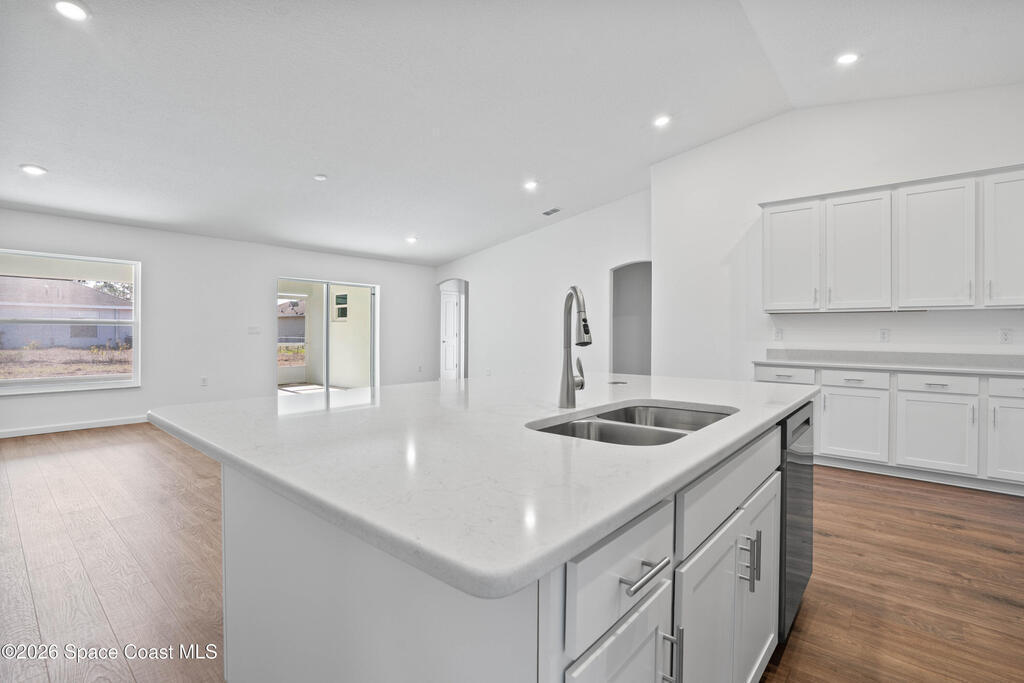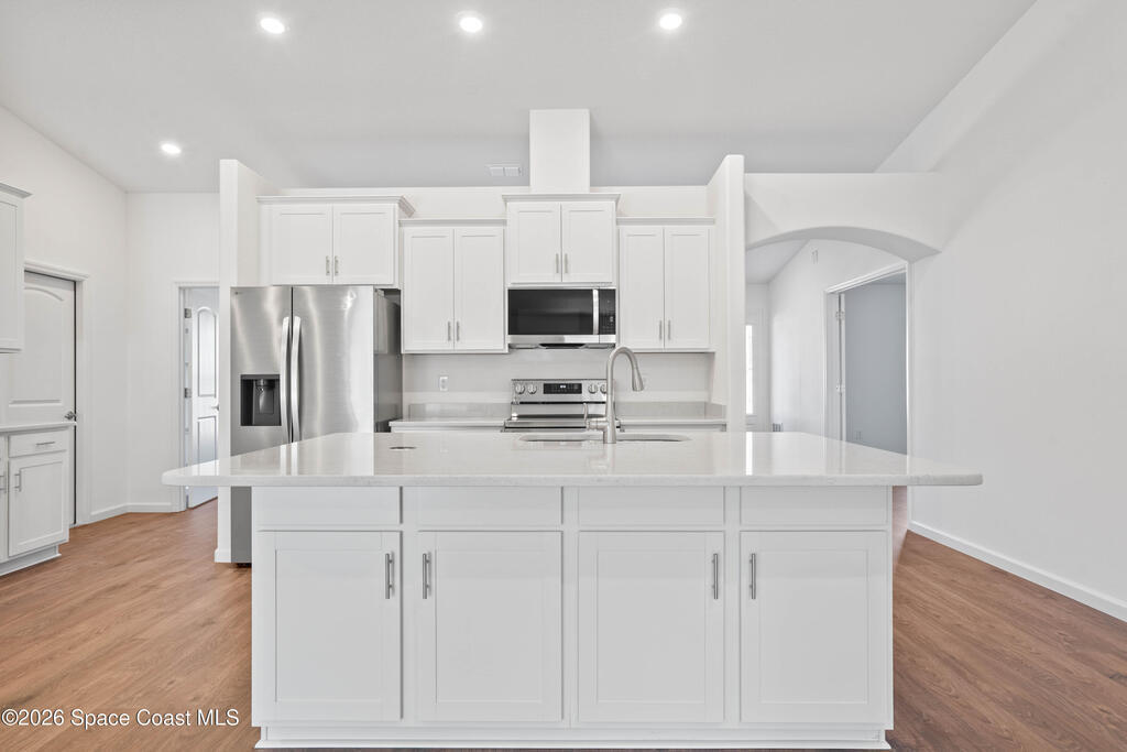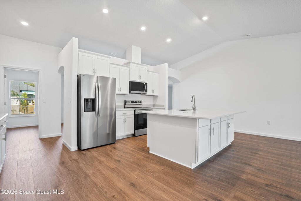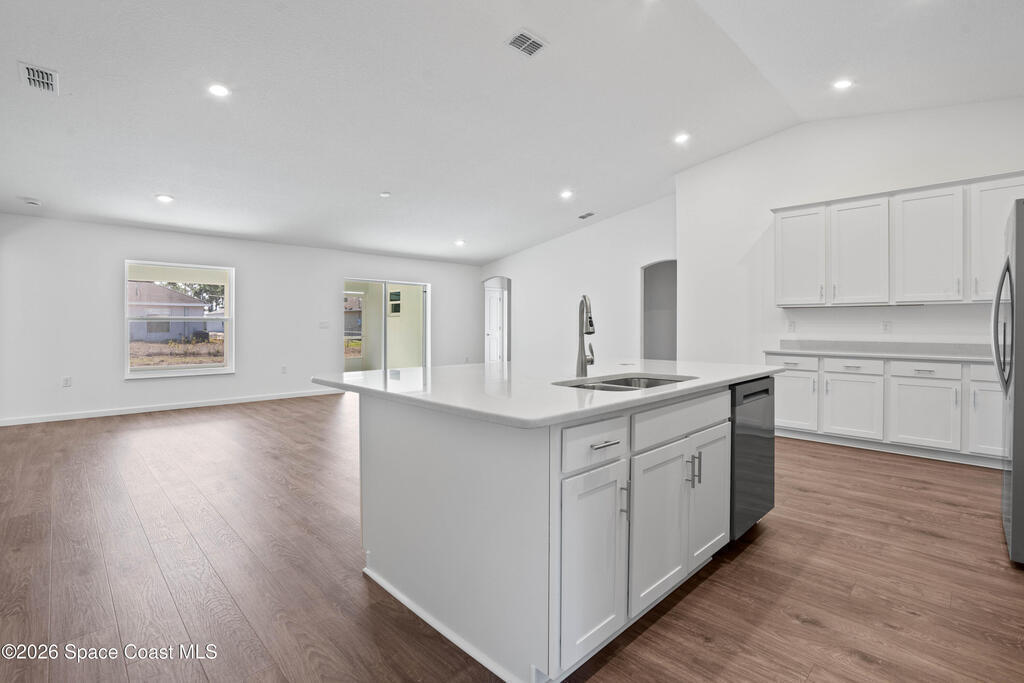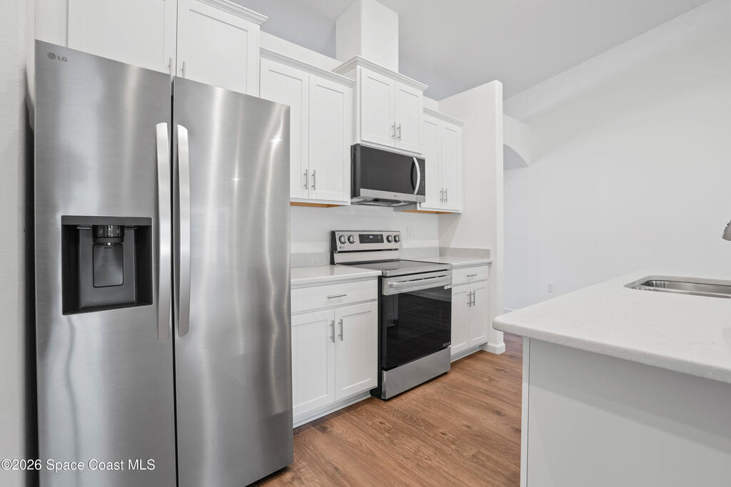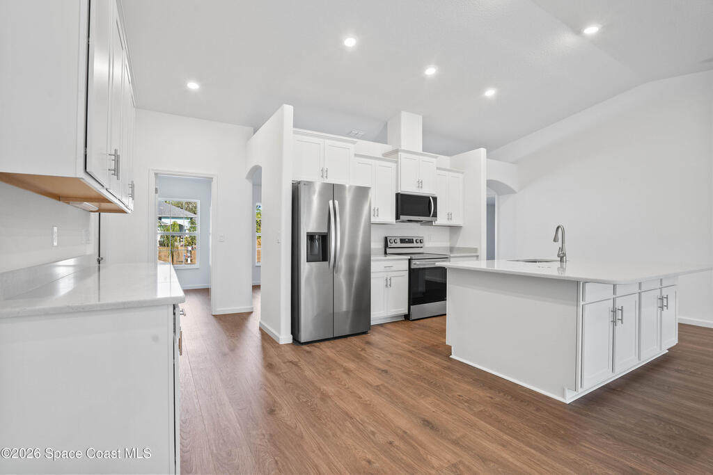 Beautiful New Construction Home on City Water with Septic.This amazingly designed 4-bedroom, 3-bath home with a dedicated den and 2-car garage offers comfort, style, and energy efficiency throughout. Enjoy an open living space with Mohawk RevWood plank flooring throughout the home and tile flooring in all bathrooms and the laundry room. The kitchen features staggered white cabinets with crown molding, quartz countertops, stainless steel appliances including range, dishwasher, built-in microwave, and a 25 cu. ft. side-by-side refrigerator. Cabinets above the washer and dryer add extra storage, and the kitchen vents to the exterior. The primary suite boasts a tray ceiling, dimmable LED lighting, and a spacious 9-foot walk-in tiled shower. Both guest bathrooms include Level 2 tile surrounds. The family room and primary bedroom feature LED lighting on dimmers for added ambiance. Additional highlights include a 20' x 12' trussed screened porch, exterior stone accents, double single-lite