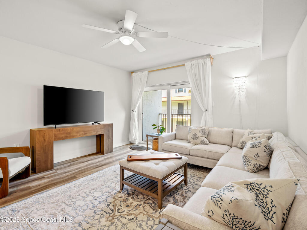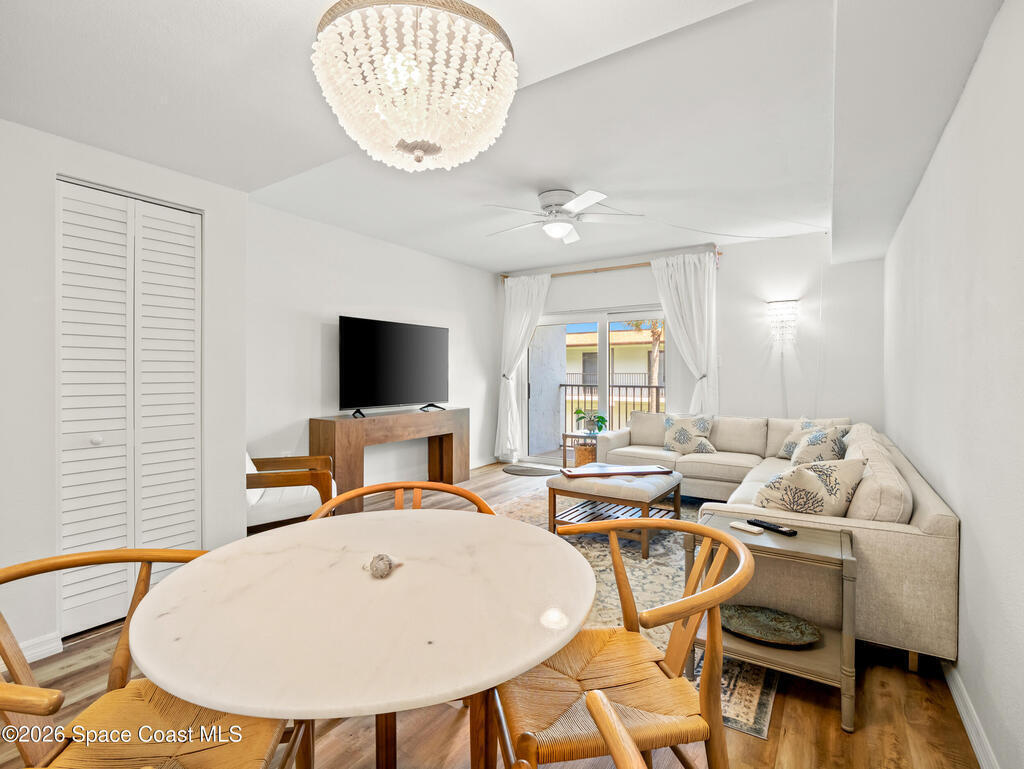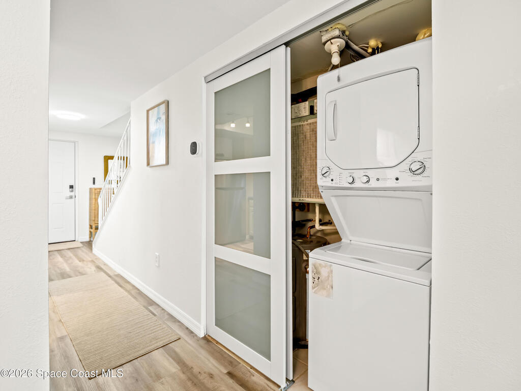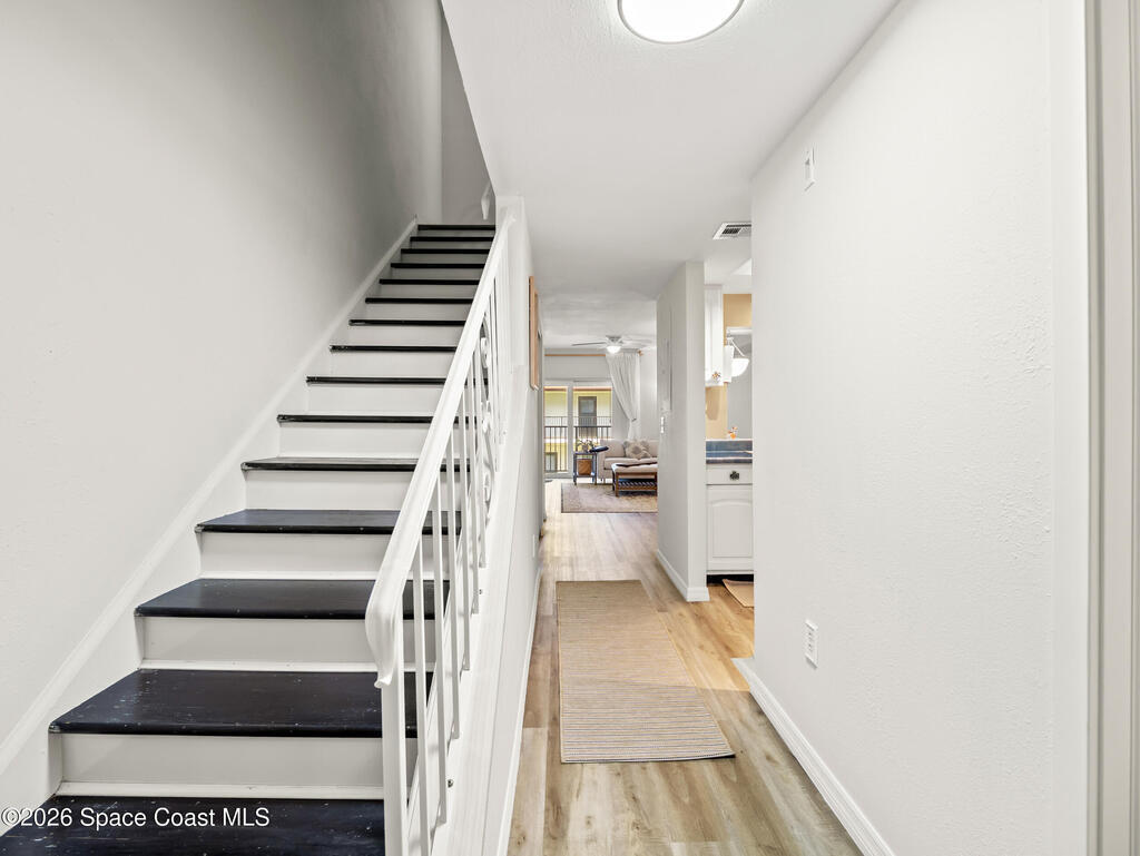 Wake up to ocean breezes in this beautifully updated 2-bedroom, 2.5-bath, two-story condo located in an oceanfront community in Satellite Beach. This unit offers peek-a-boo ocean views from the balcony and primary bedroom and is fully furnished and move-in ready. The entry level features LVP flooring, a stylish powder room with shiplap walls and Serena & Lily wallpaper, and a well-appointed kitchen with stainless steel appliances and a stackable washer and dryer, plus balcony access for coastal air. Upstairs are two spacious bedrooms, each with en-suite bathrooms and continued LVP flooring. Additional highlights include a newer A/C, all assessments paid, a heated community pool, and pet-friendly policies allowing larger dogs. Rentals are permitted for as short as one month, offering excellent flexibility. Condo dues include insurance, exterior maintenance, water, sewer, trash, cable, and high-speed internet, making ownership simple and carefree in this desirable beachside setting.