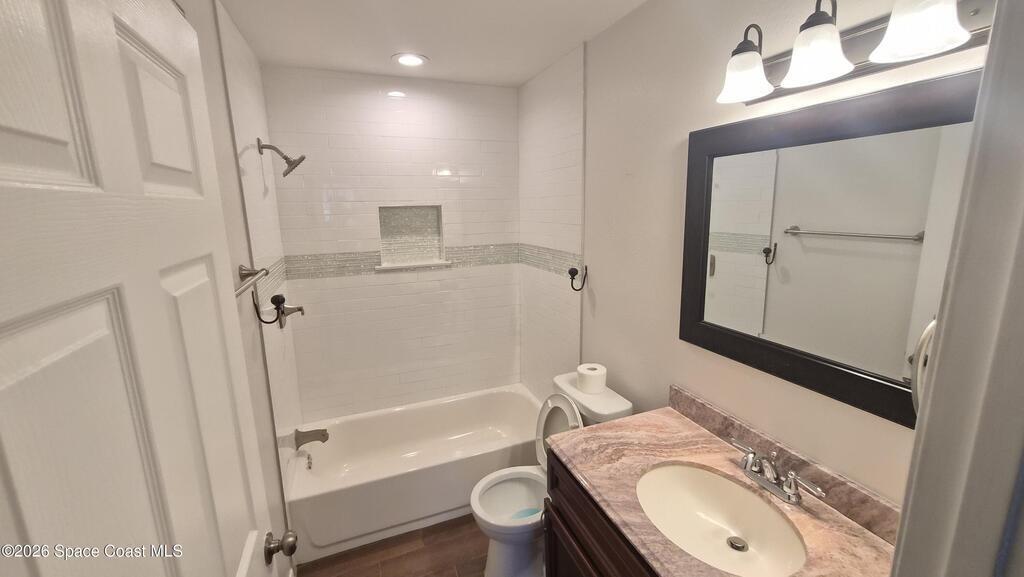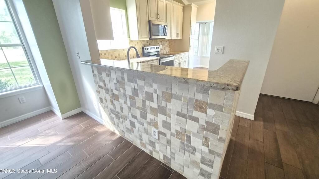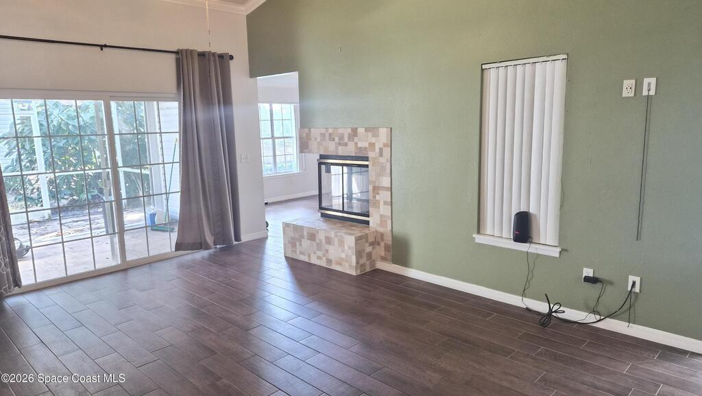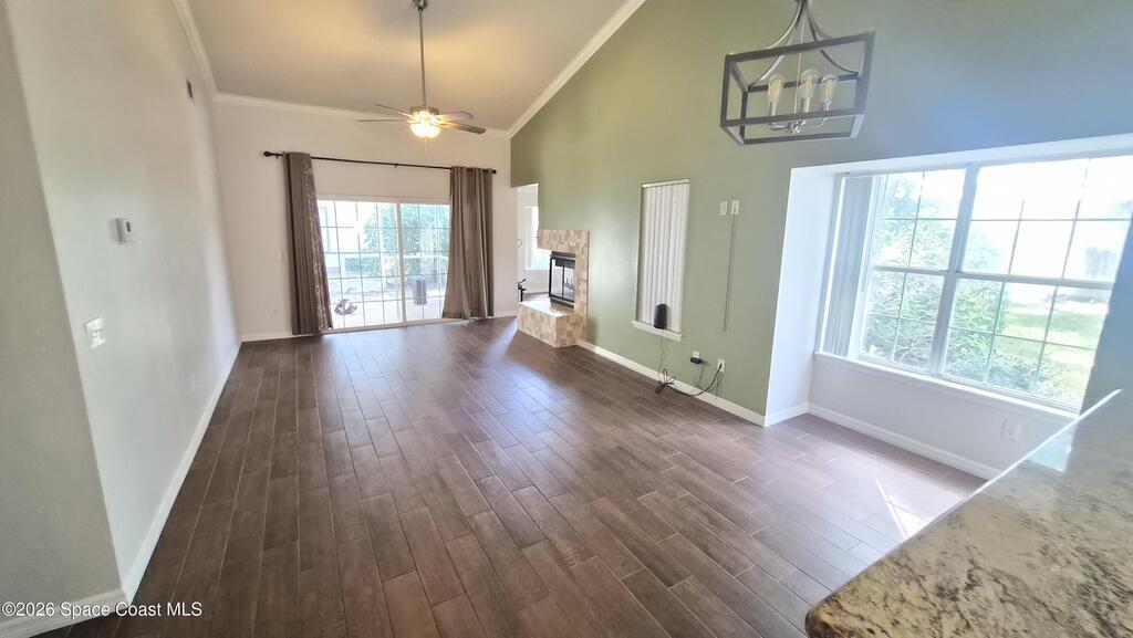Beautifully updated Villa. 1 level with no one above you. This floorplan has the added family room at the rear for extra sq. ft. 2 br. 2 ba. 1 car Garage. The Granite kitchen has stainless steel appliances, and cabinets are newer, extra cabinets were added for pantry space with pull-outs. Eat in kitchen in the bay window. The wall was removed, opening it up to the living area, and a breakfast bar installed with nice stonework matching the backsplash. Large living room with 2 sided fireplace going into the rear family room. Inside was just freshly painted. Beautiful and durable wood look tile is throughout this Villa. Crown molding installed throughout. Both bathrooms were recently remodeled with new vanities and showers. A/c and roof are approximately 5 years old. Hurricane shutters. The $400 H.O.A fee includes so much including: cable t.v. & high speed internet, pool, lawn/landscaping, and insurance, exterior maintenance, trash pickup & roof replacements..