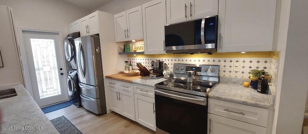 Dishwasher, Dryer, Electric Range, Microwave, Refrigerator, Washer, Washer/Dryer Stacked