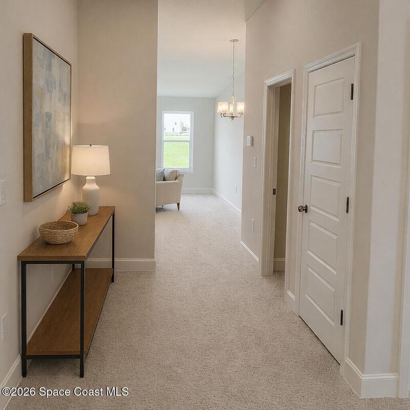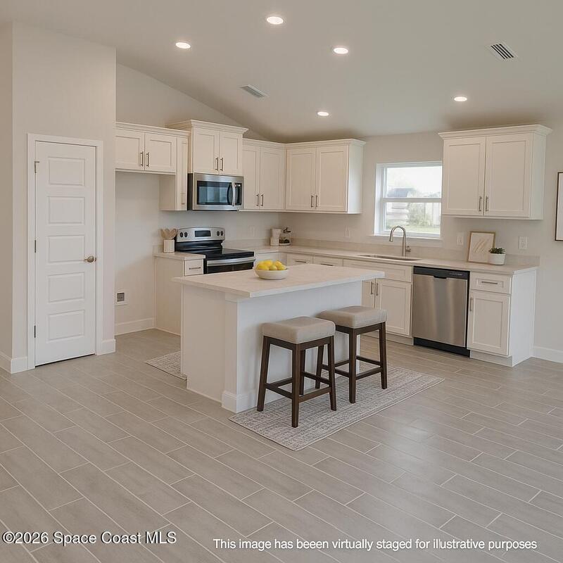 Relaxed Florida living with modern design. A covered front porch and open foyer welcome you into a spacious living and dining area with vaulted ceilings and abundant natural light. The open-concept kitchen features an island overlooking the living spaces, ideal for gatherings and entertaining. Finishes include crown-molded cabinets, tile floors in wet areas, stainless appliances, designer lighting, 5' baseboards, and lever-handle doorknobs. The split plan offers a private primary suite with walk-in closet, soaking tub, separate shower, dual vanity, and tile floor. A large trussed back porch extends your living outdoors for year-round grilling and relaxing. St. John's Preserve is a gated Palm Bay community with 2 entrances, pool, playground and lit sidewalks.