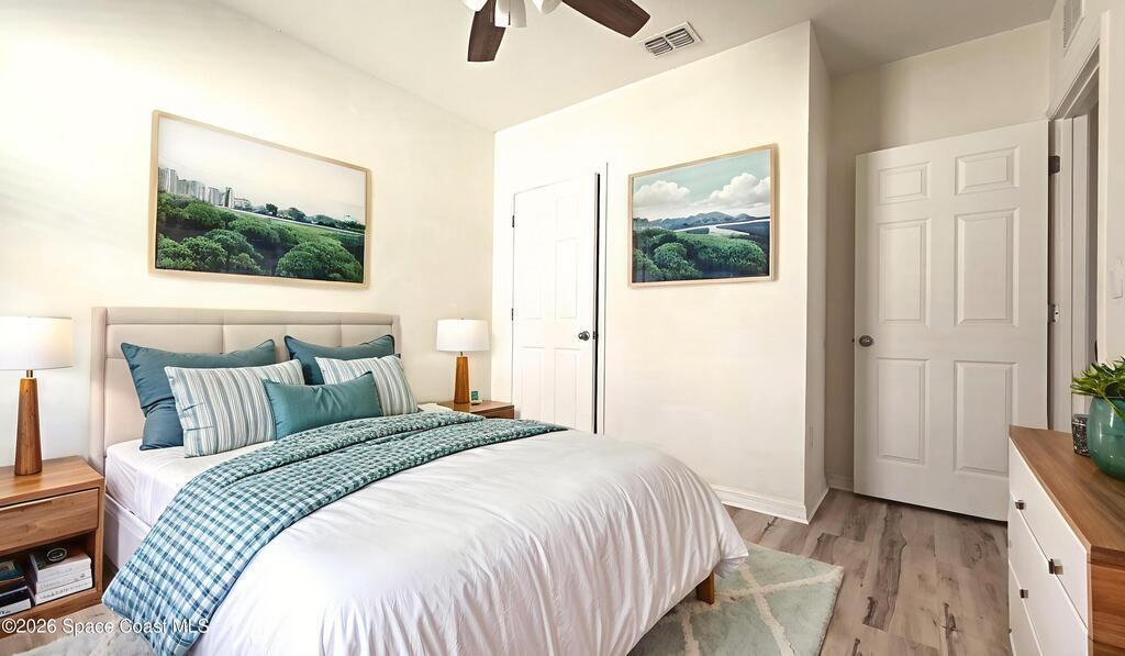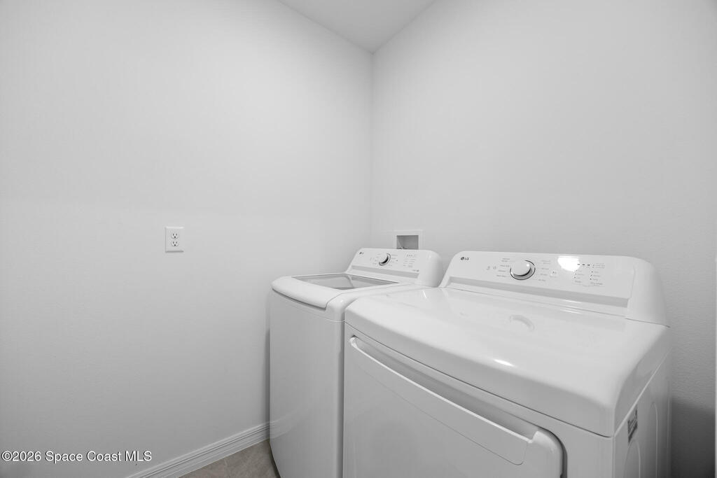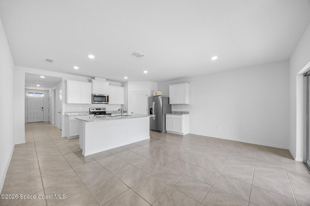Welcome to your 2024 built home of modern living. Offers four bedrooms and two full baths, and a 2 car-garage, and a gorgeous lake view. City water and sewer. Interior highlights: tiles in kitchen, living areas and bathrooms, luxury vinyl in bedrooms (some old photos shown carpets). Kitchen with breakfast island and SS appliances. Spacious master with a huge walk-in closet. Split bedrooms. Lots of natural light. Great location: 2 mins to I-95, minus to 192 with Publix, Target, Home Depot, shops and restaurants, 20 mins to beach, 50 mins to Orlando airport, 1 hr to Disney. Make it home!