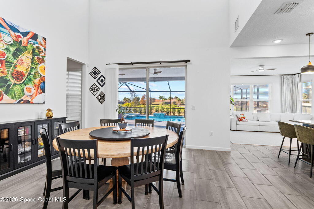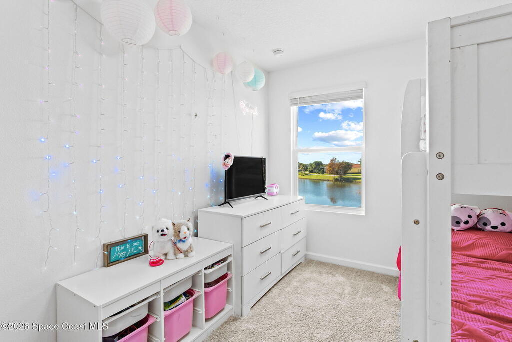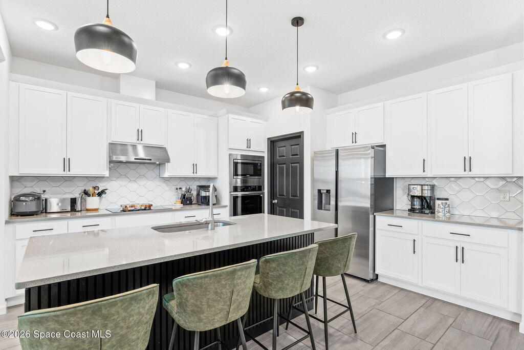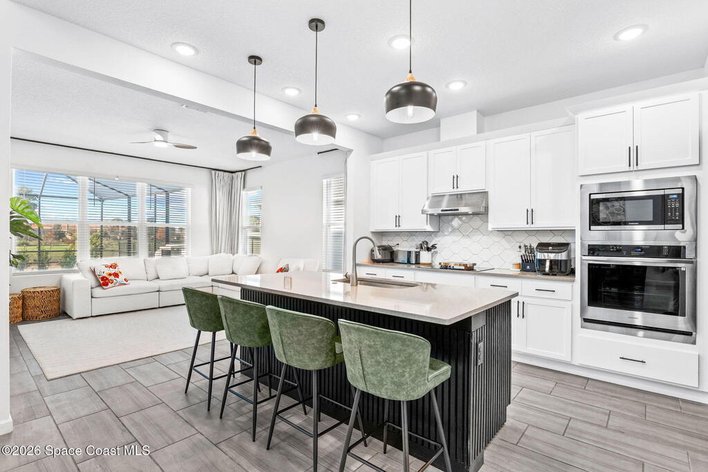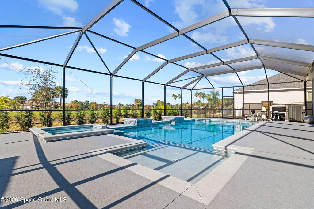 Built in 2024 with over $150, 000 in upgrades, this exceptional two-story home is located in the gated Courtyard at Waterstone community in Palm Bay. Offering nearly 2, 800 sq ft, this 5-bedroom, 3.5-bath residence features a 3-car garage, a private home office, and a spacious upstairs loft. The open-concept design showcases a gourmet kitchen with quartz countertops, oversized island, sleek white cabinetry, and designer lighting. Upgraded tile flows throughout the main living areas, while carpeted bedrooms provide added comfort. Custom accent walls throughout the home add a modern, upscale touch. Step outside to your private backyard retreat featuring a fully screened, heated pool and spa overlooking a serene lake and beautifully landscaped views. Conveniently located near the future Emerald Lakes master-planned development, this home combines modern construction, luxury upgrades, and long-term growth in a highly desirable location.