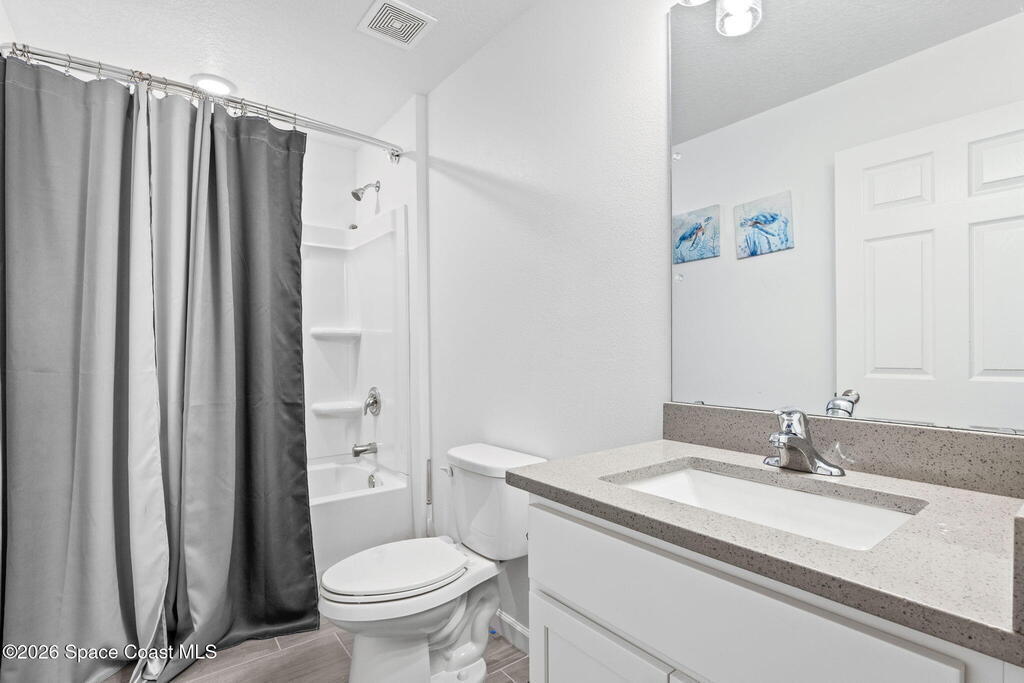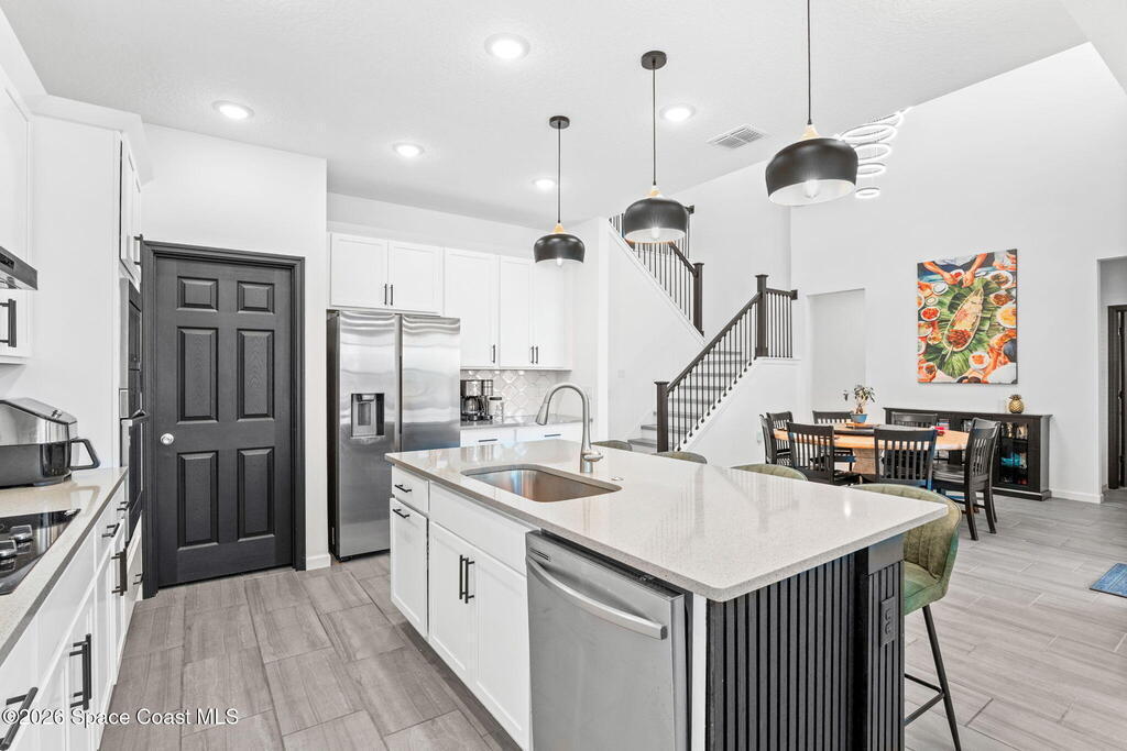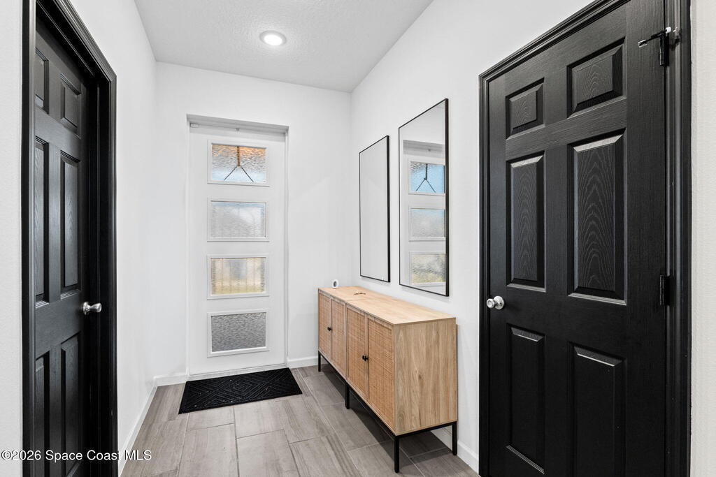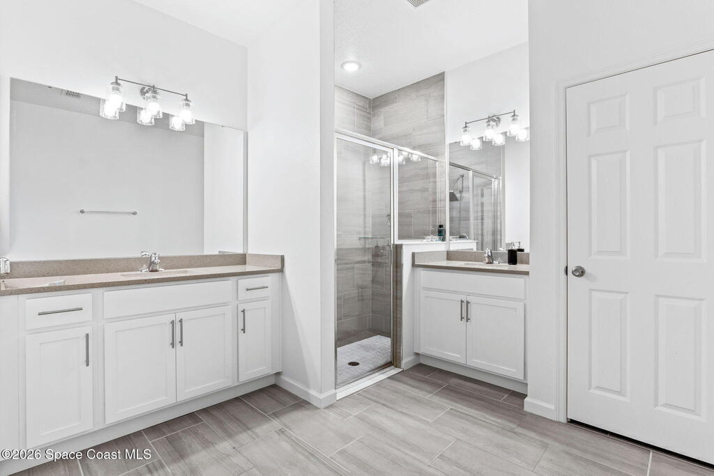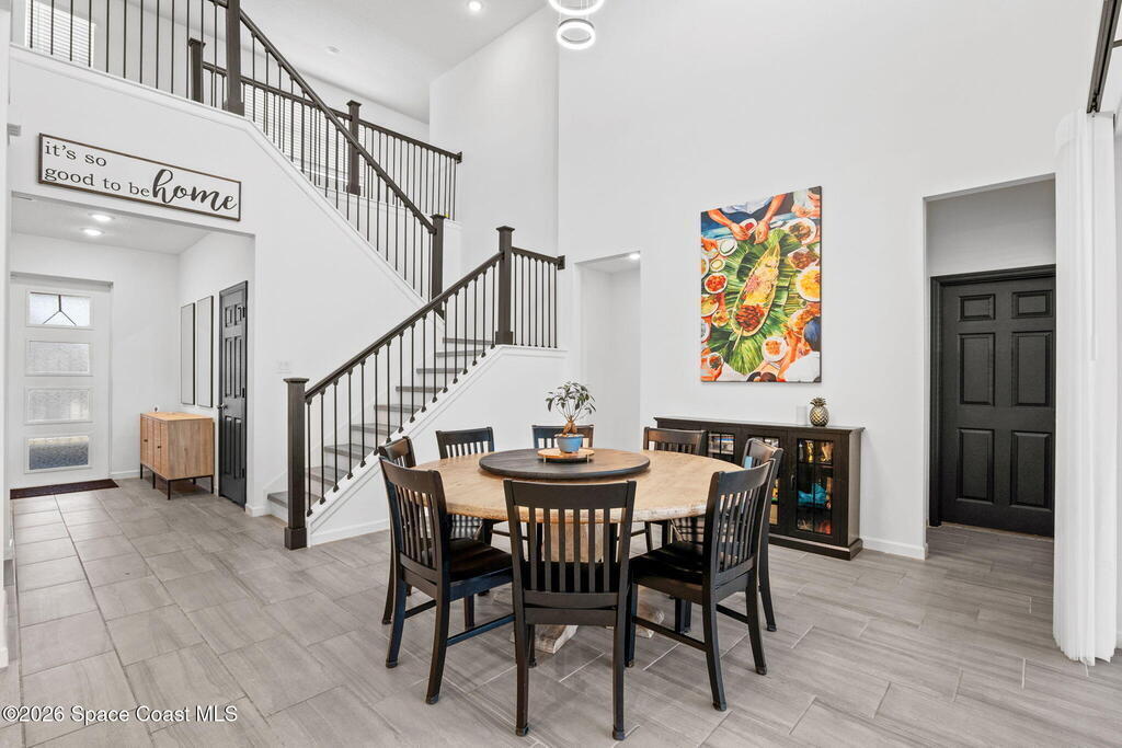Built in 2024 with over $150, 000 in upgrades, this exceptional two-story home is located in the gated Courtyard at Waterstone community in Palm Bay. Offering nearly 2, 800 sq ft, this 5-bedroom, 3.5-bath residence features a 3-car garage, a private home office, and a spacious upstairs loft. The open-concept design showcases a gourmet kitchen with quartz countertops, oversized island, sleek white cabinetry, and designer lighting. Upgraded tile flows throughout the main living areas, while carpeted bedrooms provide added comfort. Custom accent walls throughout the home add a modern, upscale touch. Step outside to your private backyard retreat featuring a fully screened, heated pool and spa overlooking a serene lake and beautifully landscaped views. Conveniently located near the future Emerald Lakes master-planned development, this home combines modern construction, luxury upgrades, and long-term growth in a highly desirable location.