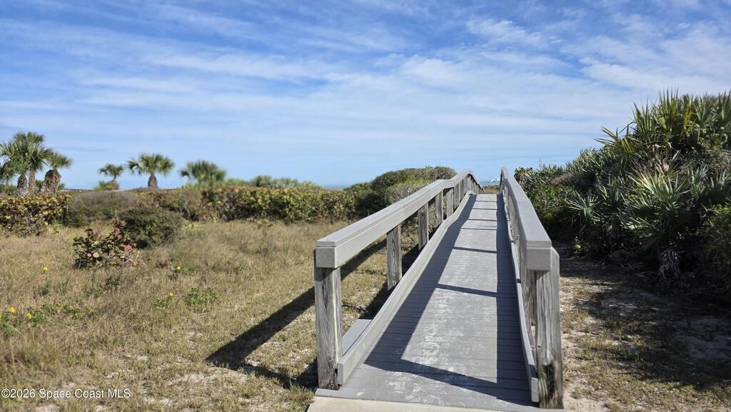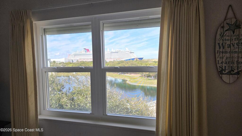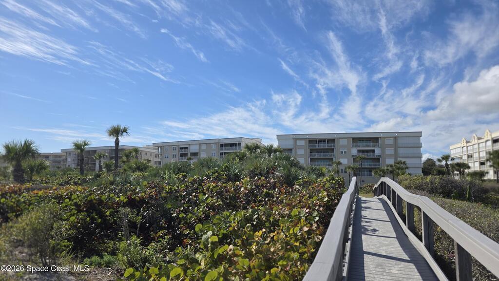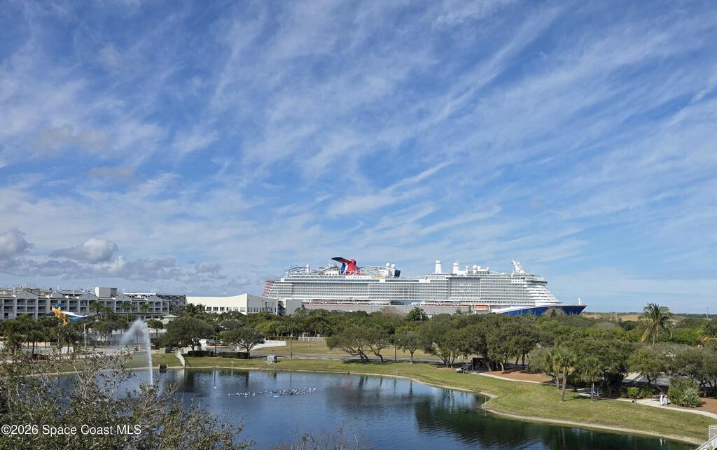 Wow!! Check out that view! Sit on the shaded rear balcony with a automatic rolldown shade and gaze over Port Canaveral. See all the cruise ships, rocket launches, sunrise and sunsets right from your lounge chair. You may even catch sight of a submarine! This beachfront community of Shorewood has a heated pool, hot tub, sauna, gym, community room with kitchen, outdoor bbqs, games & a library! This is a lovely 2 bed 2 bath 5th floor unit with a side beach view from the front walkway. Home has a large open layout, with washer/dryer in the unit. Home has a large kitchen and spacious bathrooms. Spend your afternoon playing pickleball, then run your car through the super convenient car wash on your way to the Port for dinner in one of the many local restaurants. Jetty park is super close by as well. No shortage of fun with this home! Come check it out today!
