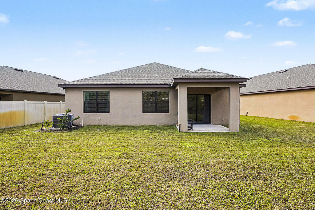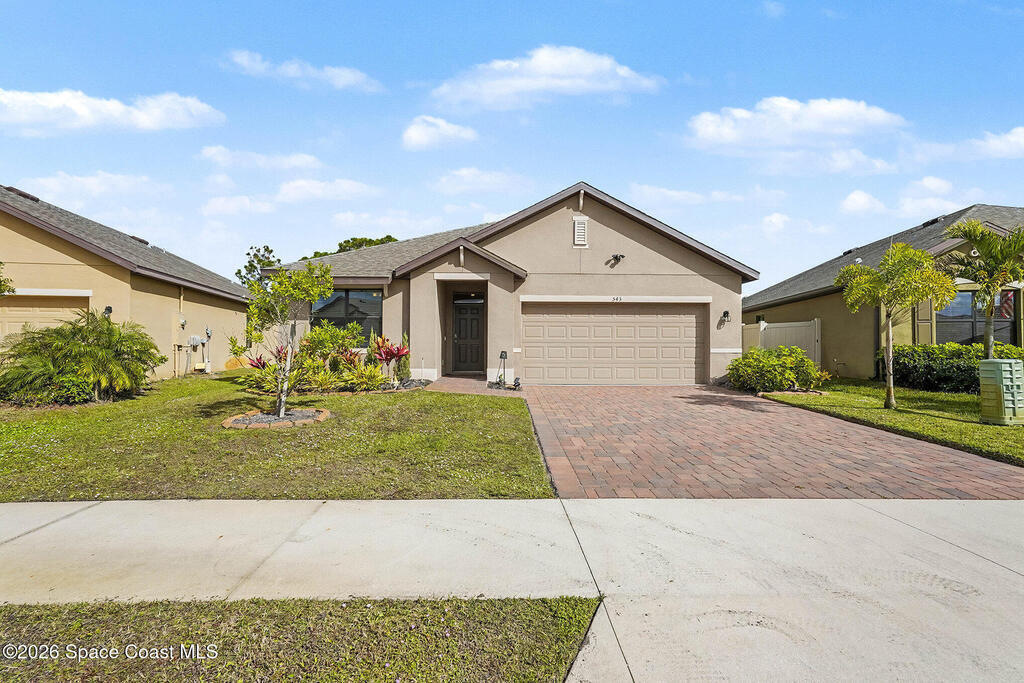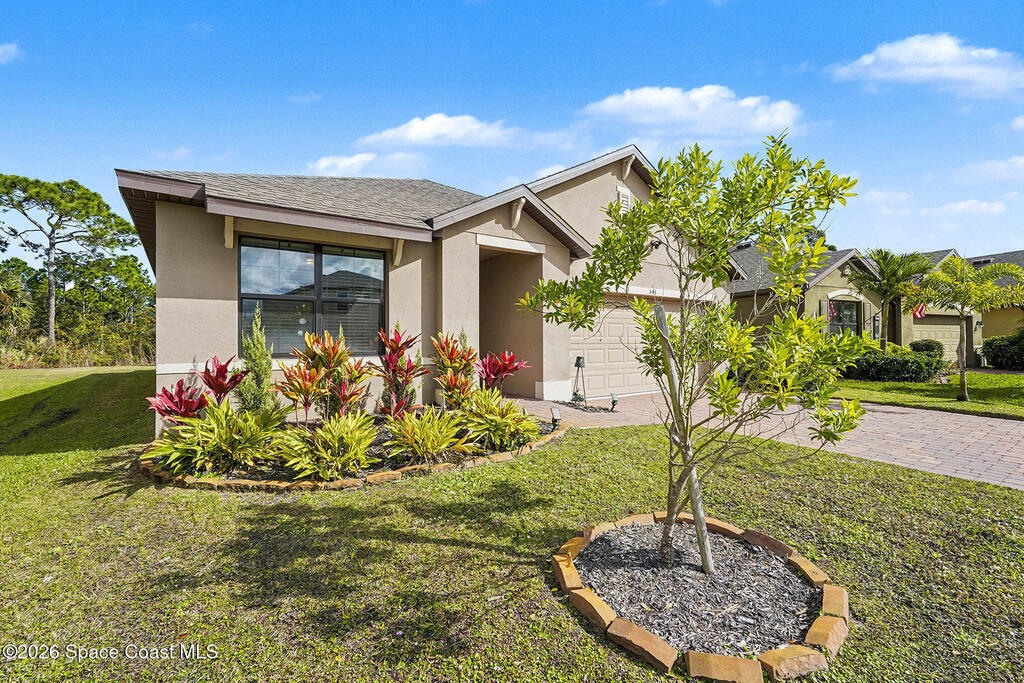 This 3 Bedroom 2 Bath home offers 1672 sq. ft. living space. The floor plan has a covered Lanai added for Extra shade on those long hot summer days. Located in a GATED Community within Bayside Lakes This home features granite countertops, Bright and White cabinets with crown molding, upgraded SS appliances including refrigerator and Window Blinds and ceramic tile added in all living areas except bedrooms. The Family room is very open to the Kitchen. 2 car garage, covered lanai, on a corner lot.The community will have its own pool, Cabana, and tot lot, and also gives access to the Bayside Lakes clubhouse and amenities.